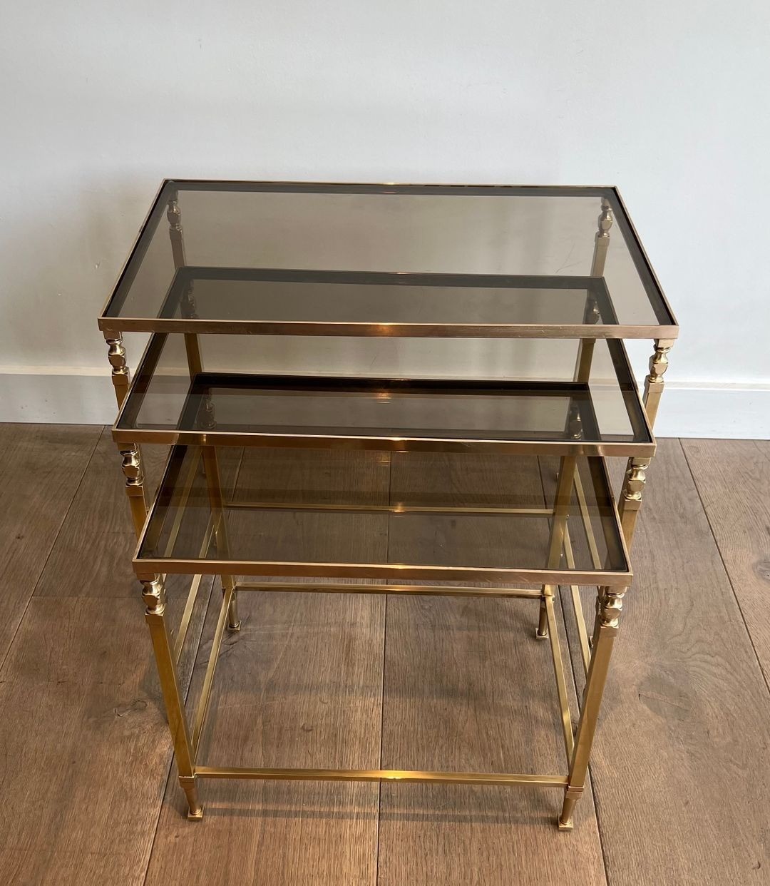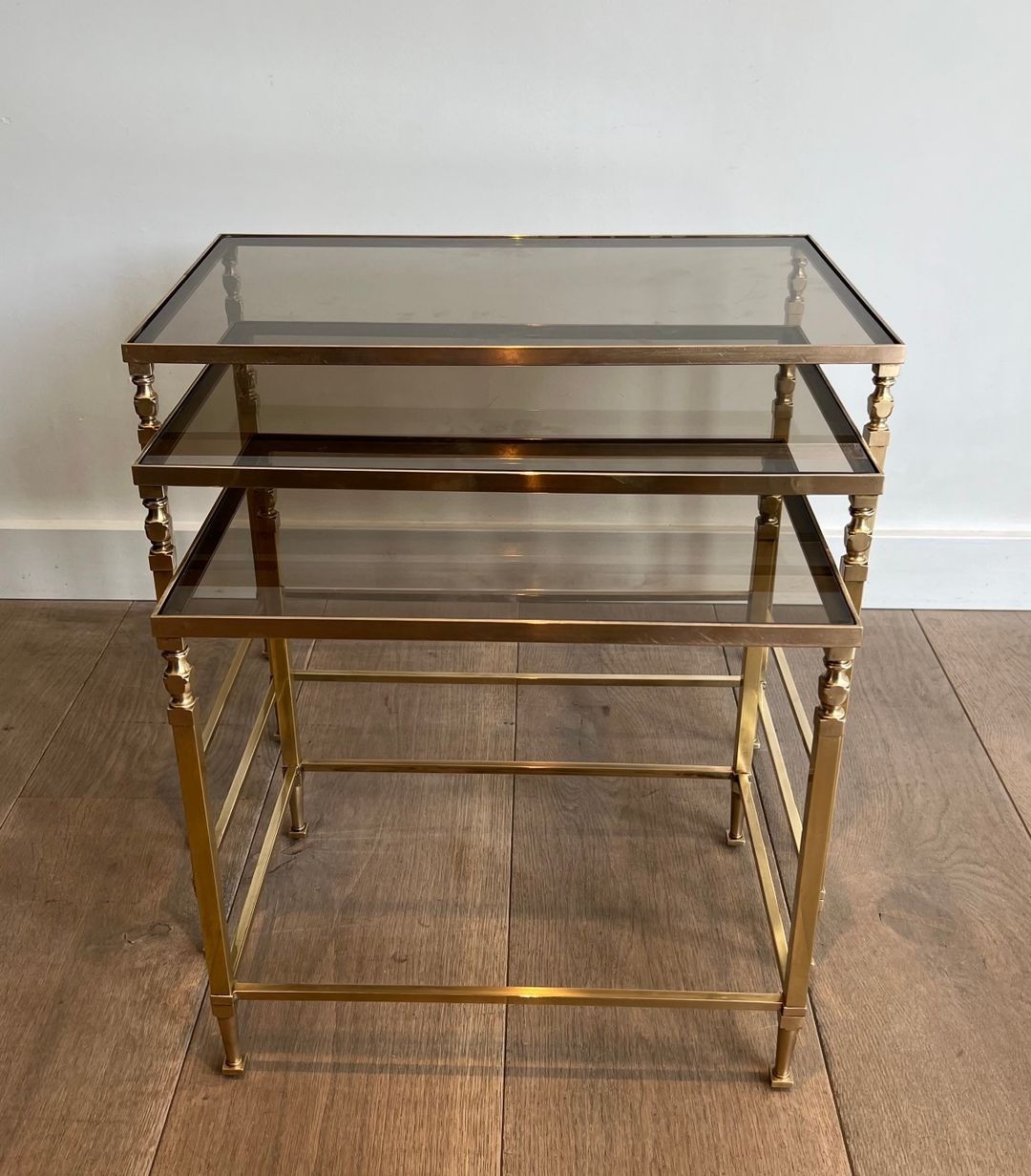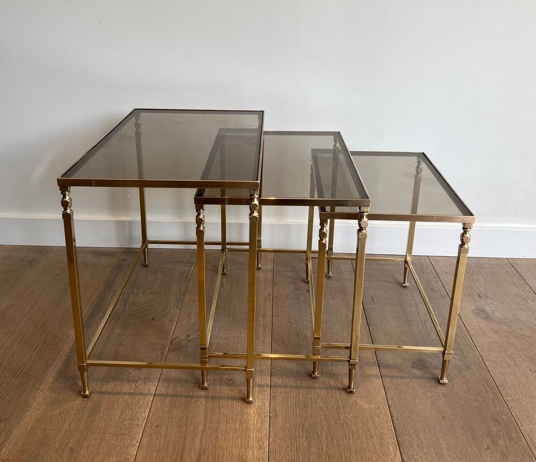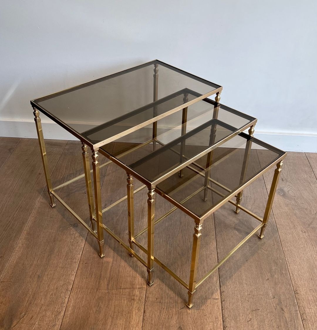 Maison Ramsay was among the most distinguished French decorating firms of the interwar period, celebrated for furniture that reinterpreted the neoclassical vocabulary with exceptional refinement and a confident use of brass and gilt metal. This set of nesting tables, dating to circa 1935, exemplifies the firm’s characteristic precision: each table constructed entirely in brass, with slender turned legs and crisp stretchers evoking the formal language of the Directoire and Empire periods.