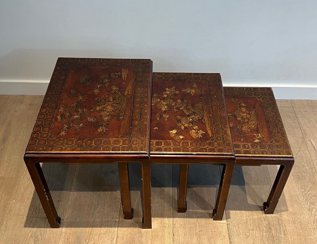 Set of Three Lacquered Nesting Tables with Chinoiserie Decoration, France circa 1940