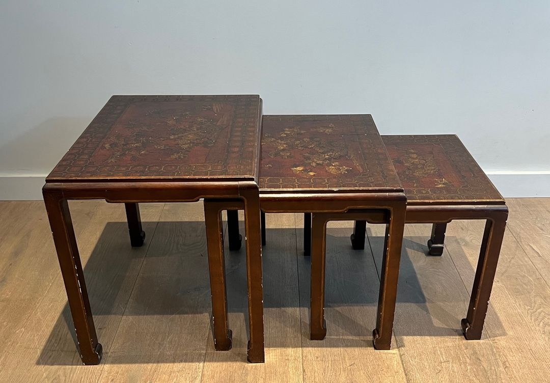 Set of three nesting tables in dark lacquered wood with gilt chinoiserie scenes depicting pagodas, trees and landscapes. Straight legs. French work, circa 1940. Largest: W. 54 × D. 40 × H. 45 cm.