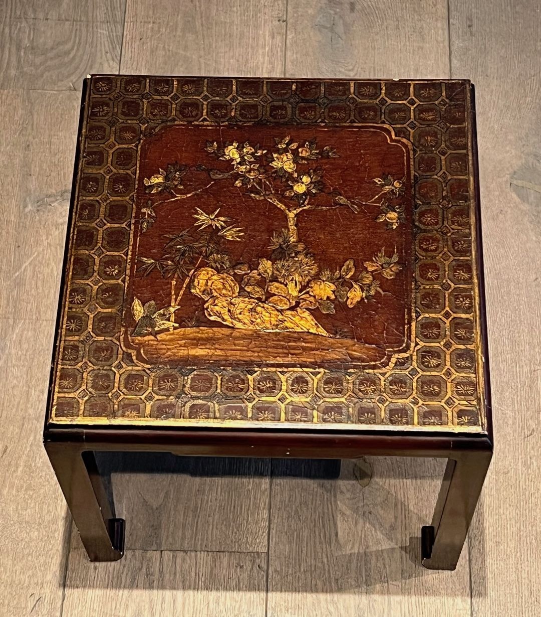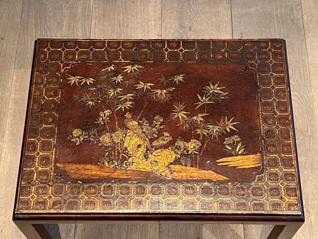 This set of three graduated nesting tables represents a refined example of the French enthusiasm for chinoiserie that flourished throughout the first half of the twentieth century. Worked in a deep bordeaux lacquer approaching black, the tabletops are adorned with exquisitely painted gilt scenes evoking the gardens and landscapes of imperial China — pagodas rising among weeping willows, birds in flight, and stylised floral motifs rendered with a confident brushwork that belies the European hand behind them.
