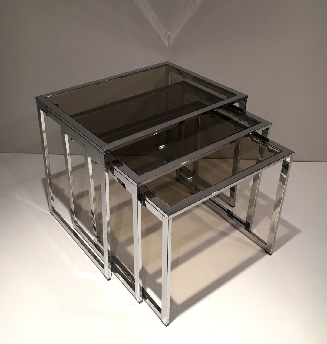 This distinguished set of three nesting tables offers a masterclass in the refinement of 1970s French modernism, combining high-quality chrome-plated steel craftsmanship with the period’s signature smoked glass to create an ensemble of considerable decorative impact. Each table is constructed with a distinctive architectural frame composed of multiple parallel chrome-plated steel rods grouped to form each leg and side panel — a treatment that gives the pieces an almost lattice-like sculptural presence while maintaining a clean, open silhouette.