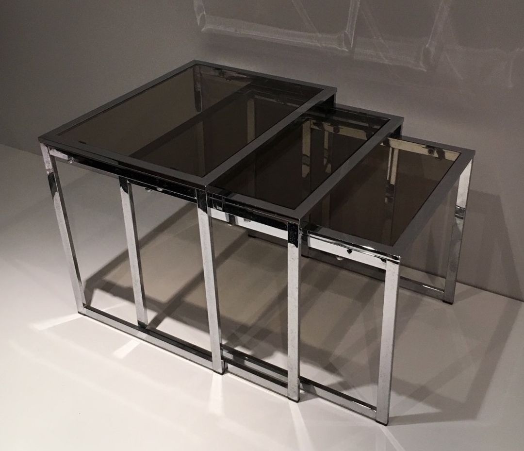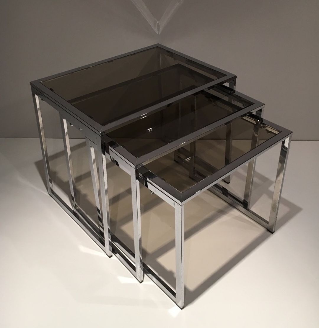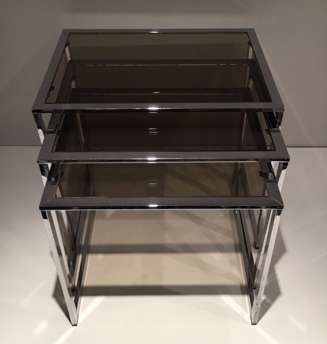 Set of Three Nesting Tables in Chrome and Smoked Glass, France circa 1970