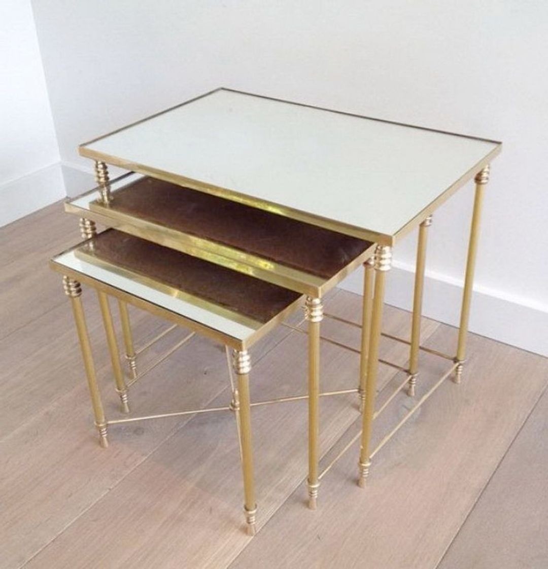 Each of the three tables is graduated in size, allowing the two smaller tables to nest below the largest when not in use — a practical arrangement that became fashionable in the early twentieth century and remains popular today. The mirror tops, set within their brass frames, contribute a note of glamour and light, doubling the reflections of whatever objects are placed upon them and lending the piece a quality reminiscent of the great boudoir furniture of the 1930s and 1940s.