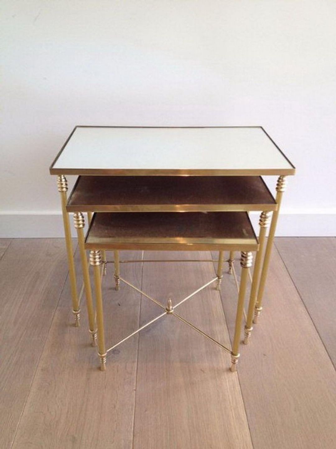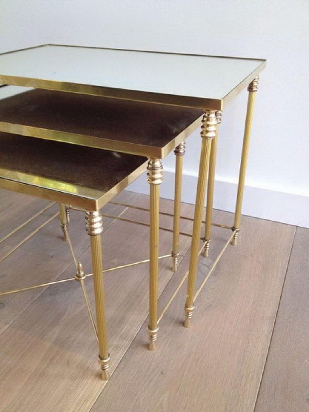 The neoclassical style — with its vocabulary of fluted columns, bead-and-reel mouldings, and architectural proportion — never truly left the French decorative arts, finding continuous expression across the nineteenth century and re-emerging with fresh energy in the interwar period. This set of three brass nesting tables belongs to that tradition: the turned and fluted legs, the decorative stretcher, and the precisely crafted brass gallery framing each mirror top all draw on the Louis XVI idiom while presenting it through the lens of 1940s French craftsmanship.