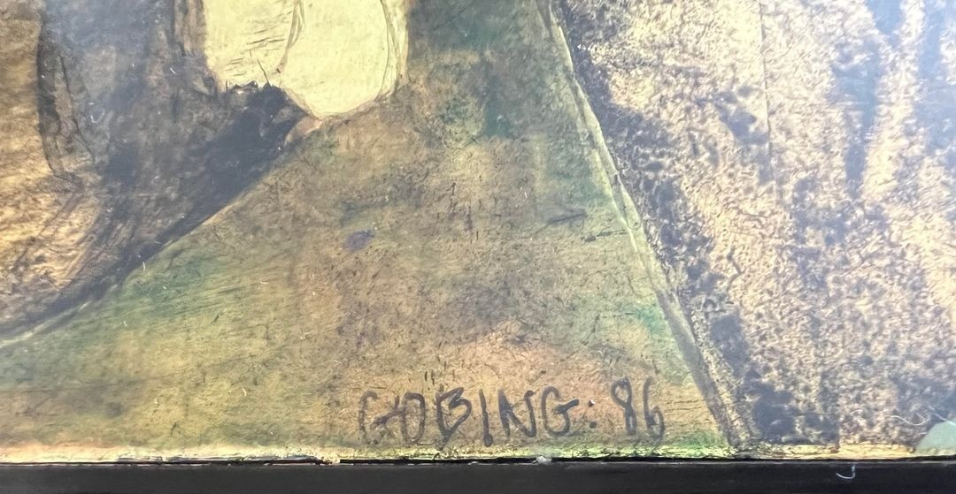 The choice of lacquered panel as support lends the work an unusual material presence and a distinctive luminosity. Unlike canvas, the lacquer surface imparts a particular brilliance and depth to the brushwork, contributing to the tonal richness that distinguishes the piece from a conventional painting of the same subject. The work is signed “Gobing” and dated 1986, placing it within the tradition of post-war French figurative painting at a moment when the legacies of Braque and Léger were still actively informing independent painters of the period.