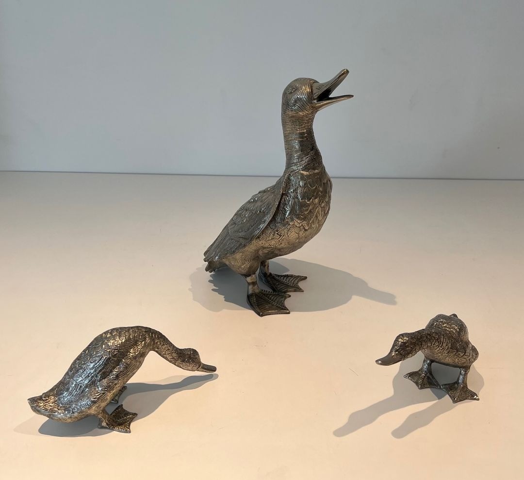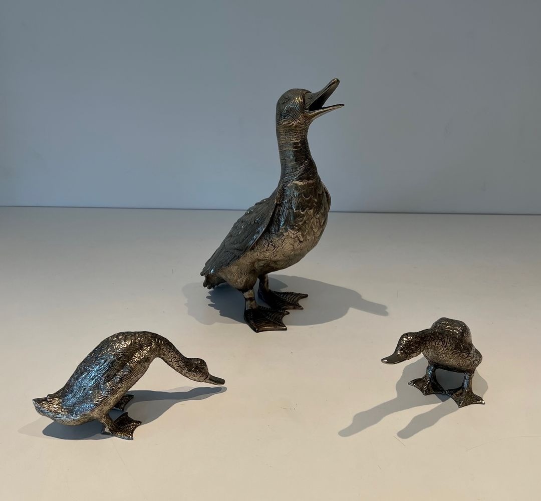 Set of Three Finely Chiselled Silvered Bronze Ducks, French Work, circa 1970