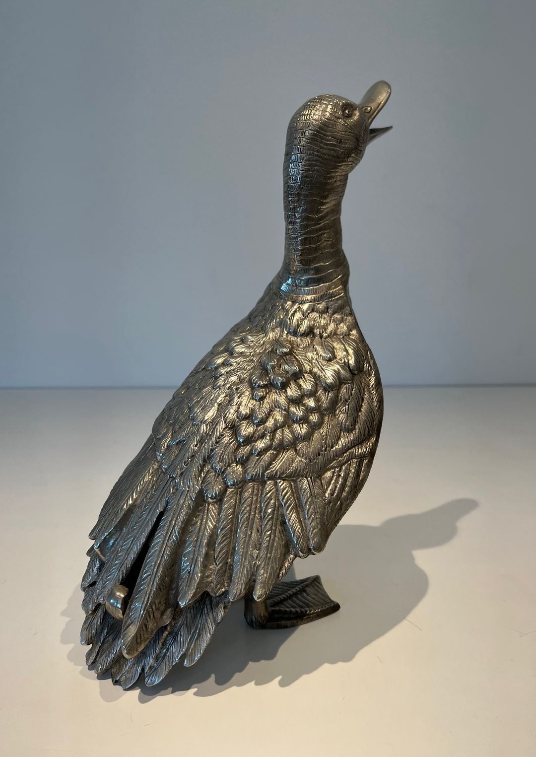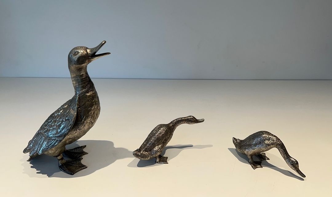 Superb suite of three silvered bronze ducks in graduated sizes, each finely chiselled with exceptional feather detail and rendered in a different animated pose. French work, circa 1970. Each duck can be sold separately. Largest: W. 40 × D. 16.5 × H. 34 cm.