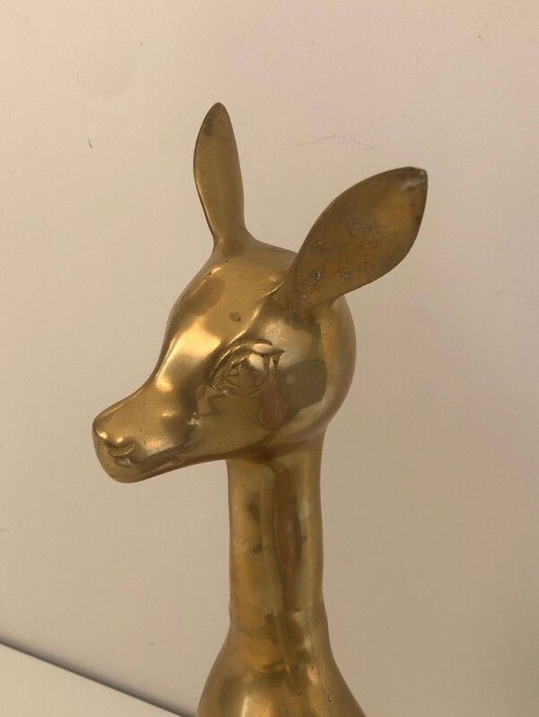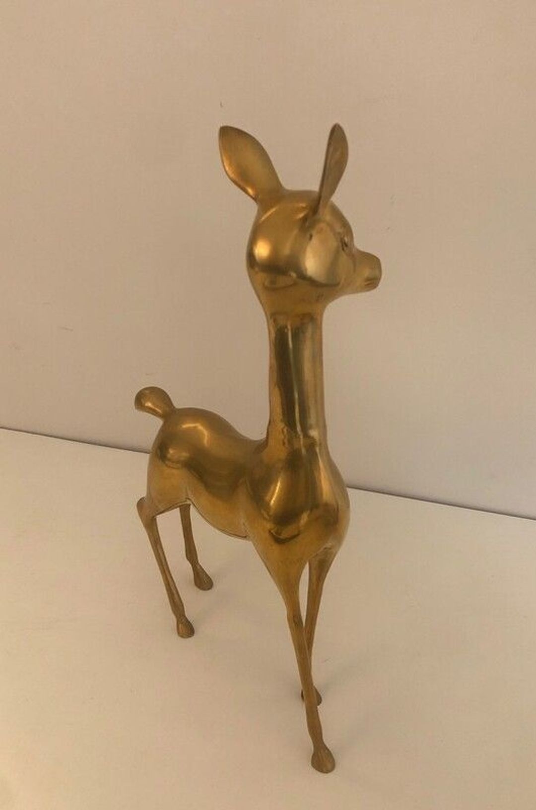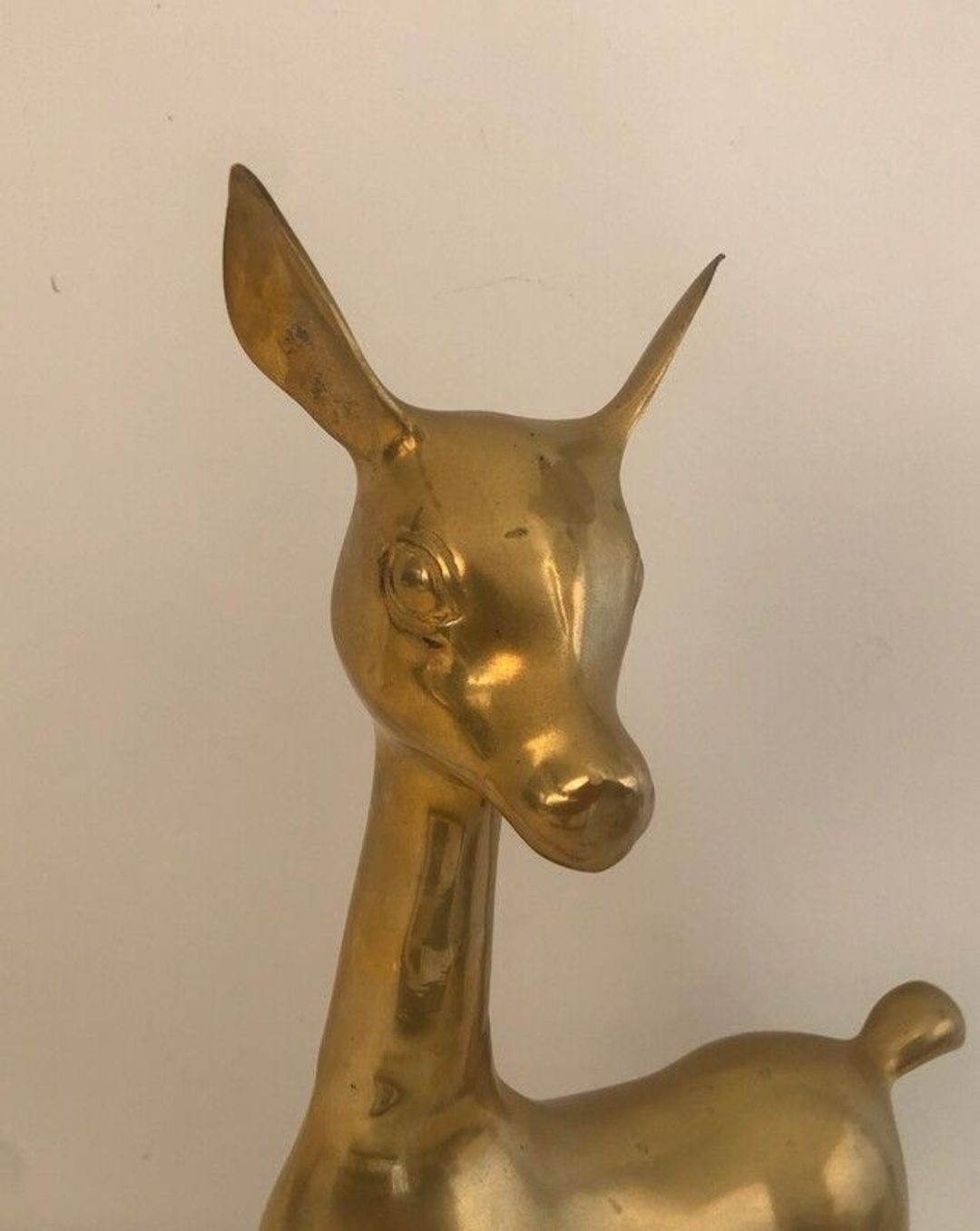 A decorative polished brass sculpture of a standing doe, the figure rendered with the confident economy of means that characterises mid-century French decorative animalier work at its best. The animal stands in an alert posture, its long, slender legs planted firmly, the neck arching upward and the head raised with the instinctive attentiveness of a deer at rest but watchful. The large, slightly forward-canted ears—one of the most expressive features of the roe or fallow doe—are carefully modelled and give the sculpture its characteristic air of gentle intelligence. Throughout, the modelling is schematic rather than anatomically exhaustive, the sculptor having chosen to suggest volume and living form through a minimum of surface detail, allowing the warm reflective surface of the polished brass to animate the figure with light.