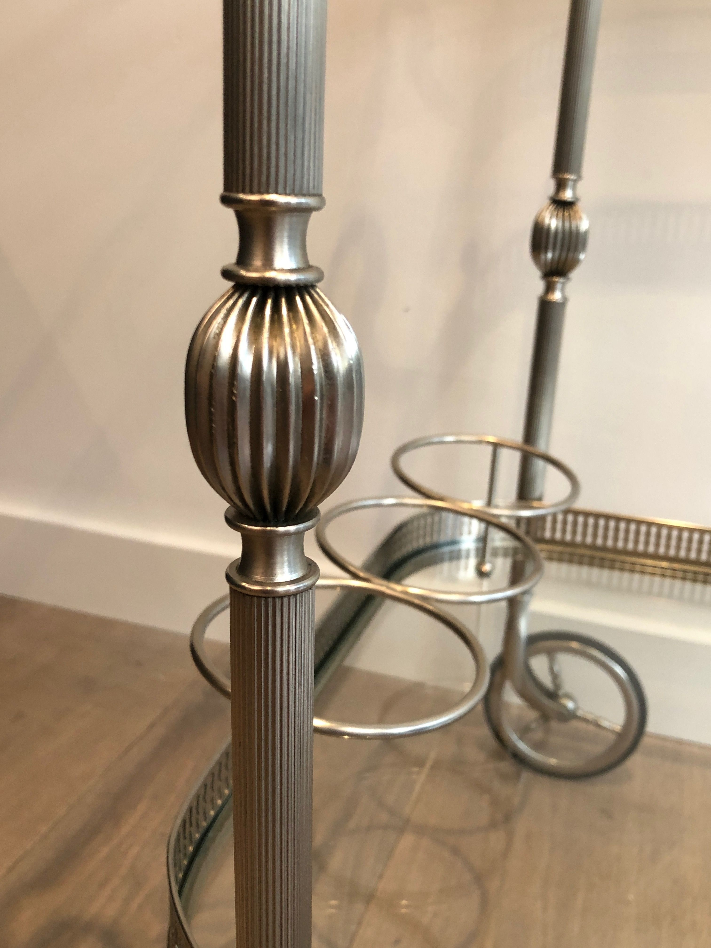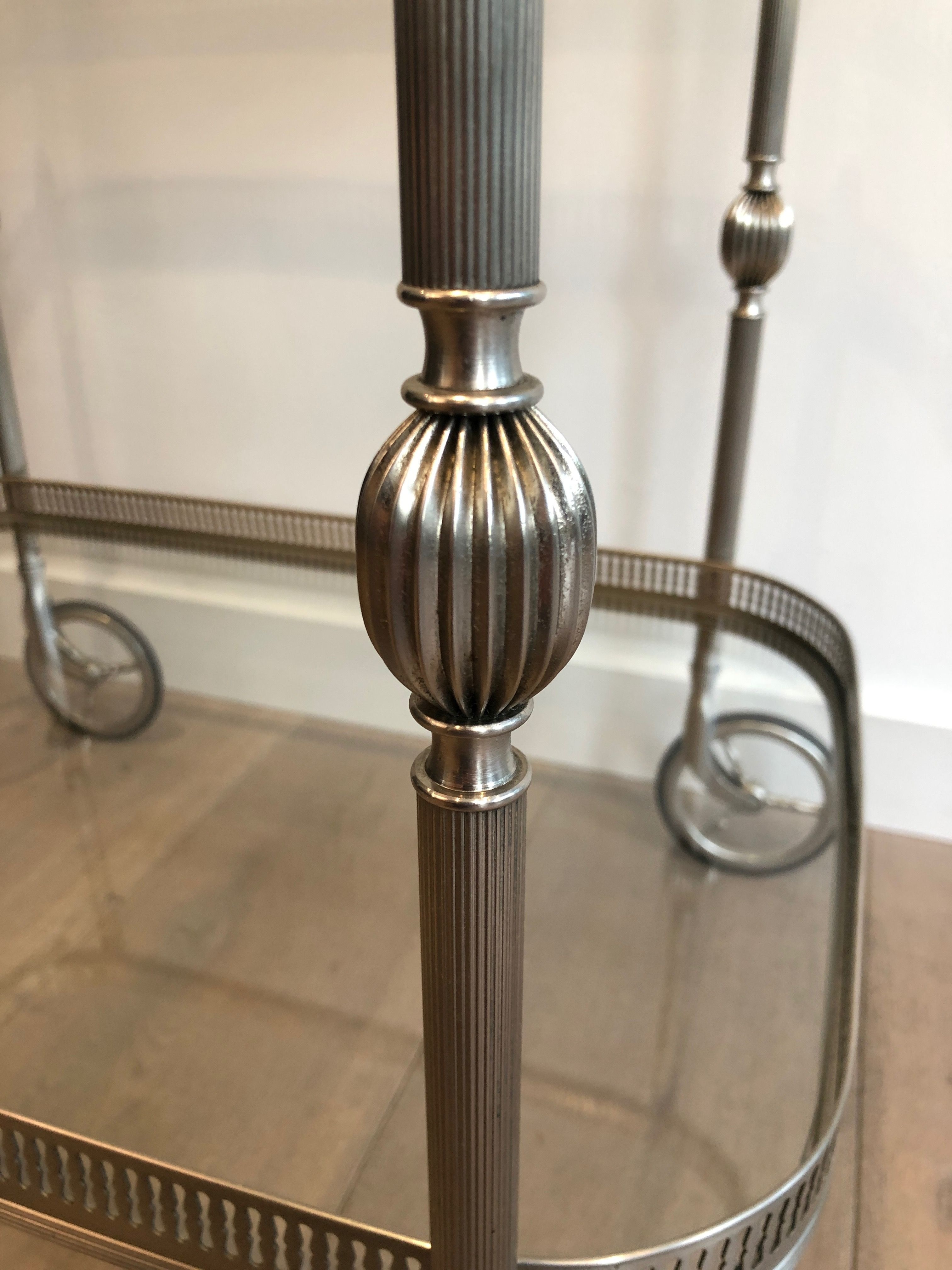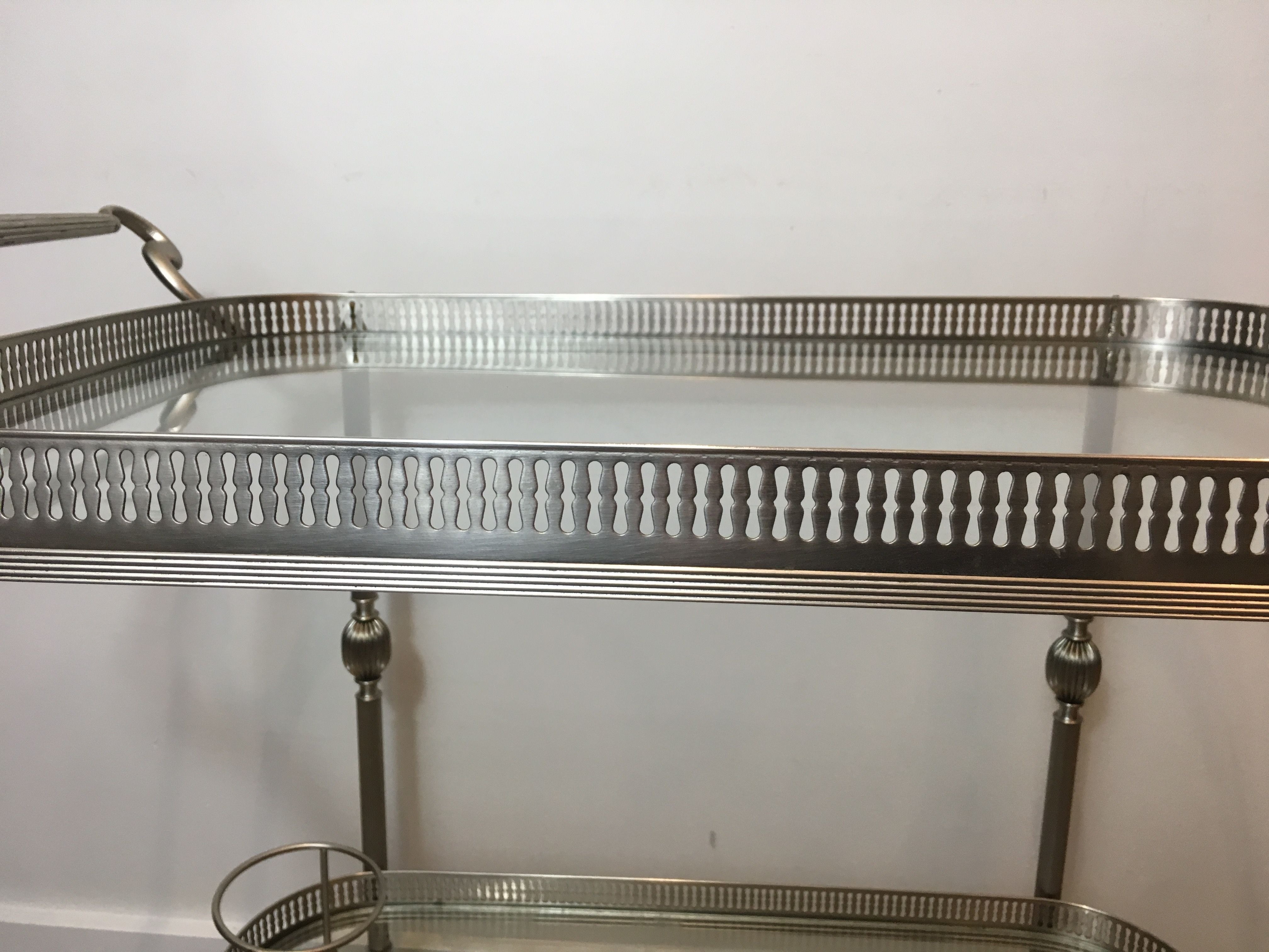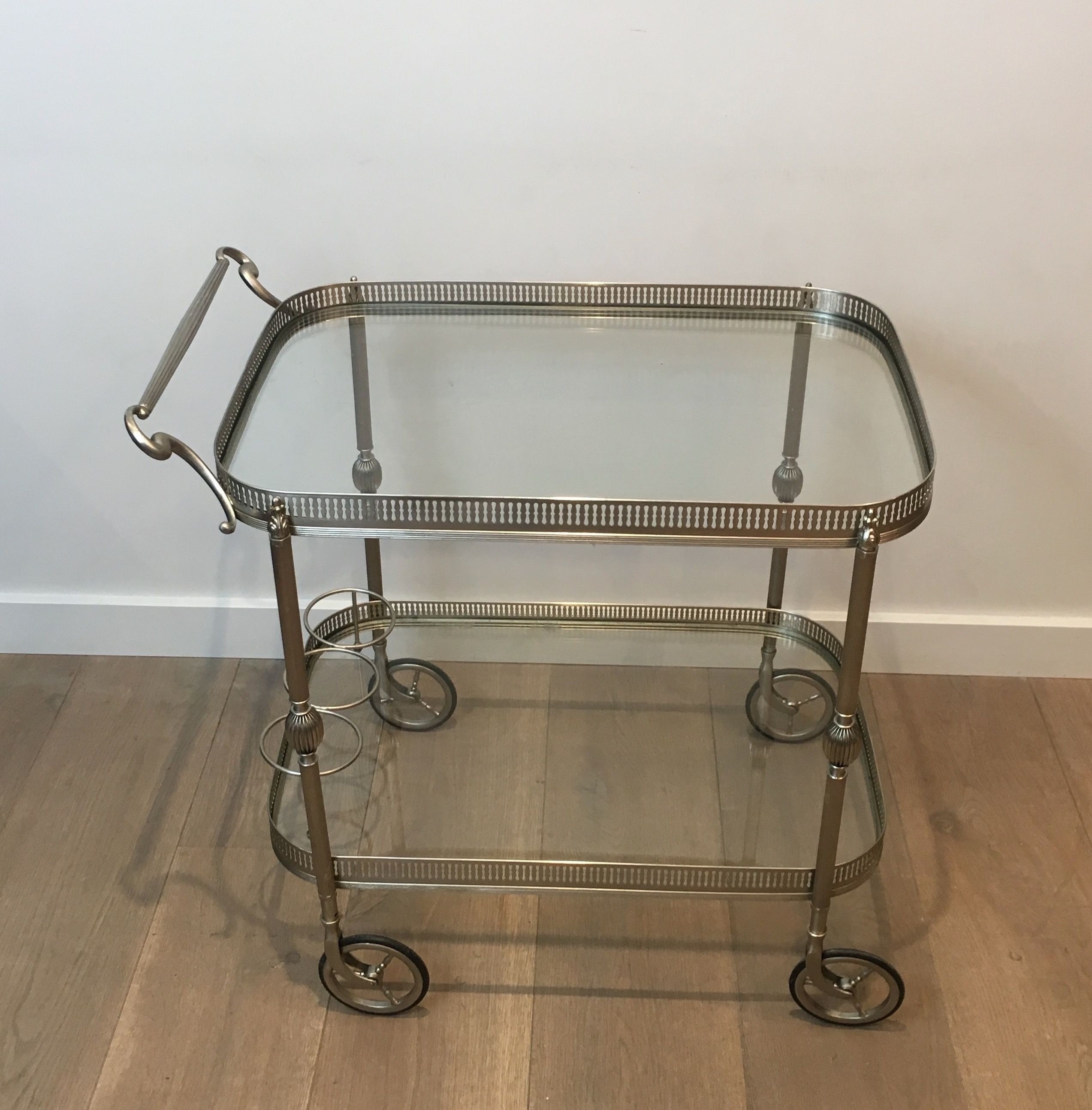 This supremely elegant drinks trolley is executed in silvered brass — a material that combines the structural strength of metal with the cool, lustrous beauty of silver plate — and styled in the refined Neoclassical vocabulary that defined the finest French interior design of the interwar period. The trolley moves on wheels for effortless circulation through a room, its two tiers offering generous surface for the display and service of drinks, decanters, and crystal. Every detail speaks of quality: the proportions perfectly balanced, the finish immaculate, the overall impression one of the most polished and assured elegance.