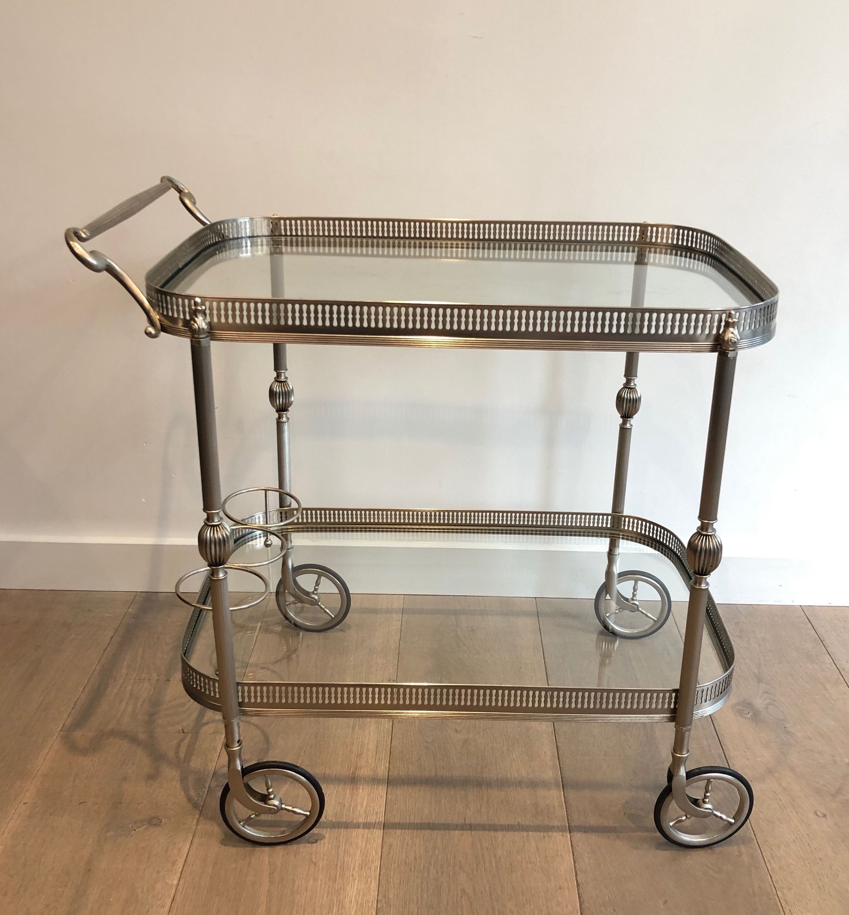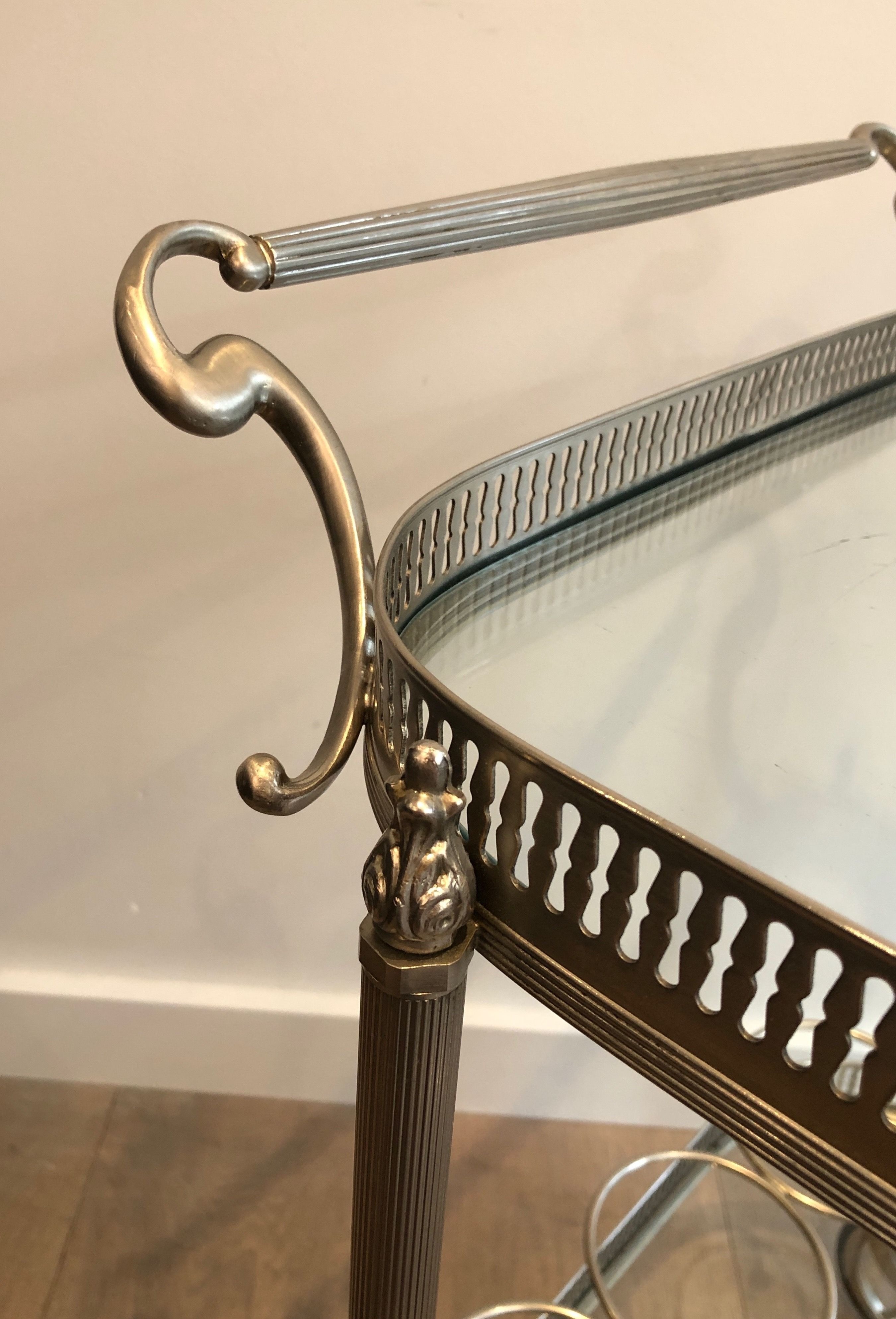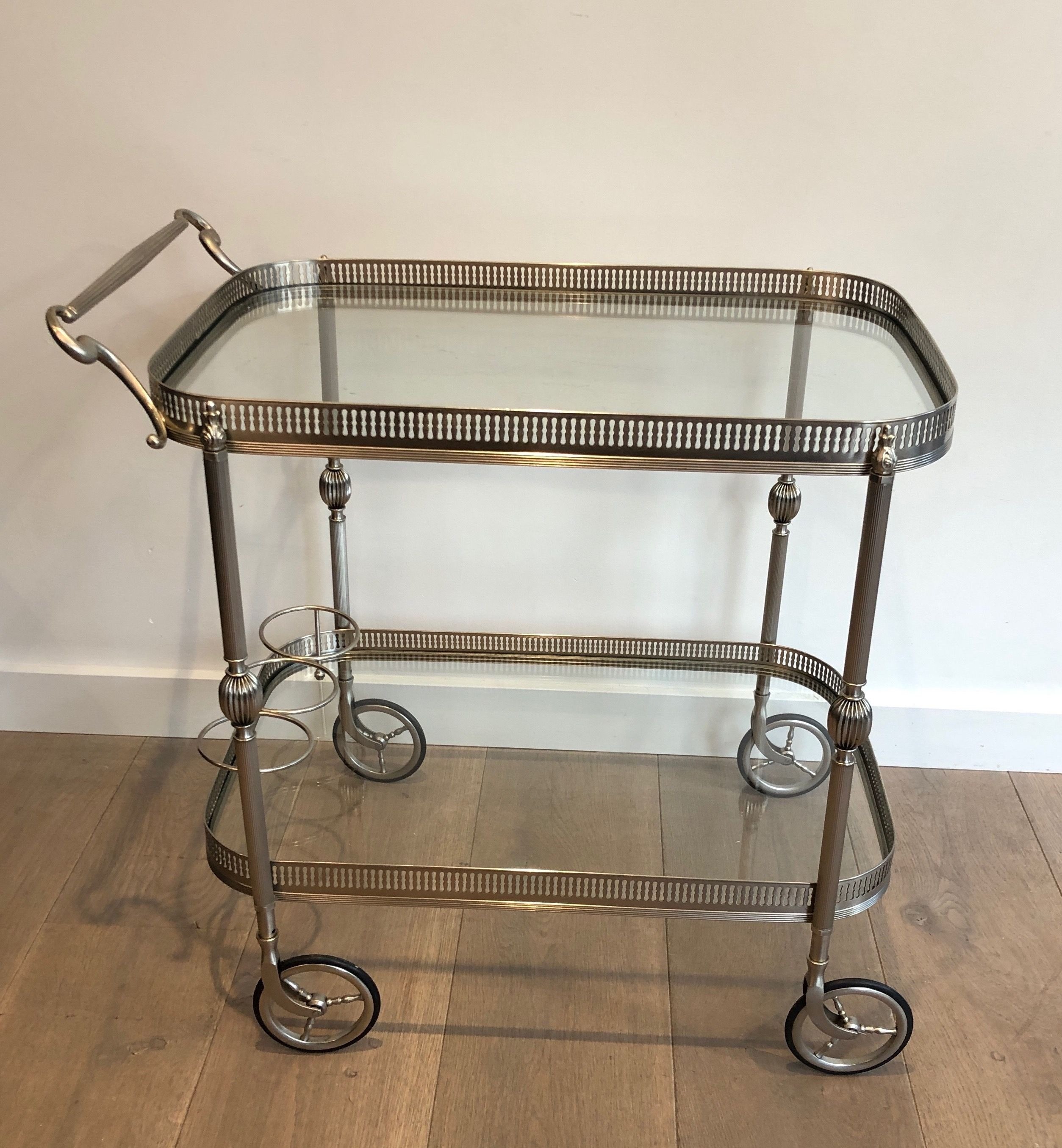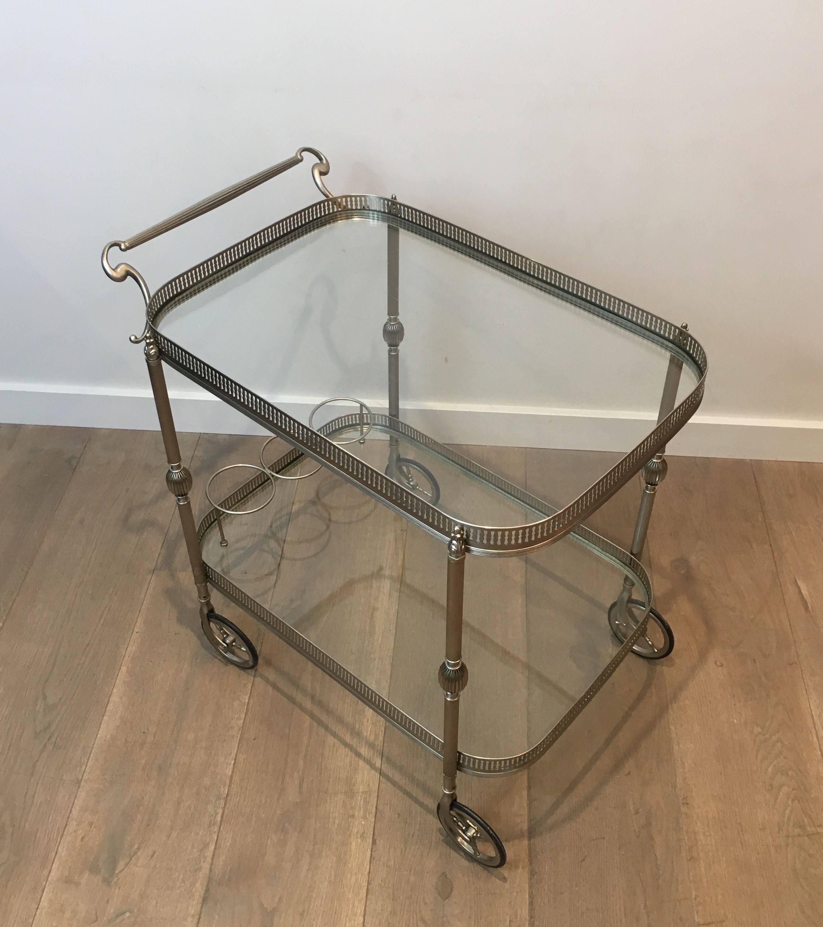 This supremely elegant drinks trolley is executed in silvered brass — a material that combines the structural strength of metal with the cool, lustrous beauty of silver plate — and styled in the refined Neoclassical vocabulary that defined the finest French interior design of the interwar period. The trolley moves on wheels for effortless circulation through a room, its two tiers offering generous surface for the display and service of drinks, decanters, and crystal. Every detail speaks of quality: the proportions perfectly balanced, the finish immaculate, the overall impression one of the most polished and assured elegance.