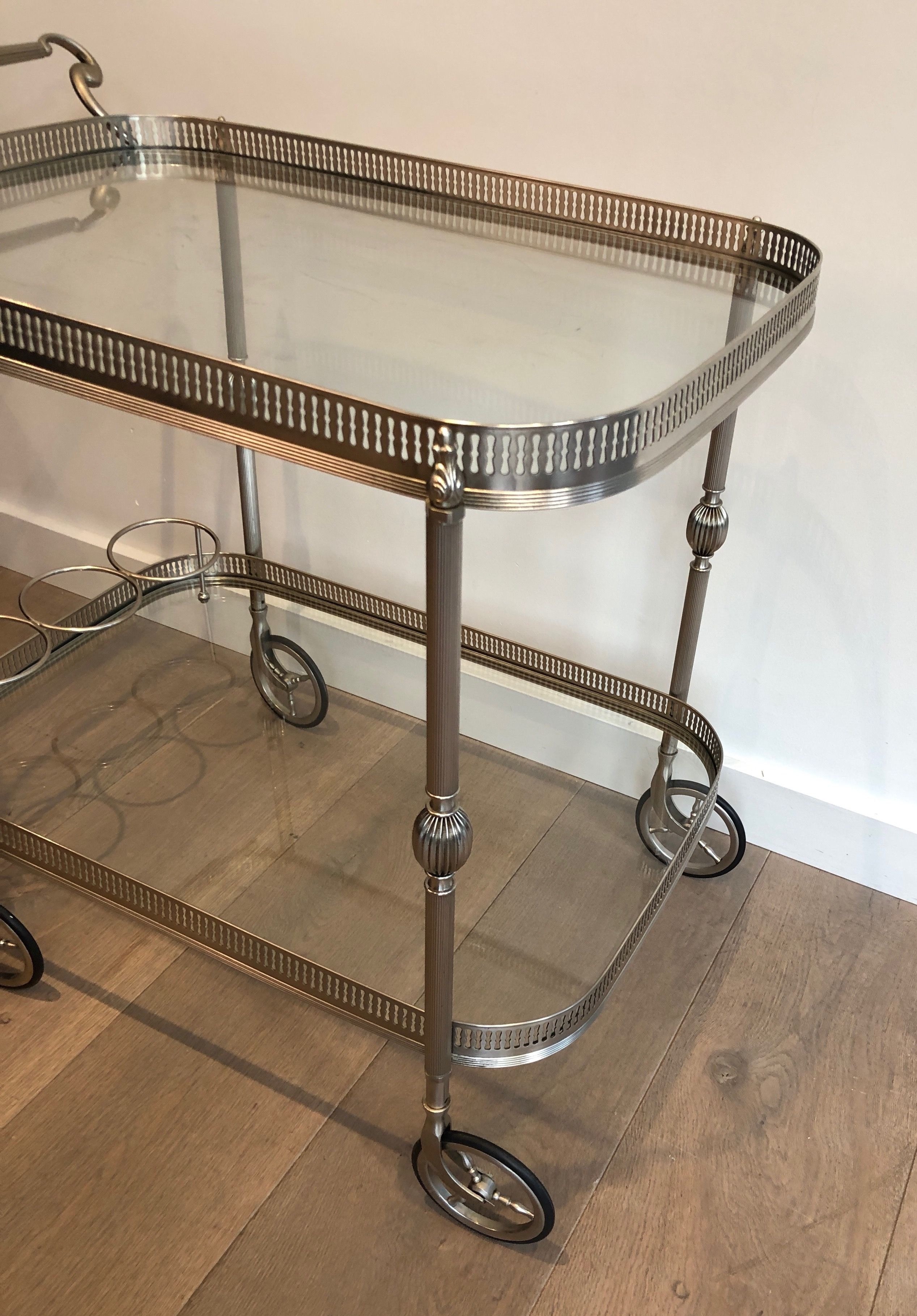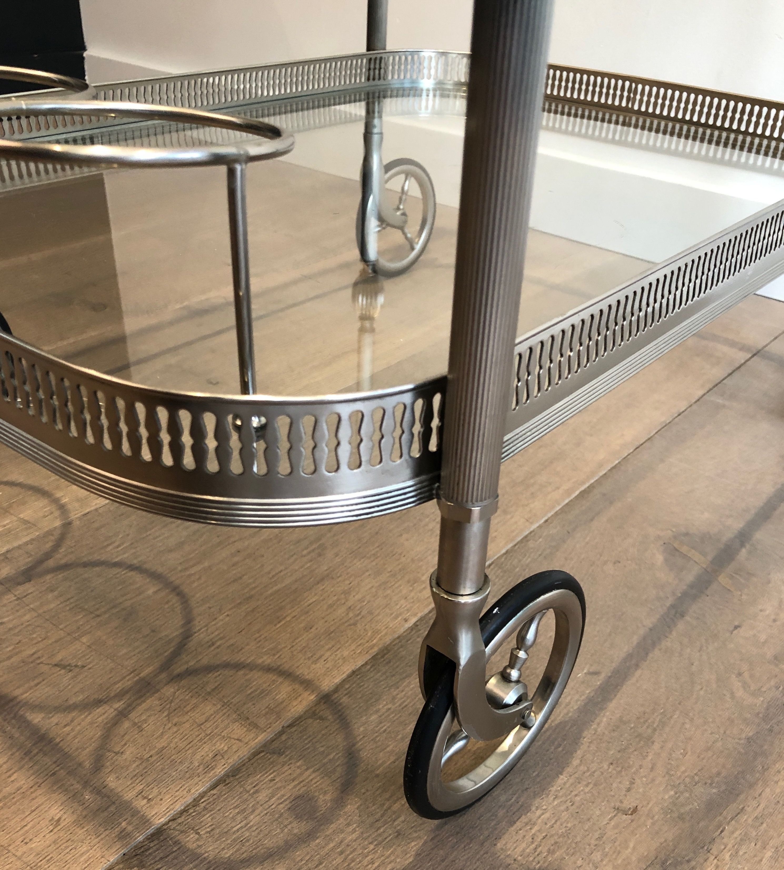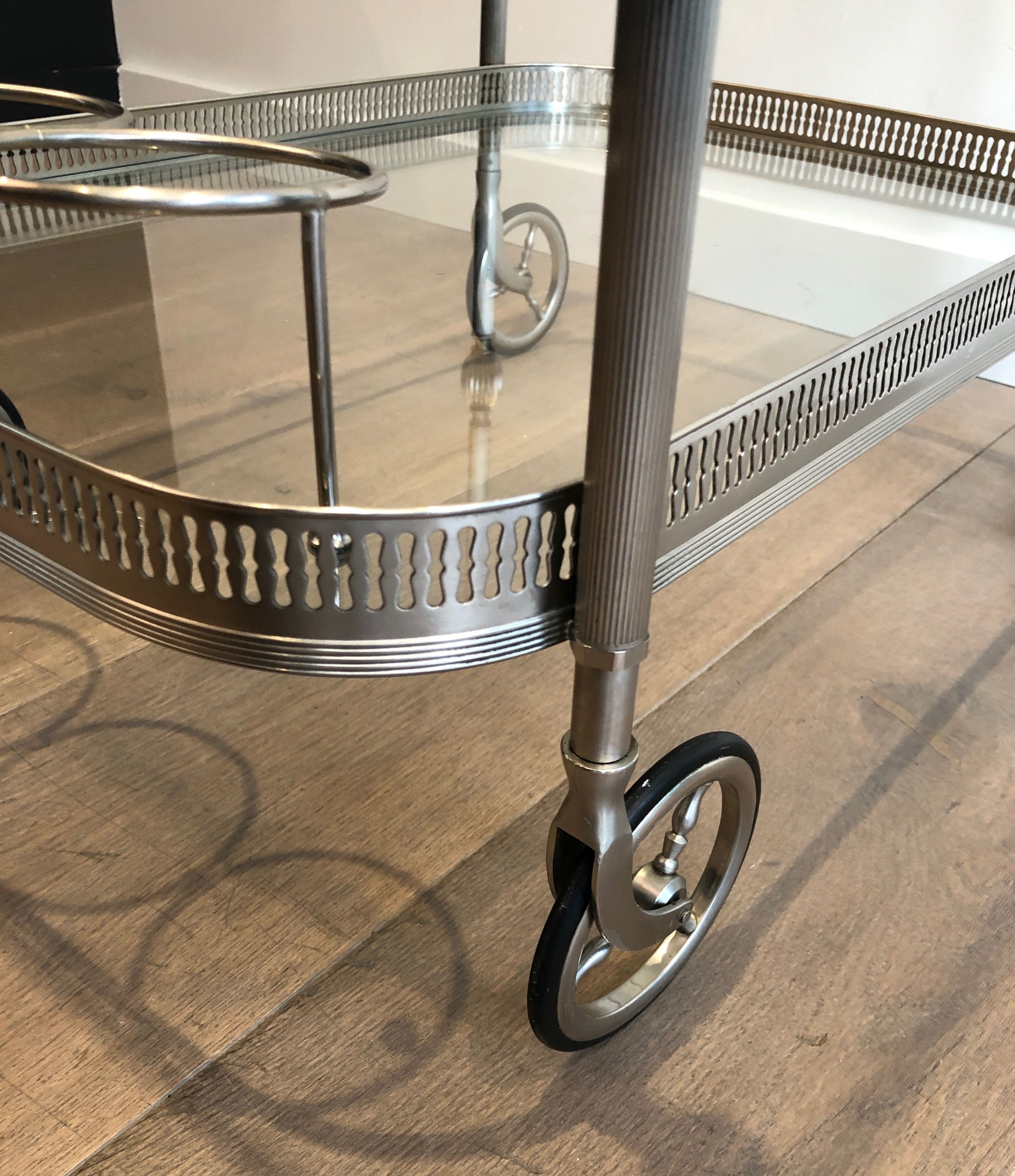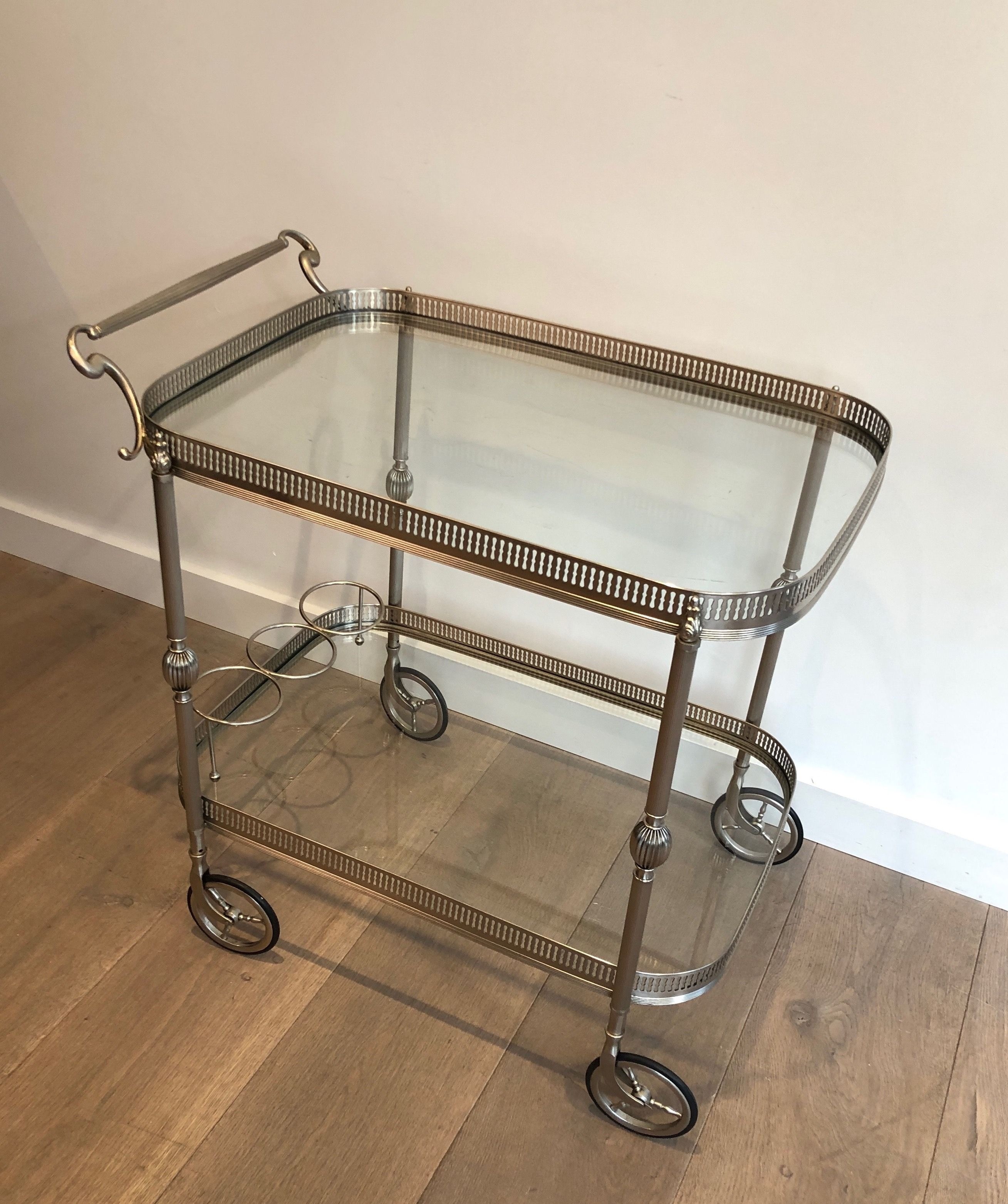 This supremely elegant drinks trolley is executed in silvered brass — a material that combines the structural strength of metal with the cool, lustrous beauty of silver plate — and styled in the refined Neoclassical vocabulary that defined the finest French interior design of the interwar period. The trolley moves on wheels for effortless circulation through a room, its two tiers offering generous surface for the display and service of drinks, decanters, and crystal. Every detail speaks of quality: the proportions perfectly balanced, the finish immaculate, the overall impression one of the most polished and assured elegance.