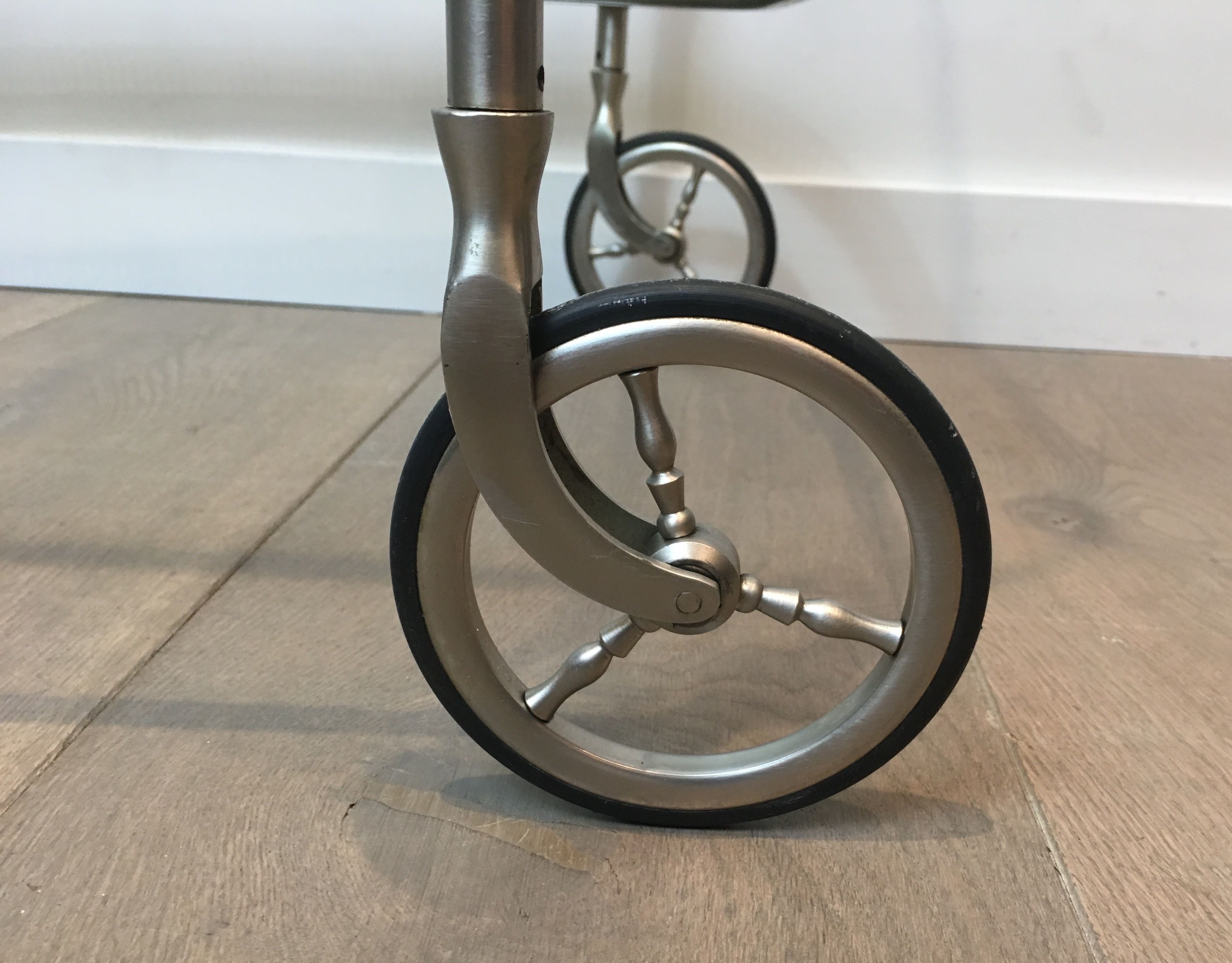 A drinks trolley in silvered brass is one of the most evocative objects of a certain era of French civilisation — the era of the pre-dinner cocktail, the afternoon tea, the table for drinks carefully composed in a room full of flowers and friends. This one, with its Neoclassical purity of line and luminous silvered surface, would have graced the salon of a Parisian hôtel particulier or a grand country house with equal distinction. Today, it brings that same note of considered luxury to any interior fortunate enough to receive it.
