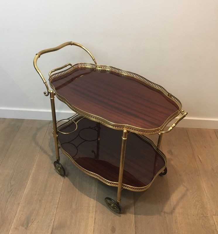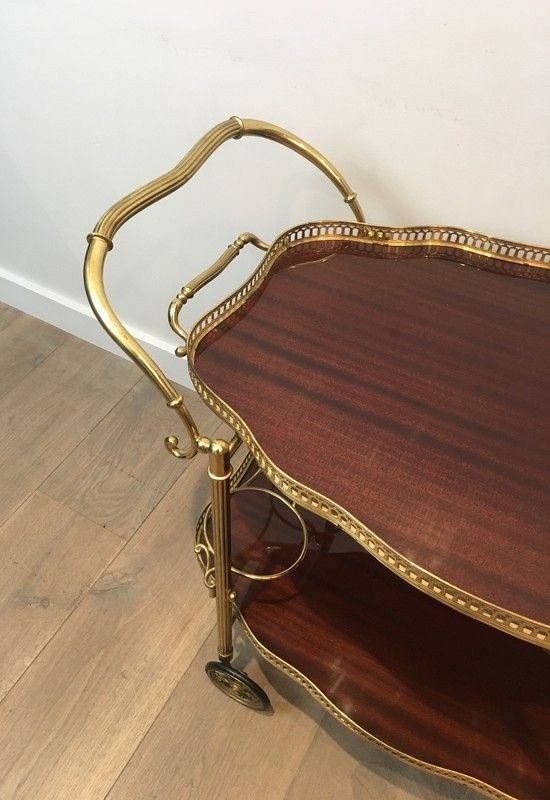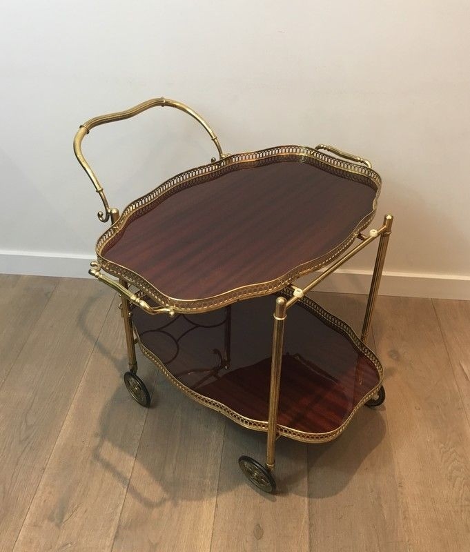 This distinguished drinks trolley is constructed from a harmonious pairing of mahogany and brass — two materials that together evoke the refined craftsmanship of the French decorative arts tradition. The piece stands on elegant wheels that allow it to be moved with ease through a room, while two removable trays lend the piece both practicality and grace. The joinery is precise, the proportions perfectly balanced: hallmarks of skilled French atelier work from the interwar period, when the ébéniste's craft was still governed by the rigour of the guild tradition.