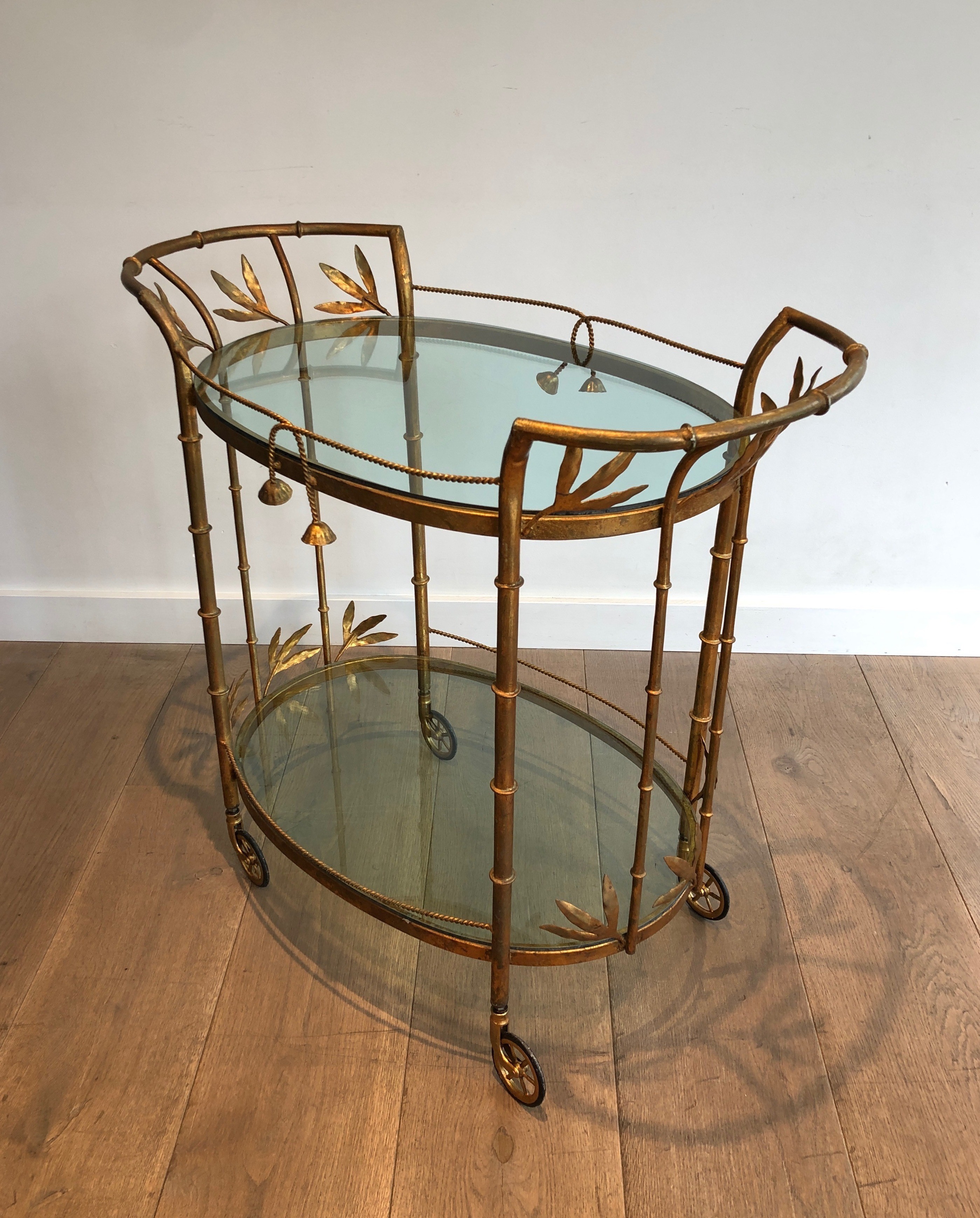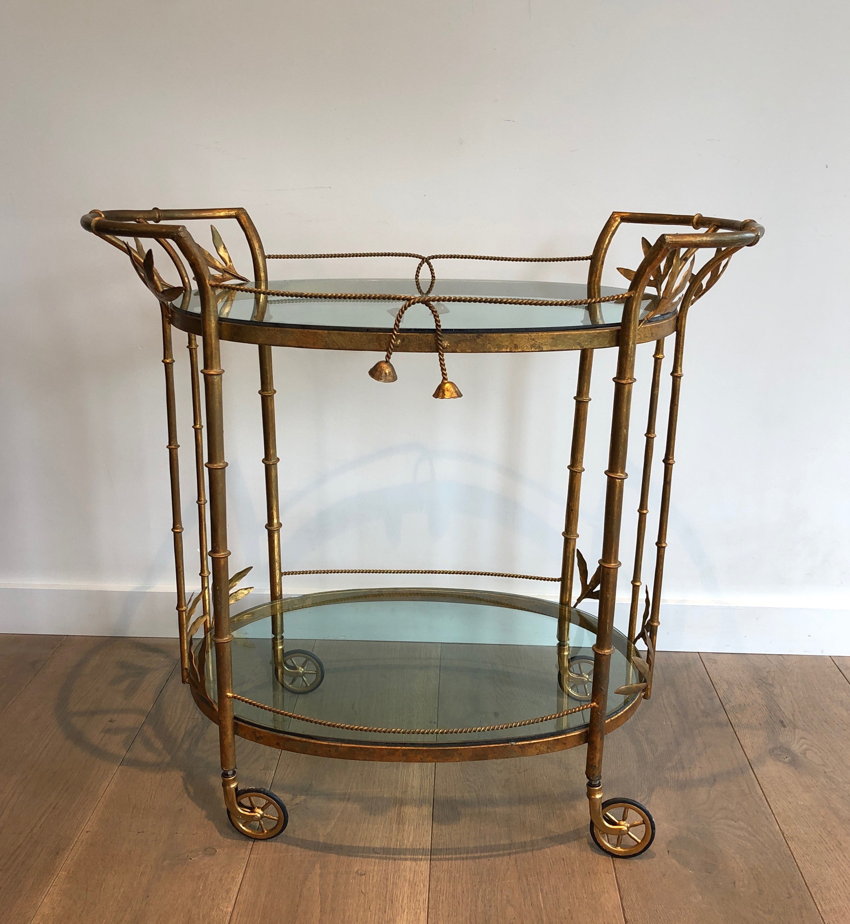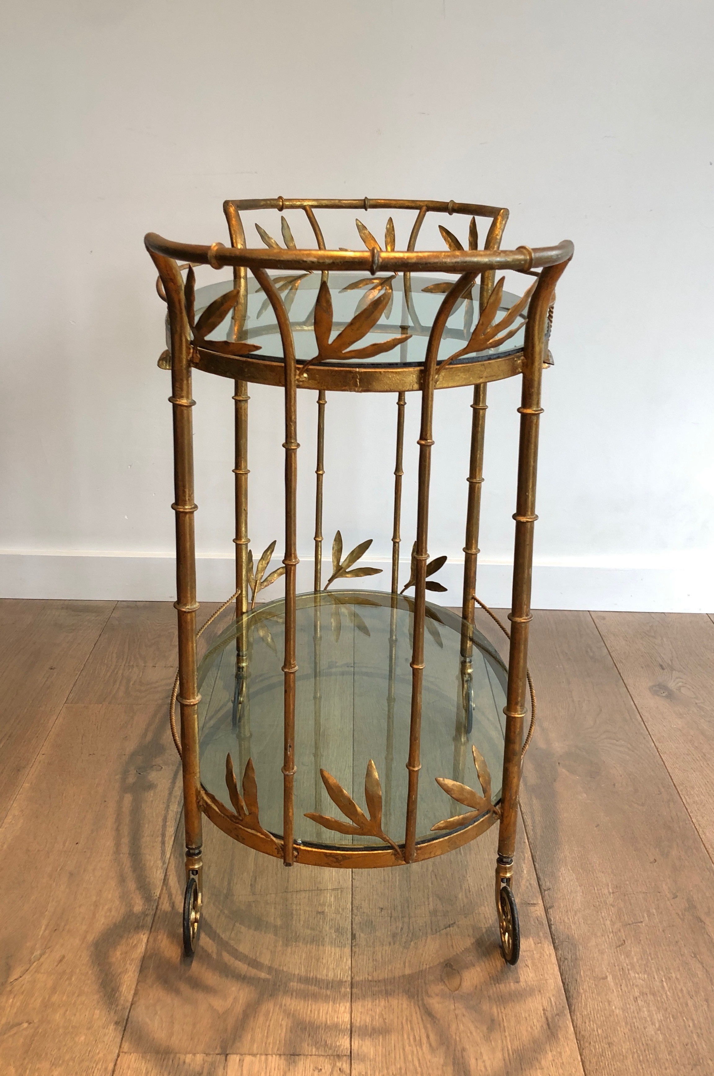 This exquisite drinks trolley is constructed in gilt metal with simulated bamboo detailing on its legs and frame, presenting a composition of elegant restraint and sophisticated luxury. The faux-bamboo form — here rendered in richly gilded metal — was one of the defining motifs of Parisian decorative arts in the 1960s and 1970s, prized for its capacity to evoke exotic refinement within a Neoclassical or Chinoiserie framework. The piece is mounted on wheels for easy mobility, with two glass shelves providing generous display space for bottles, glasses, and decorative objects.