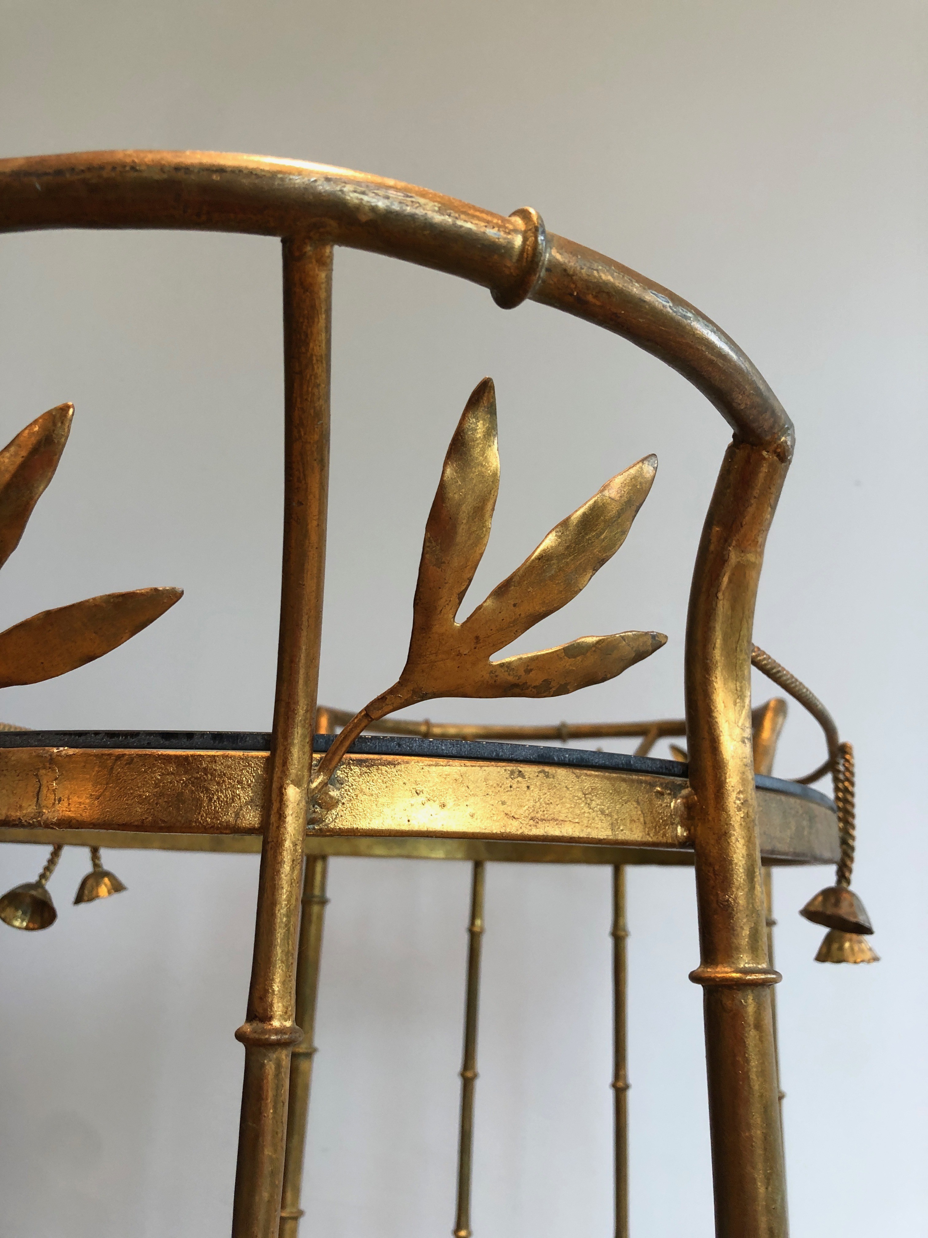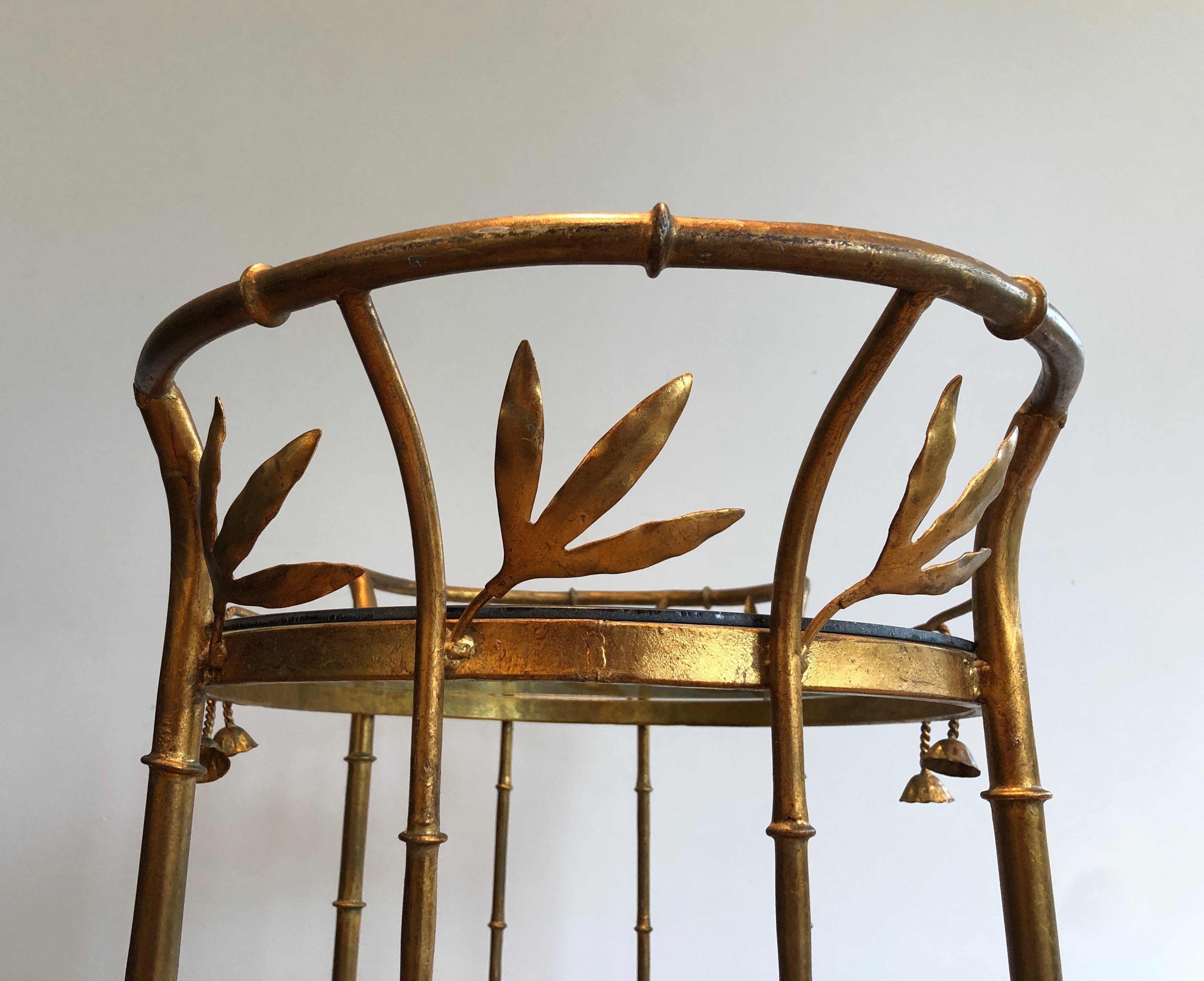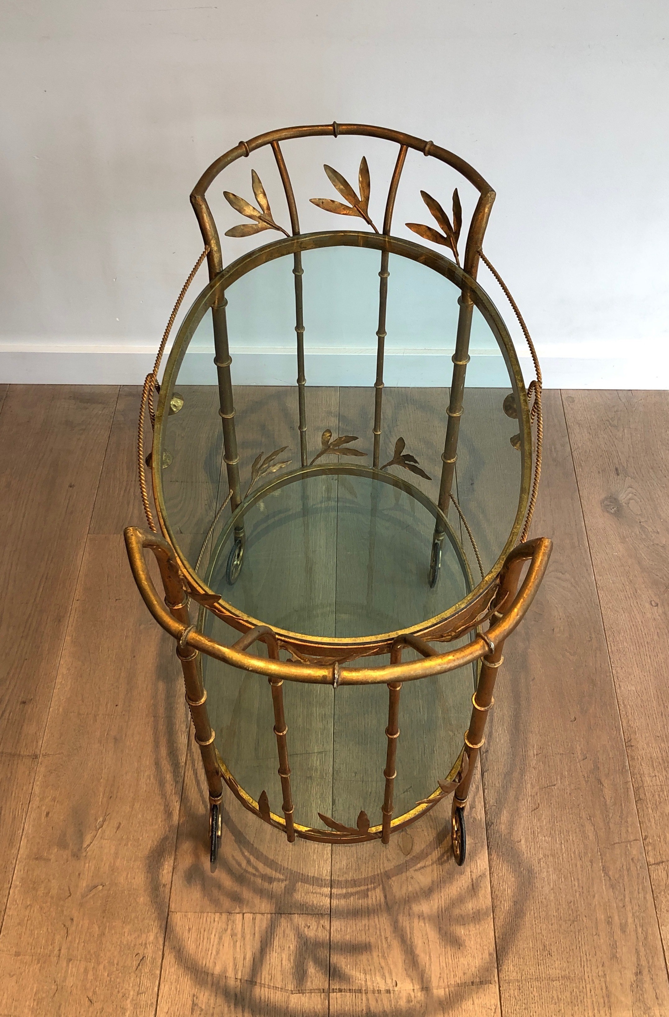 This exquisite drinks trolley is constructed in gilt metal with simulated bamboo detailing on its legs and frame, presenting a composition of elegant restraint and sophisticated luxury. The faux-bamboo form — here rendered in richly gilded metal — was one of the defining motifs of Parisian decorative arts in the 1960s and 1970s, prized for its capacity to evoke exotic refinement within a Neoclassical or Chinoiserie framework. The piece is mounted on wheels for easy mobility, with two glass shelves providing generous display space for bottles, glasses, and decorative objects.
