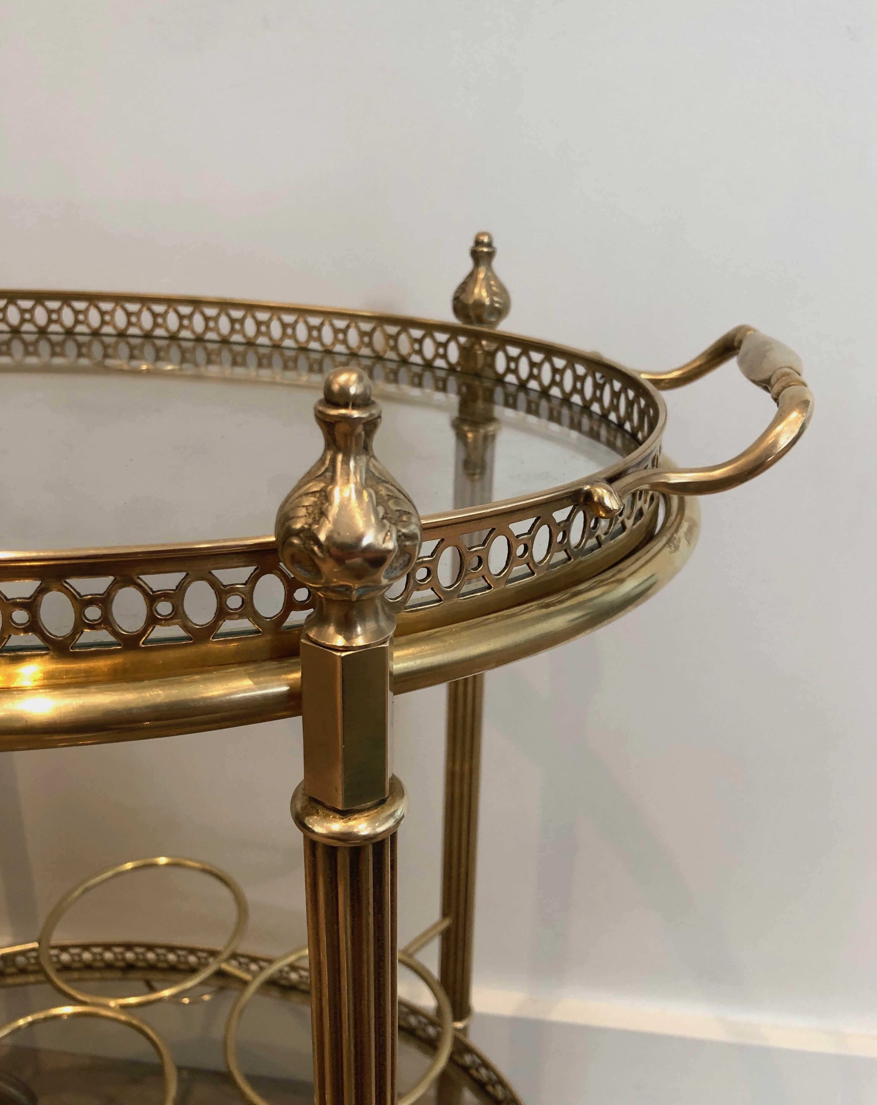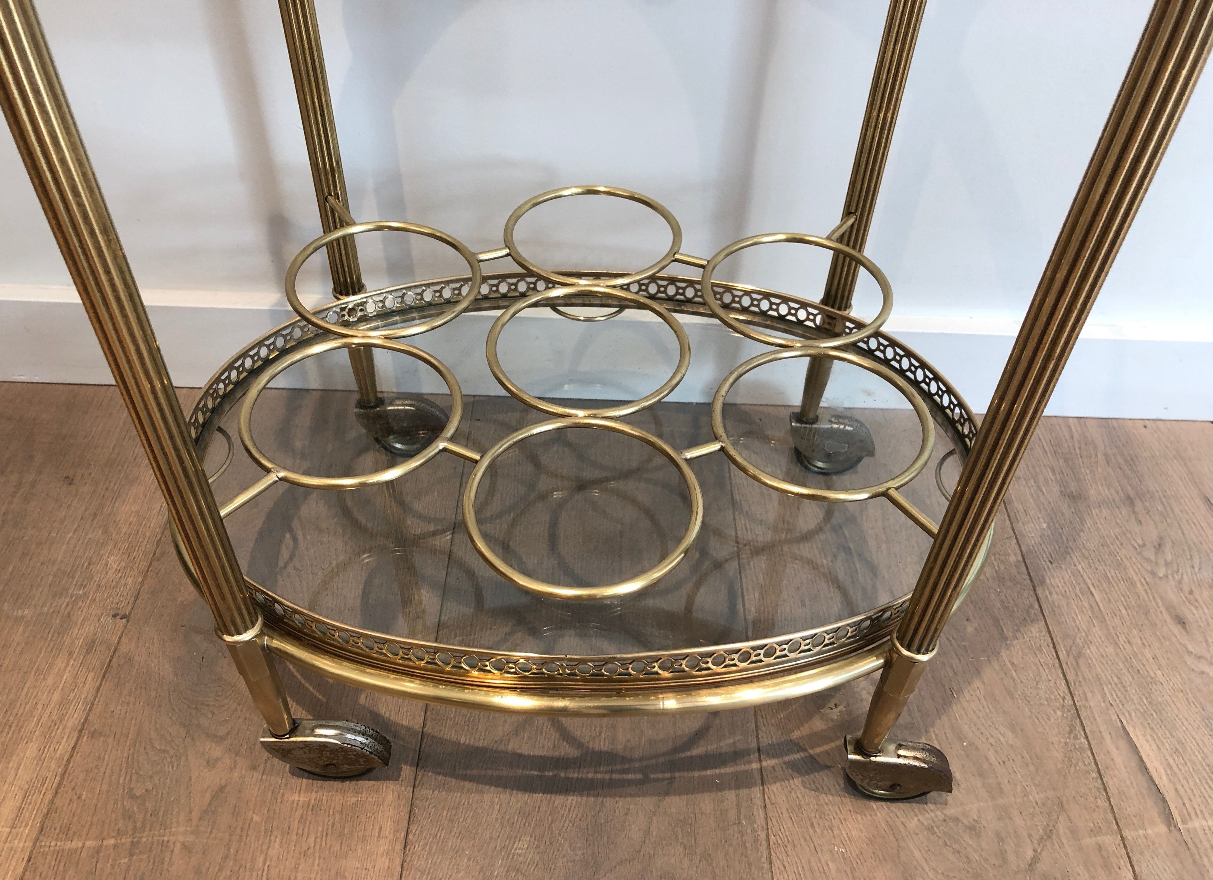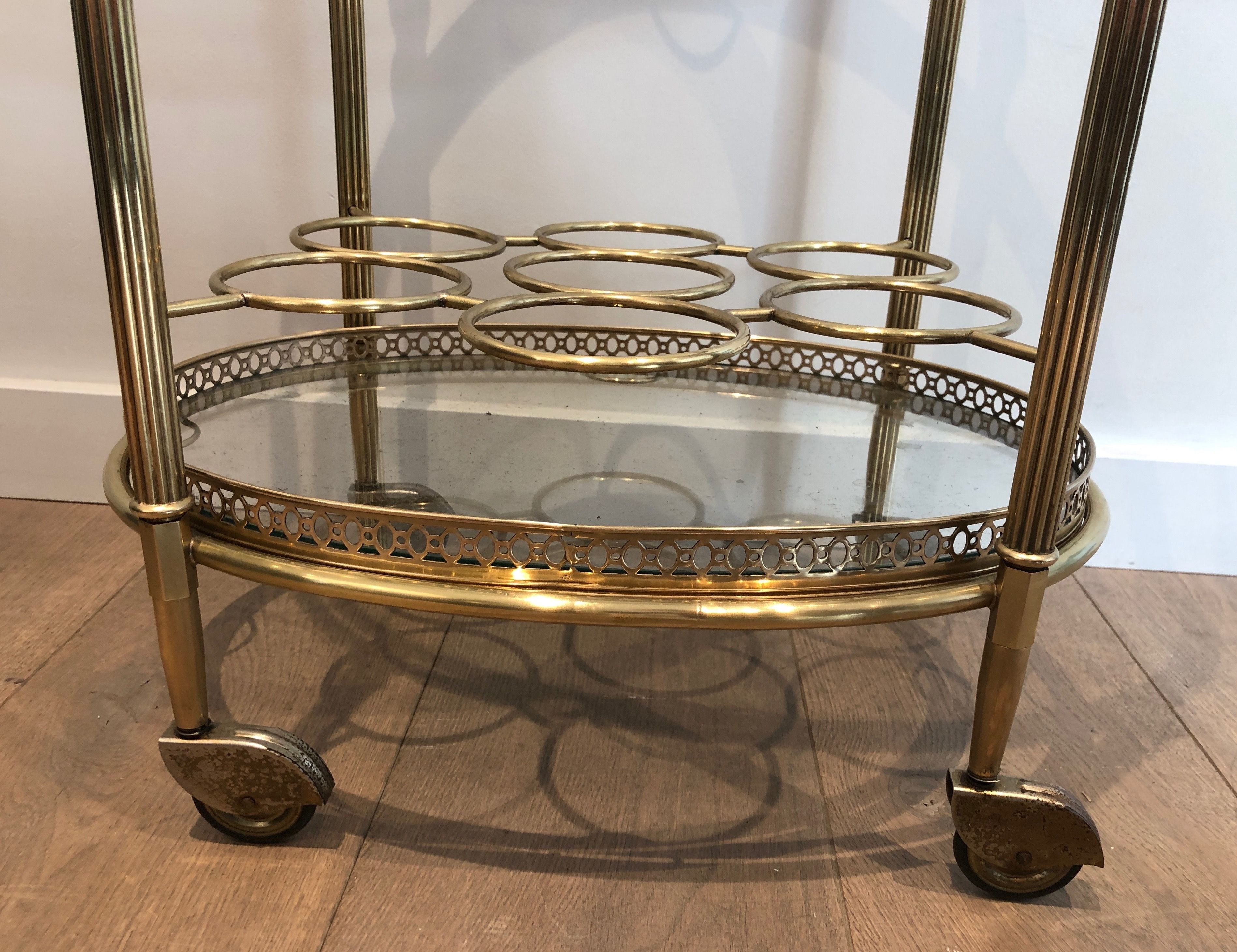 This supremely elegant drinks trolley is fashioned from polished brass, its oval form mounted on four slender wheels that allow it to glide effortlessly across a room. The upper tier features a removable tray — ideal for serving glasses or hors-d'œuvres — while the lower level incorporates a dedicated bottle holder, ensuring that the finest vintages are always within graceful reach. The overall construction is light yet robust, the gleaming brass surfaces reflecting the refinement and technical mastery of French metalwork at its finest.