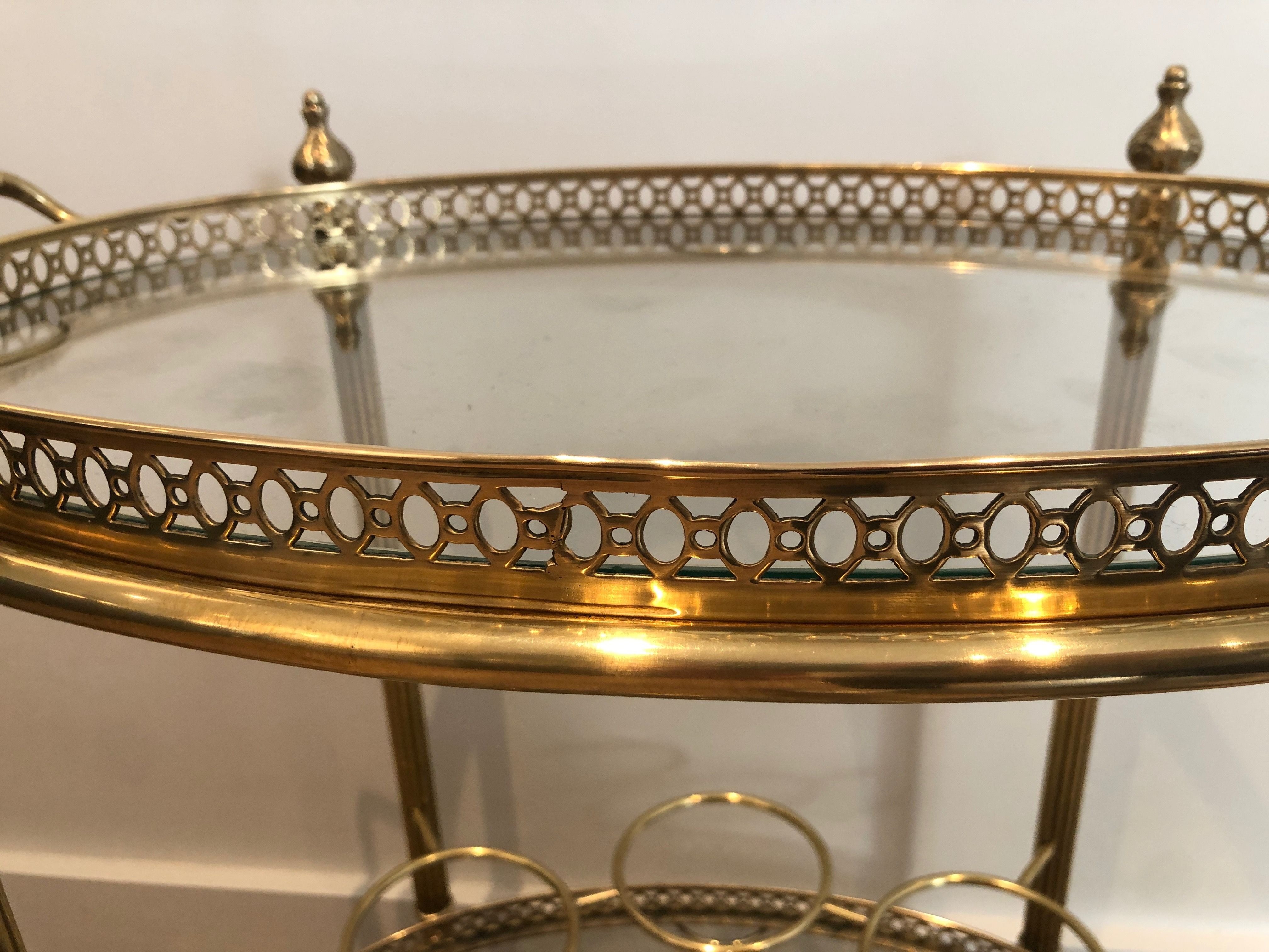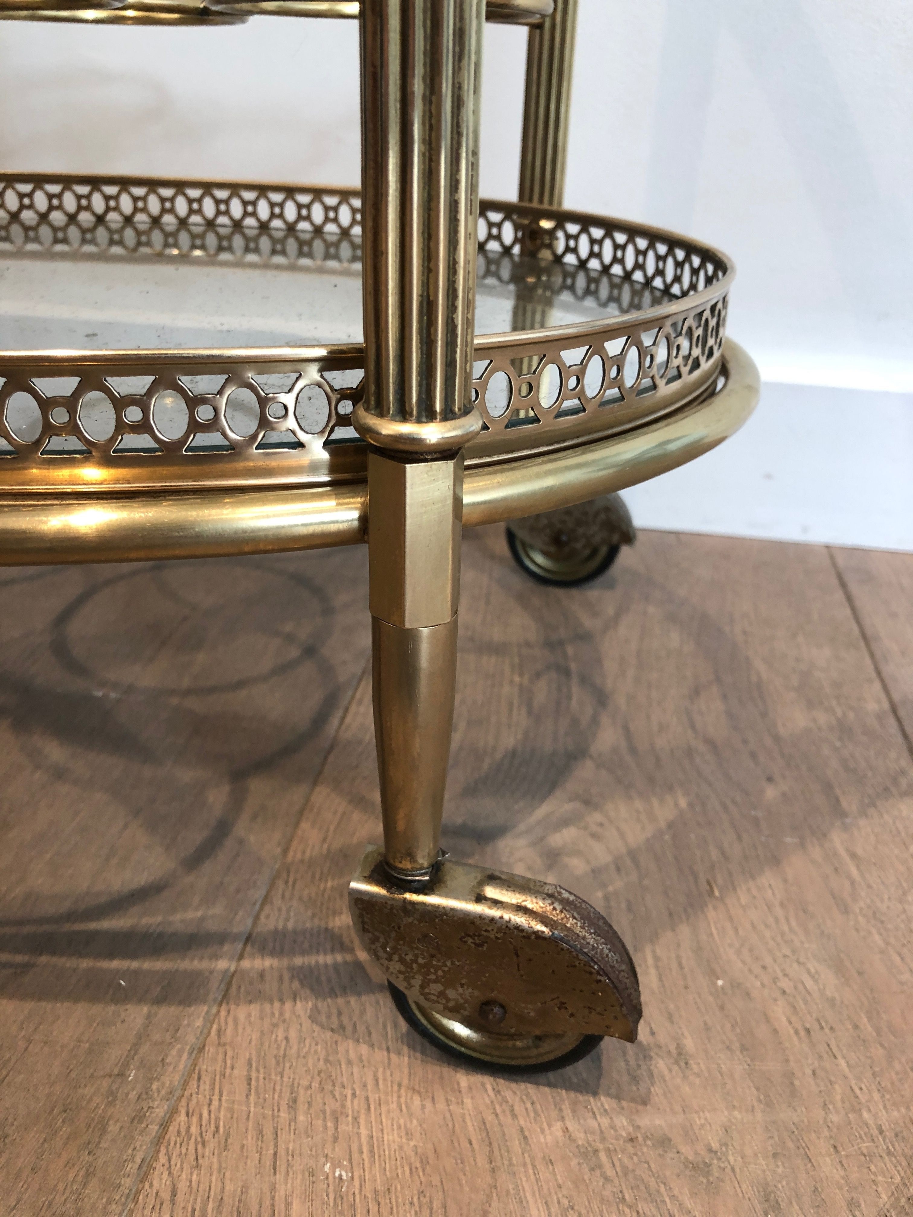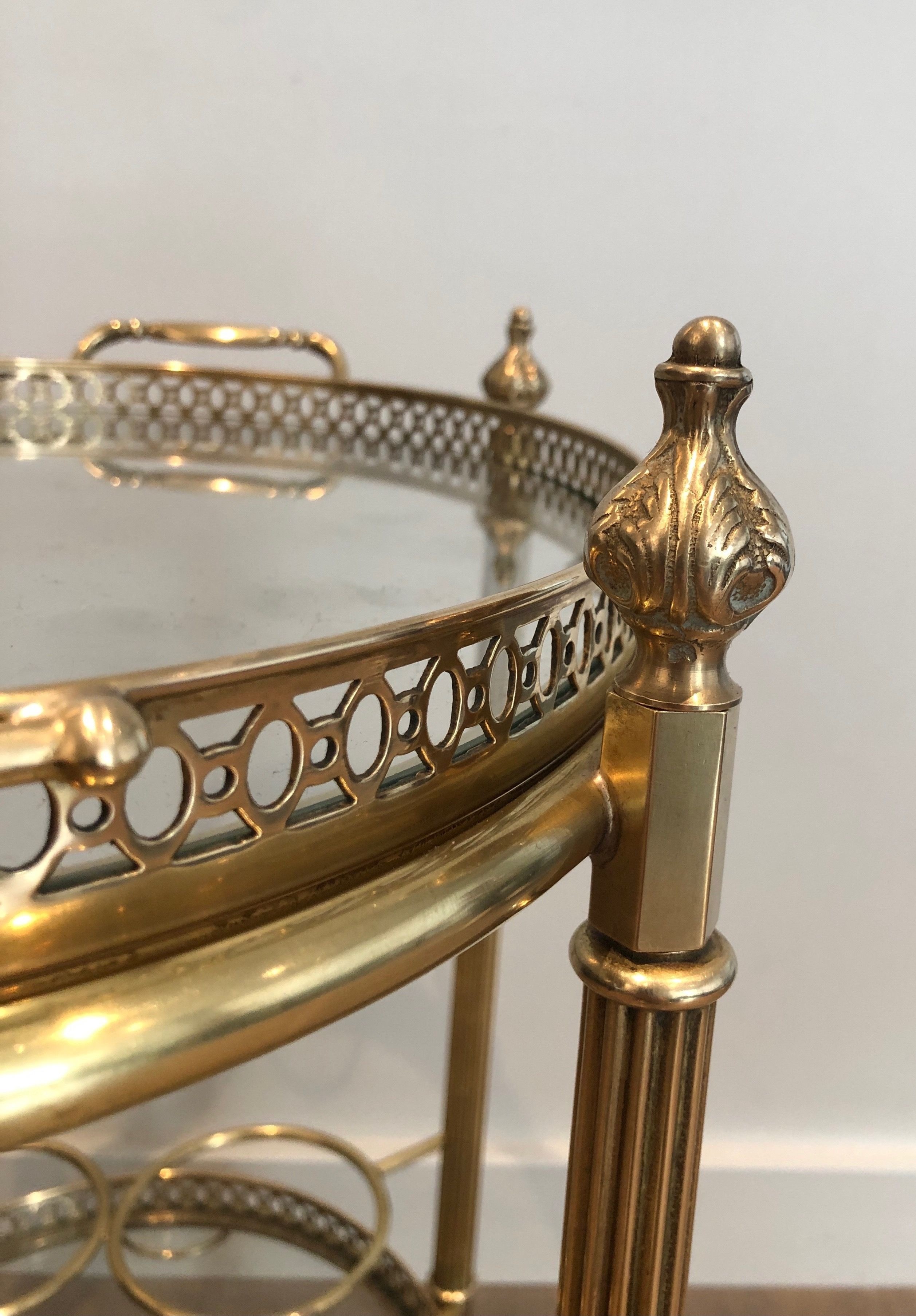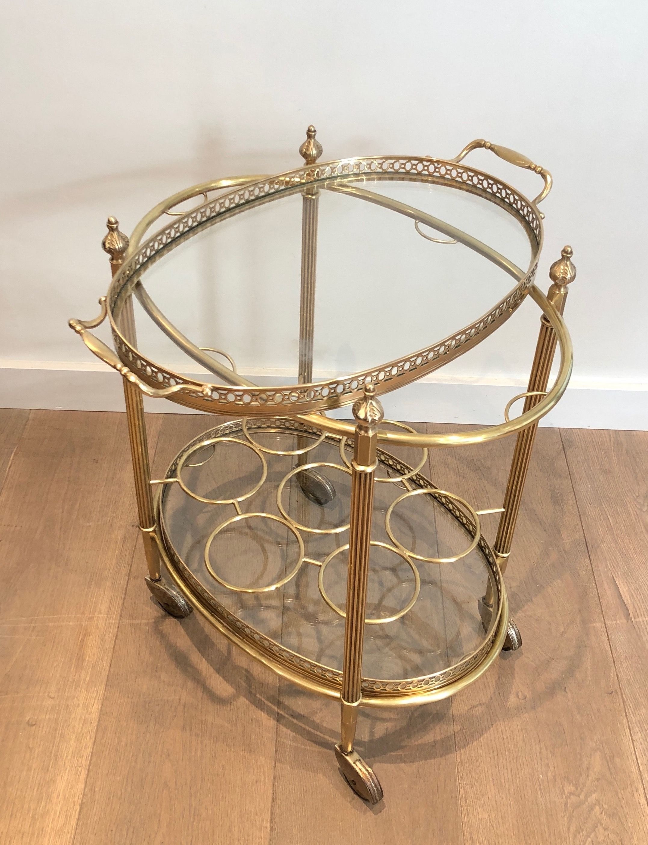 This supremely elegant drinks trolley is fashioned from polished brass, its oval form mounted on four slender wheels that allow it to glide effortlessly across a room. The upper tier features a removable tray — ideal for serving glasses or hors-d'œuvres — while the lower level incorporates a dedicated bottle holder, ensuring that the finest vintages are always within graceful reach. The overall construction is light yet robust, the gleaming brass surfaces reflecting the refinement and technical mastery of French metalwork at its finest.
