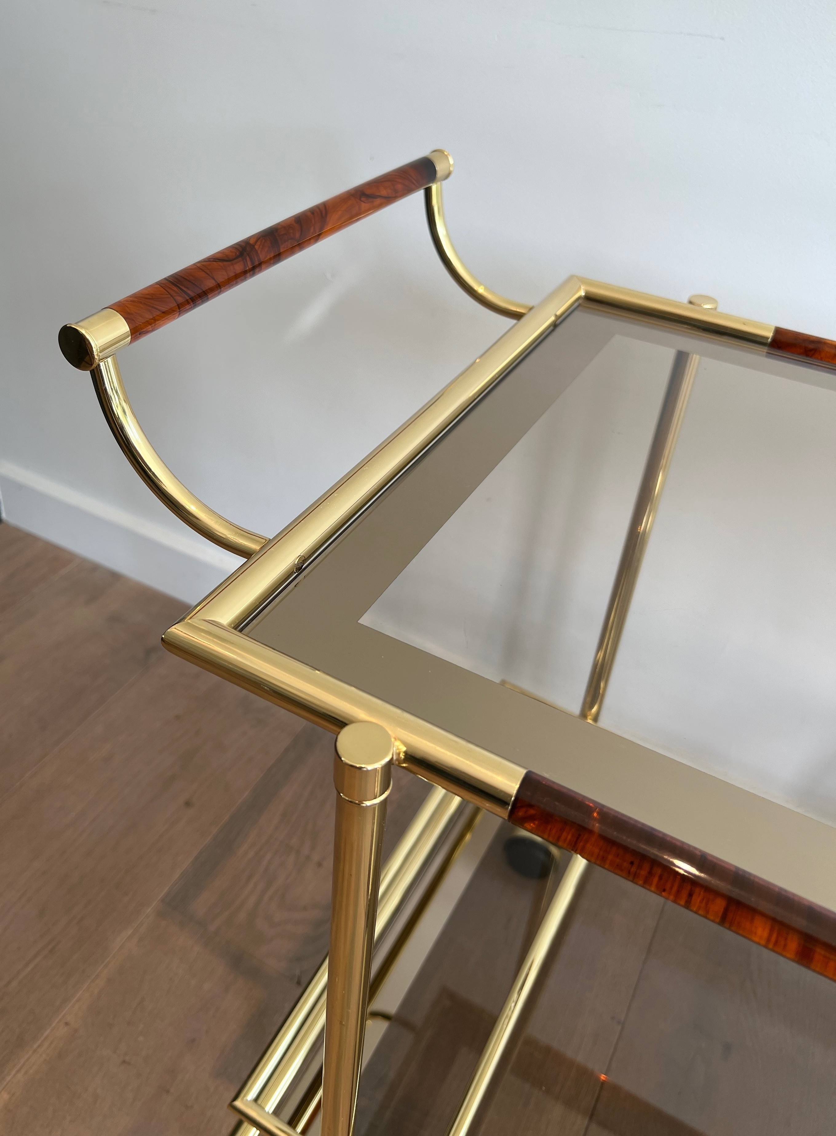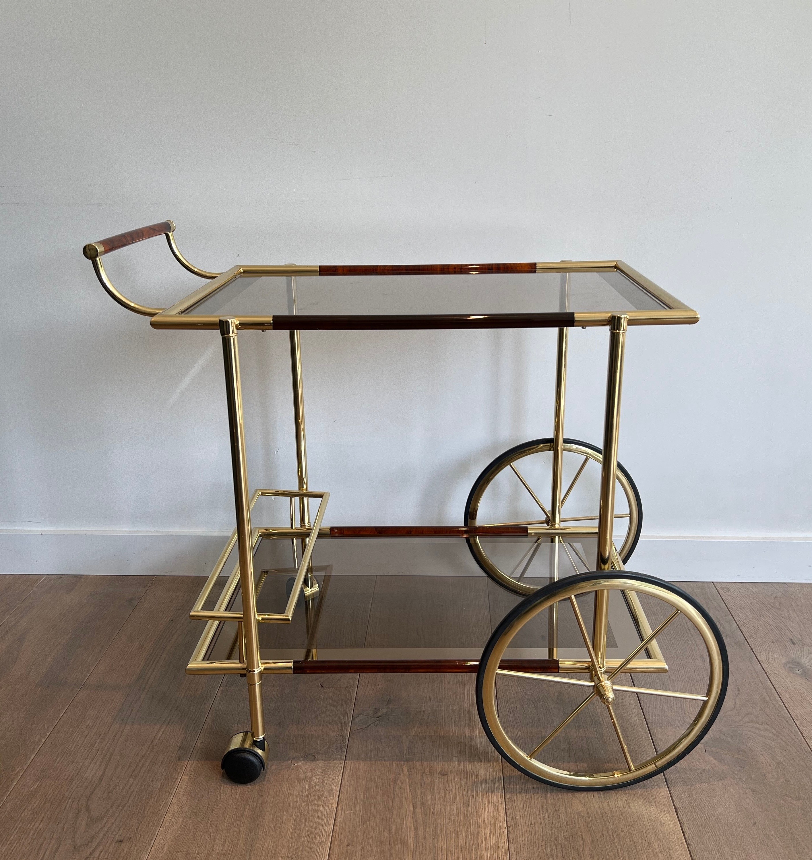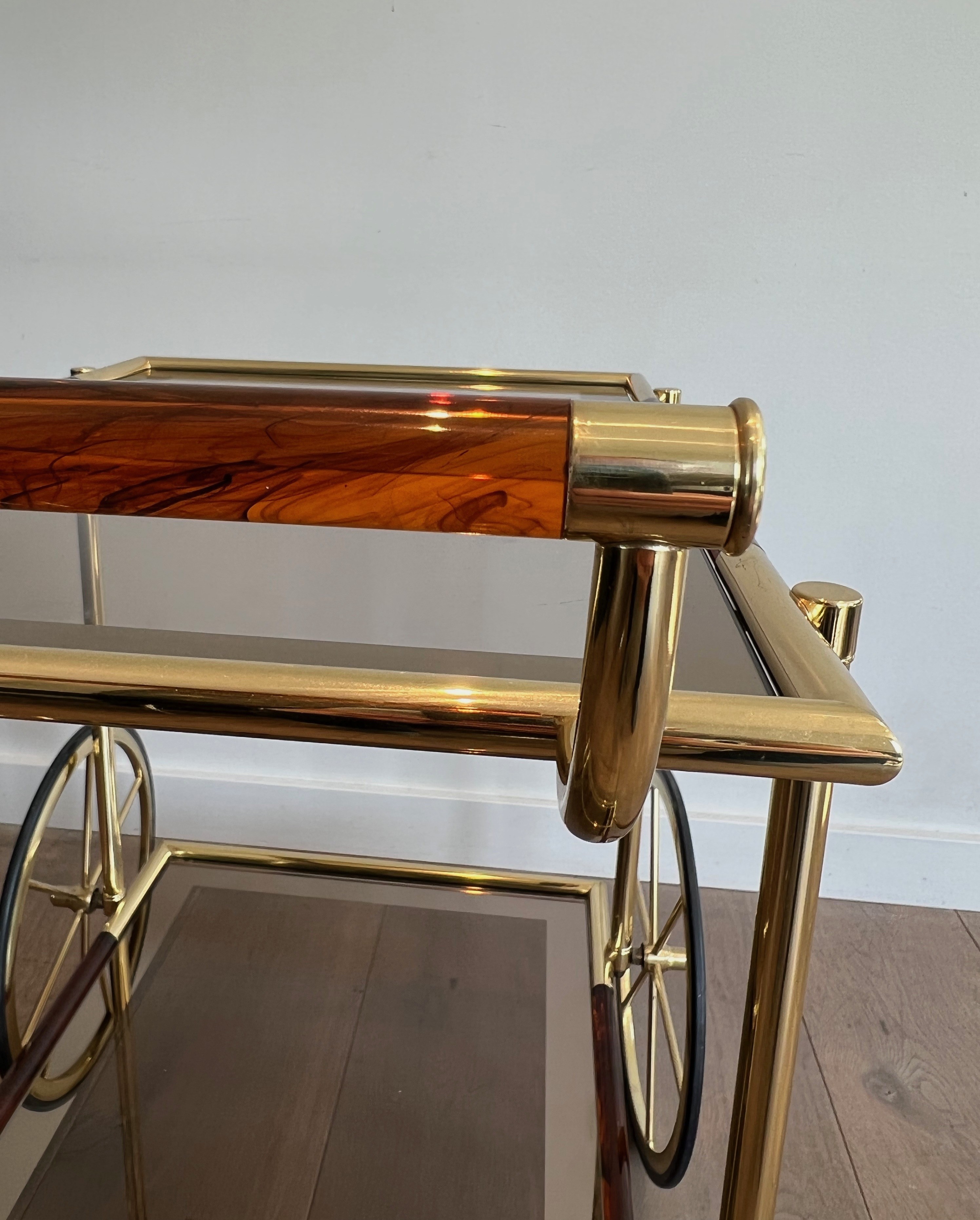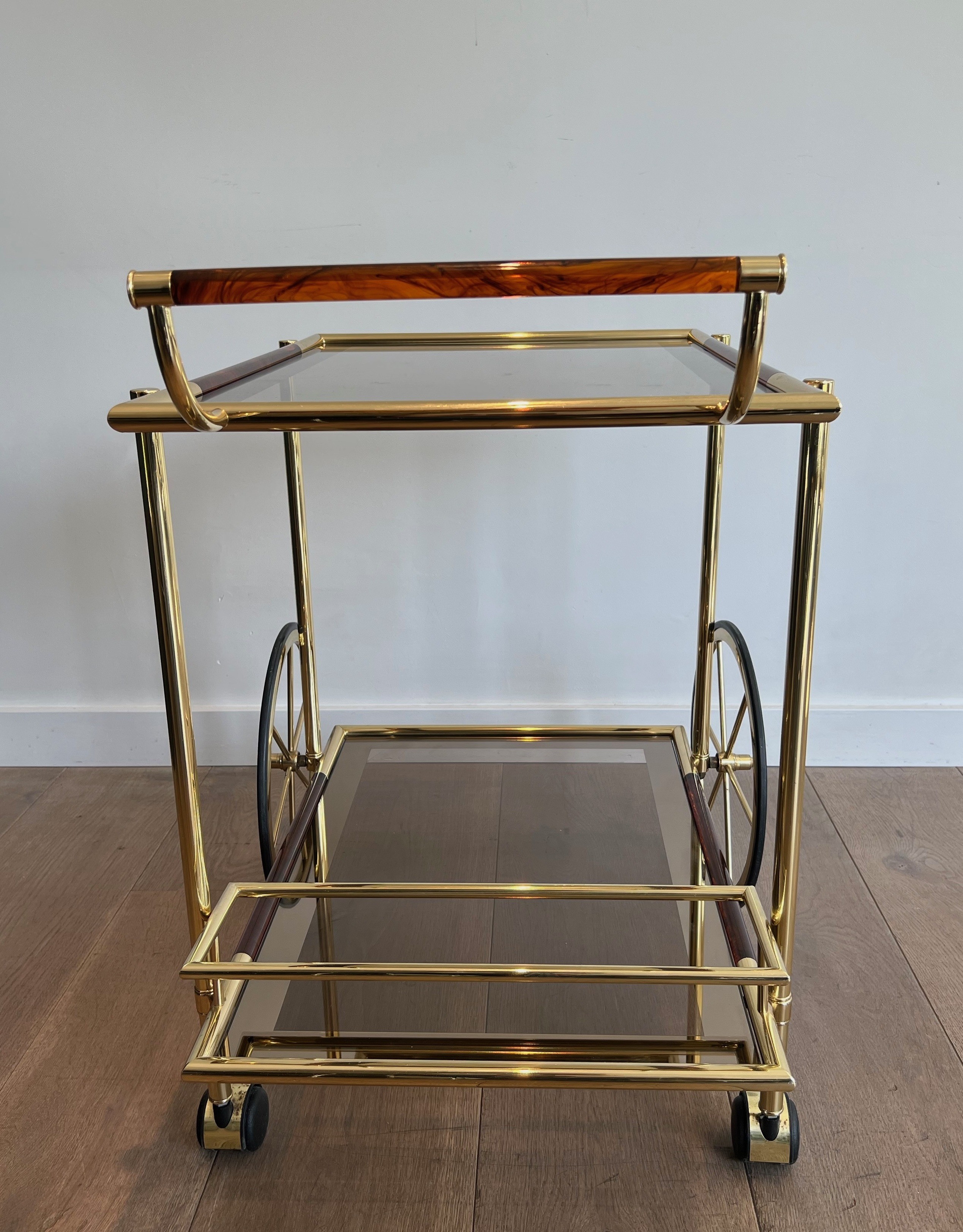 A striking Mid-Century design drinks trolley constructed from polished brass and vibrant orange-red celluloid, the combination of materials creating a bold chromatic and textural contrast characteristic of the most adventurous French decorative production of the late 1960s and early 1970s. The trolley's framework, rendered in gleaming brass, is composed of tubular or bar-form members arranged with an eye for geometric elegance, while the shelves or panels of translucent orange-red celluloid infuse the piece with warm, luminous colour.