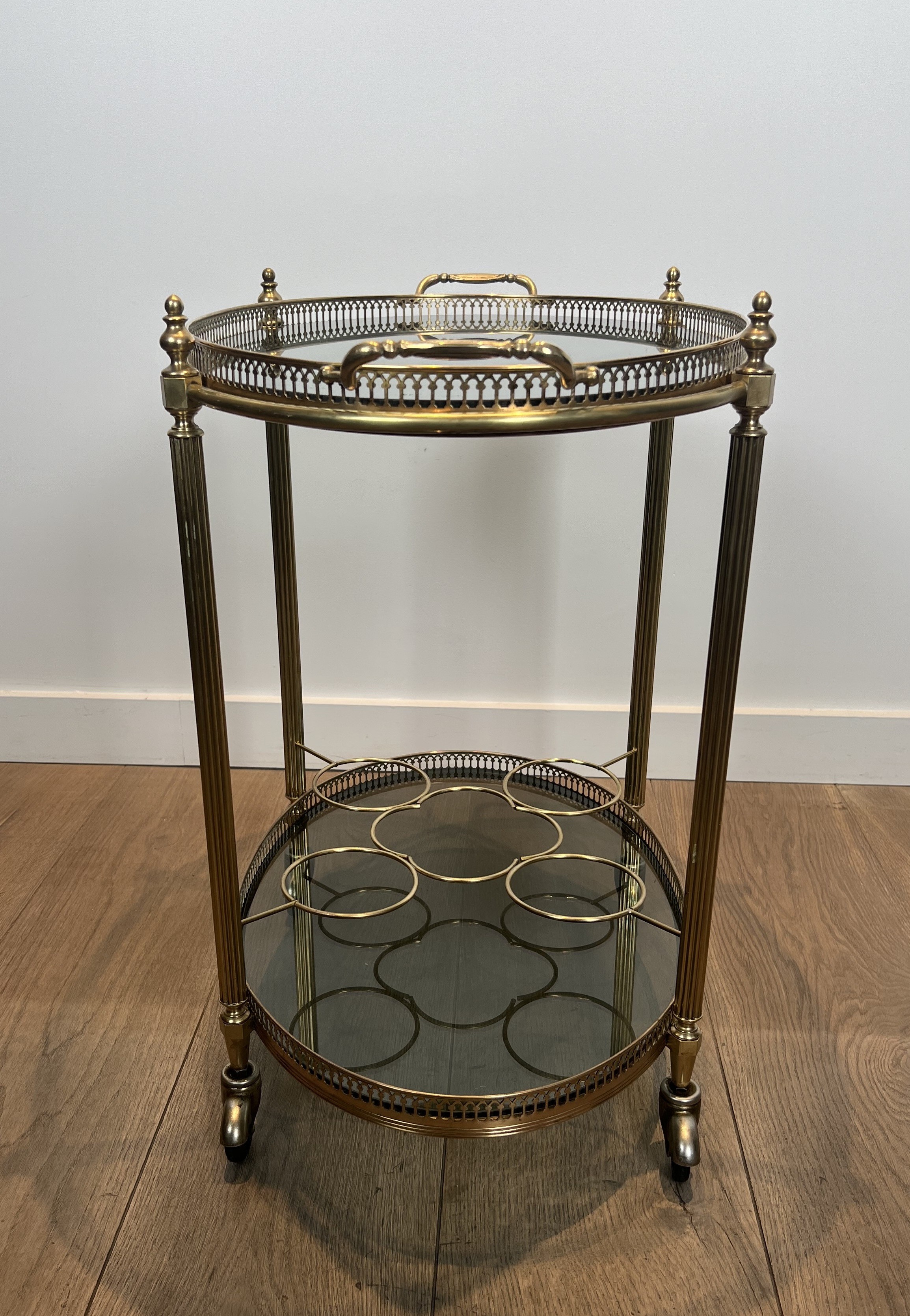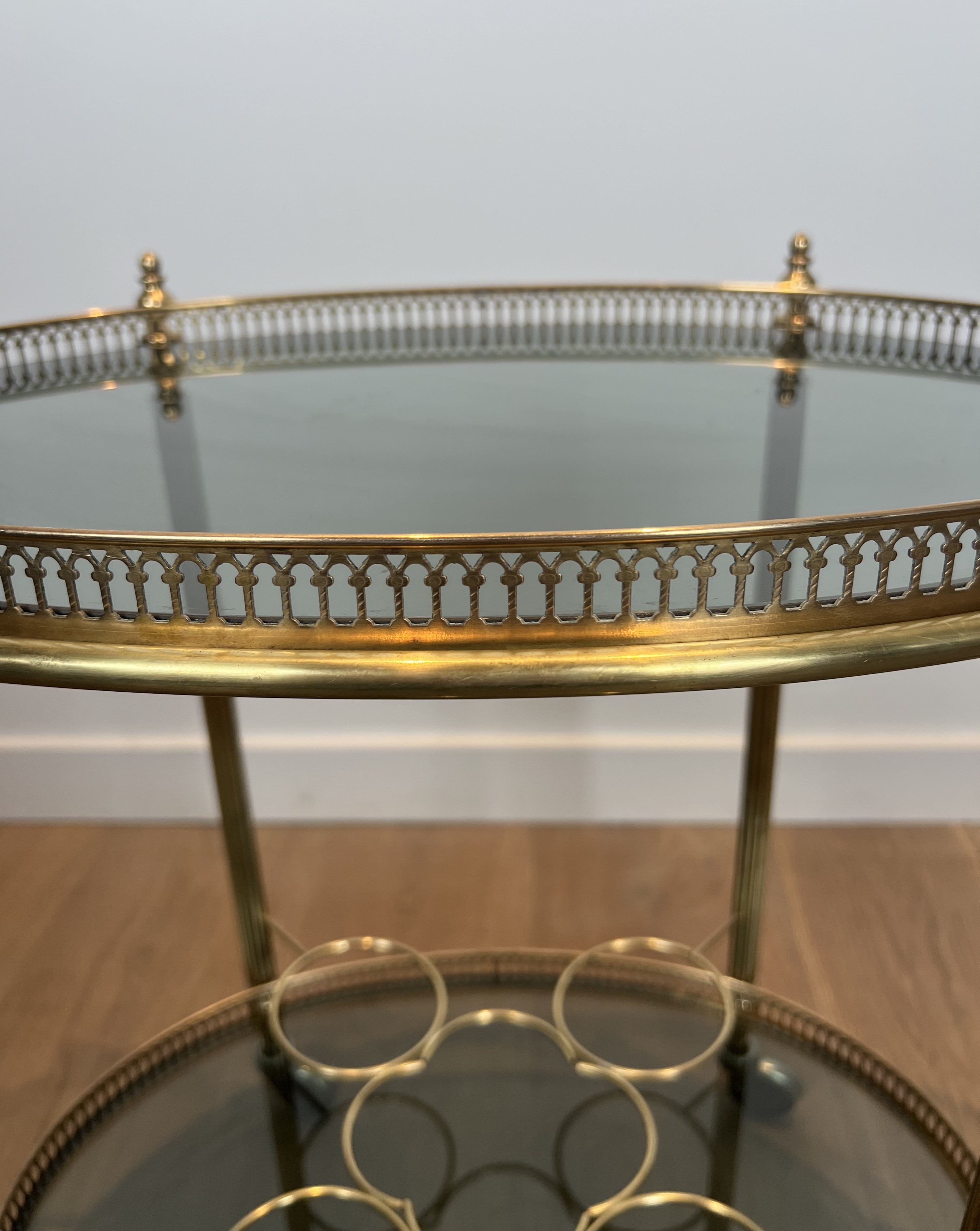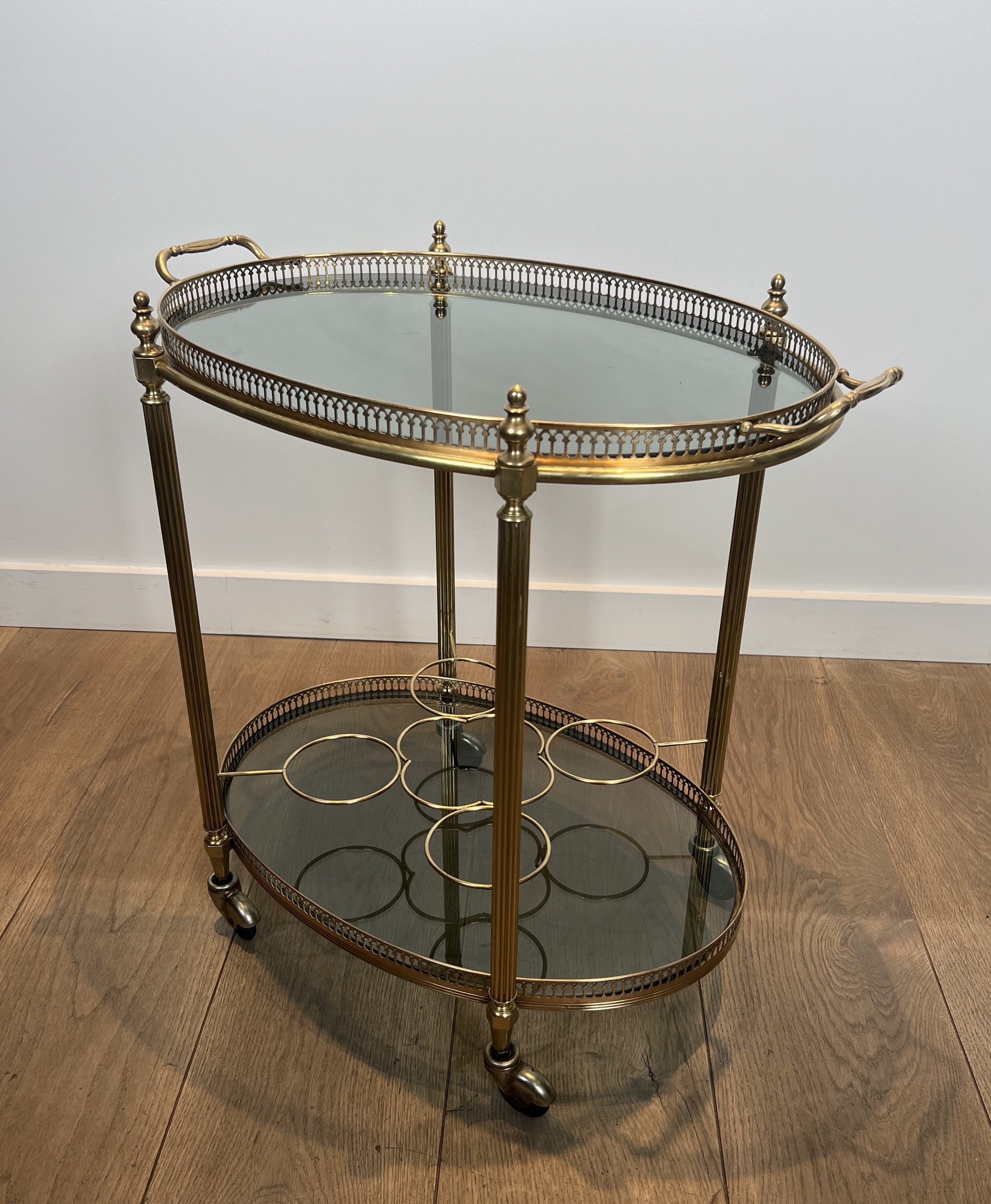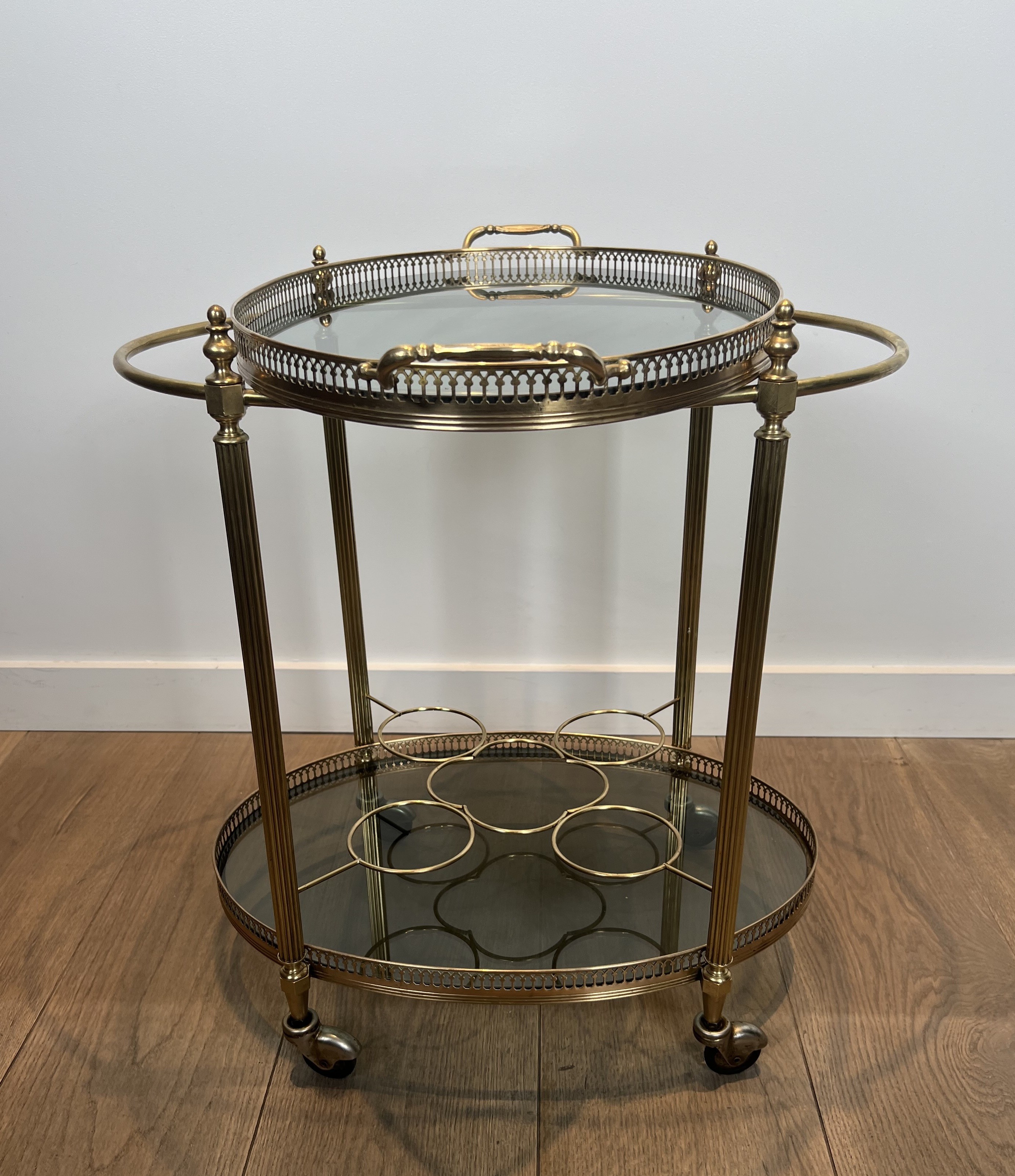 Neoclassical style oval brass drinks trolley with bluish glass. Removable top tray. French work by Maison Jansen. Circa 1940
