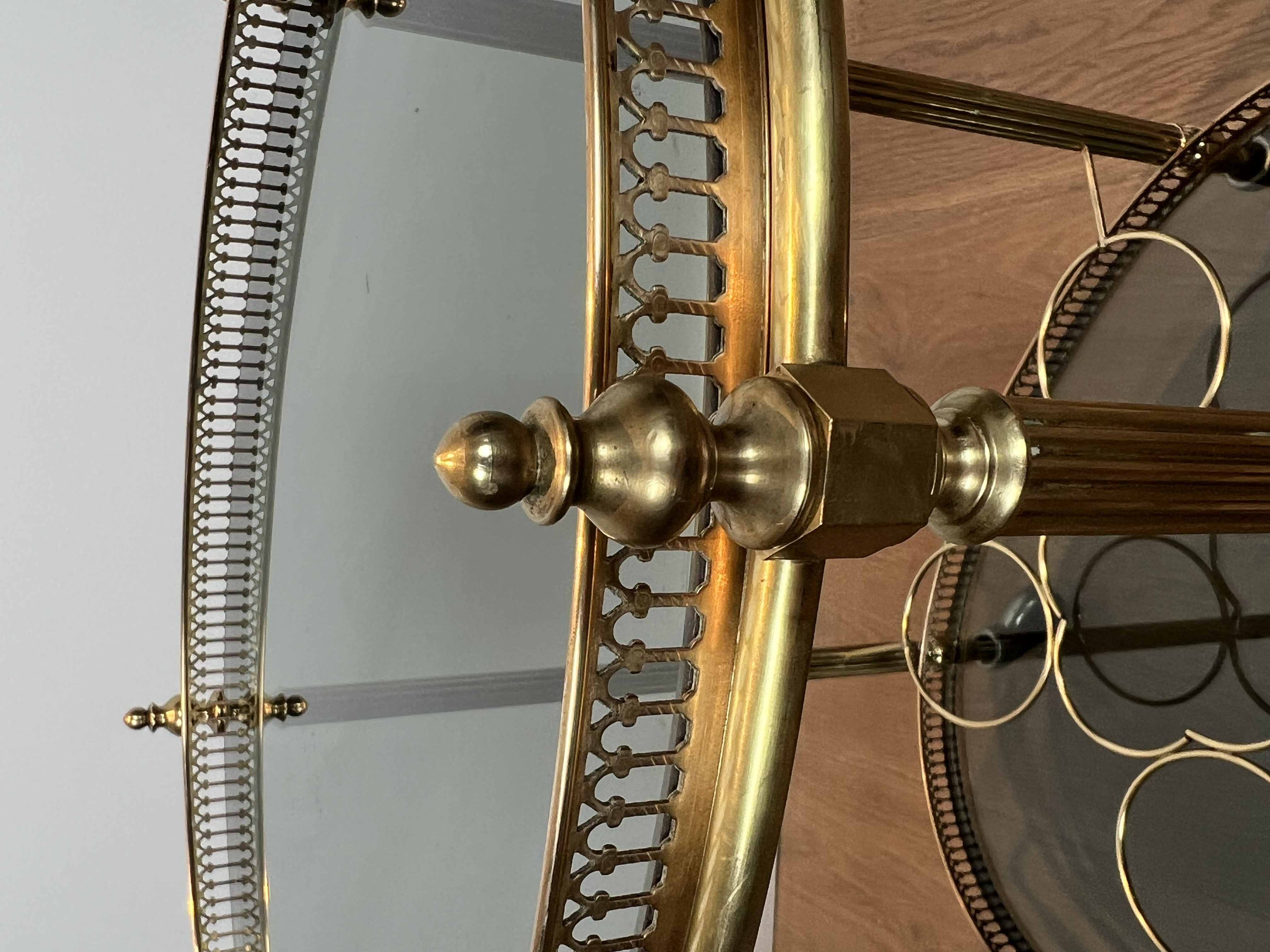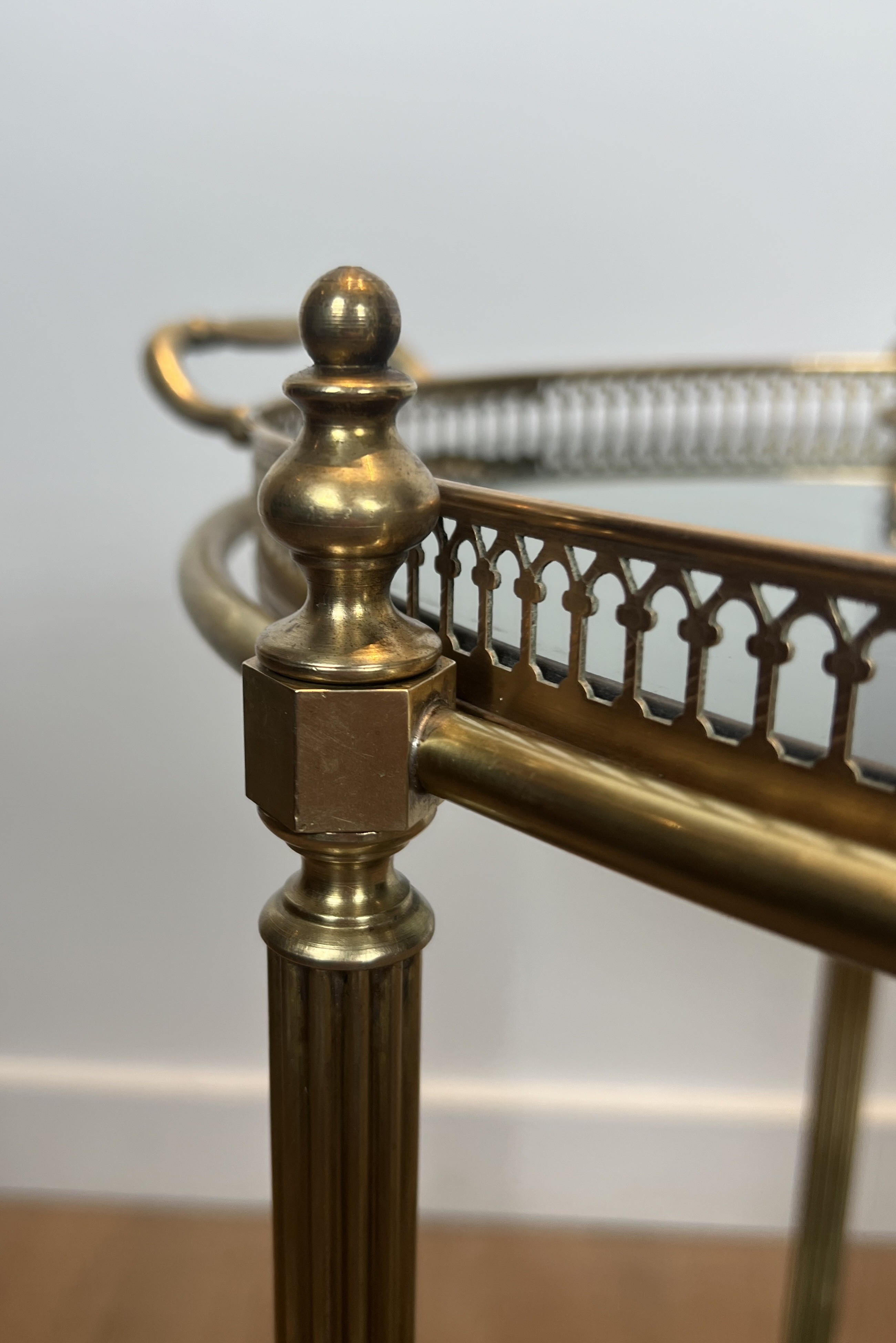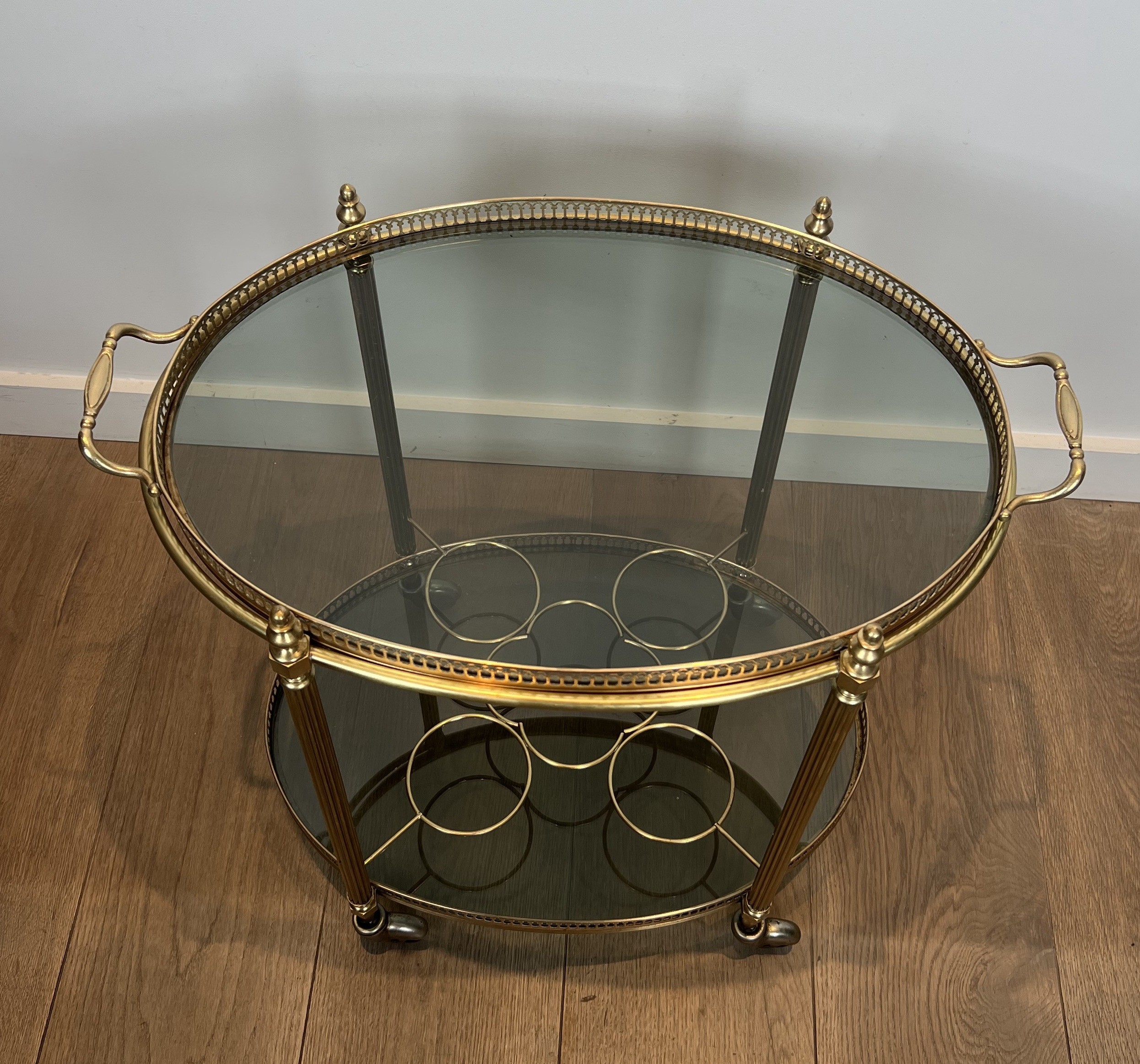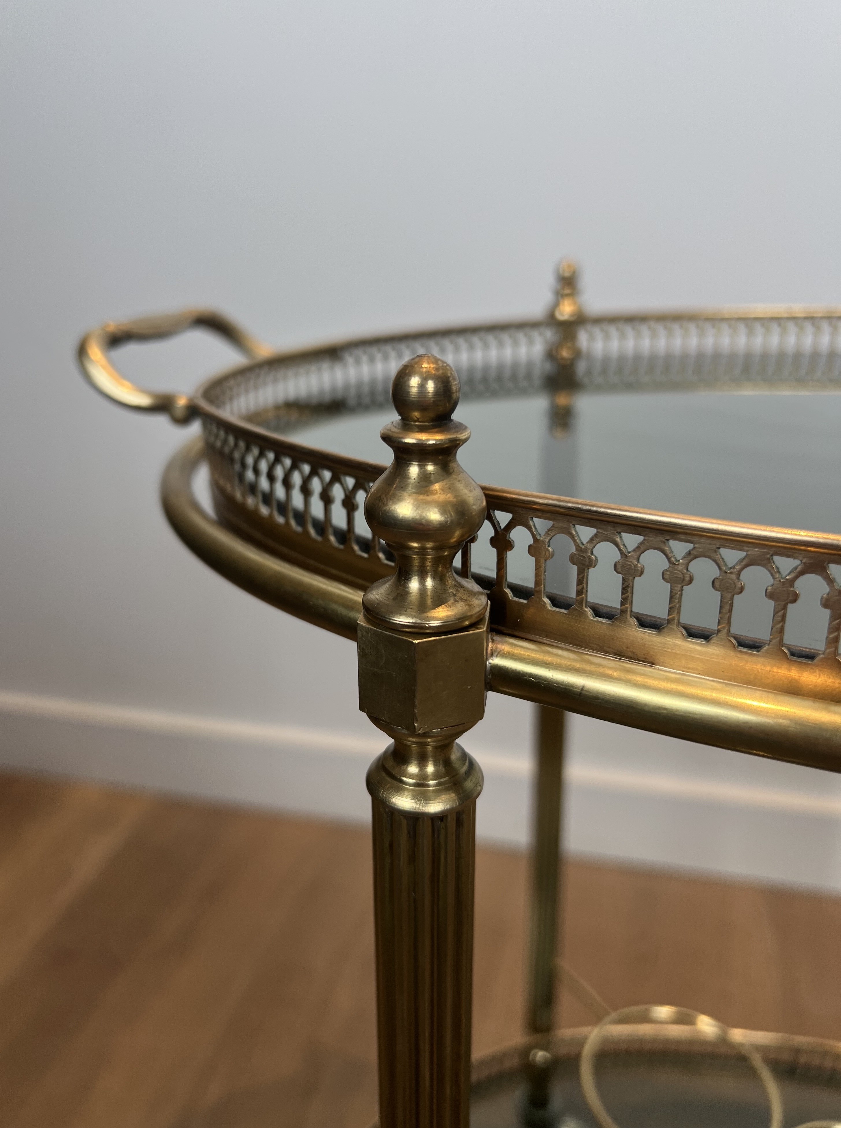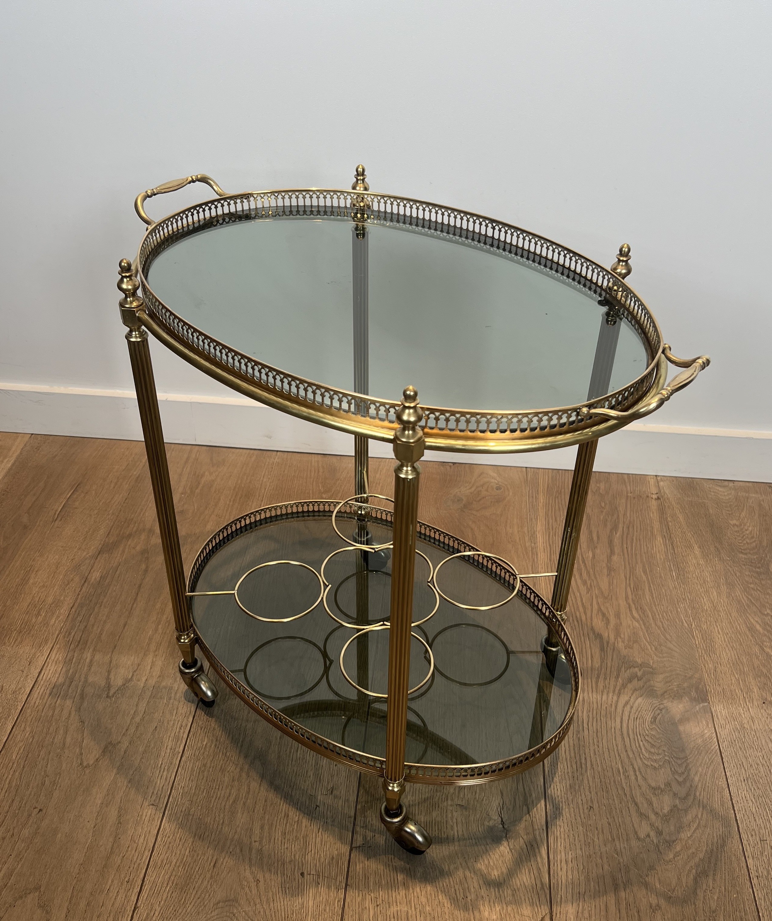 Neoclassical style oval brass drinks trolley with bluish glass. Removable top tray. French work by Maison Jansen. Circa 1940