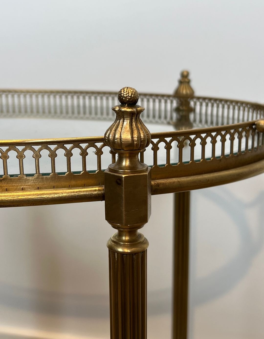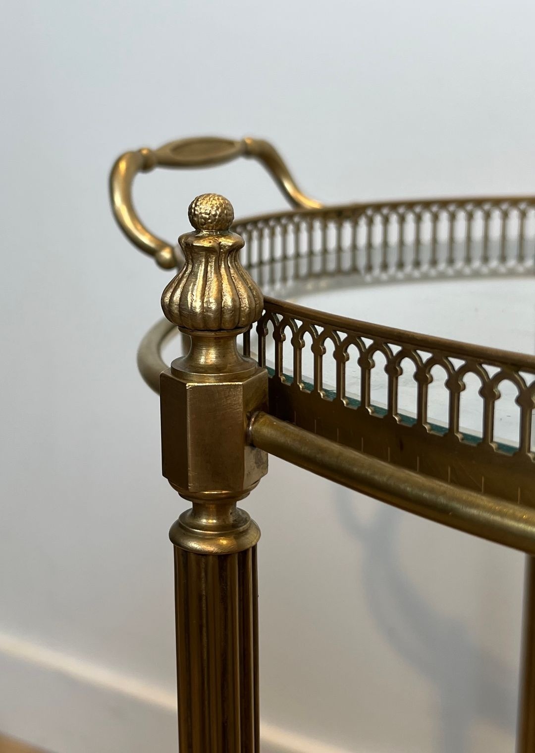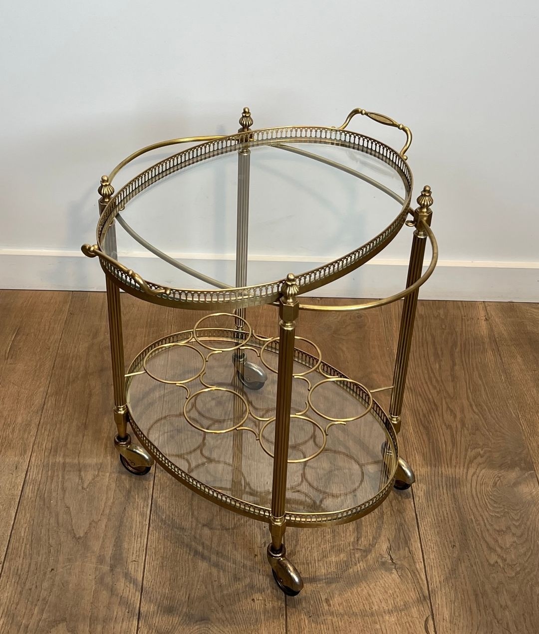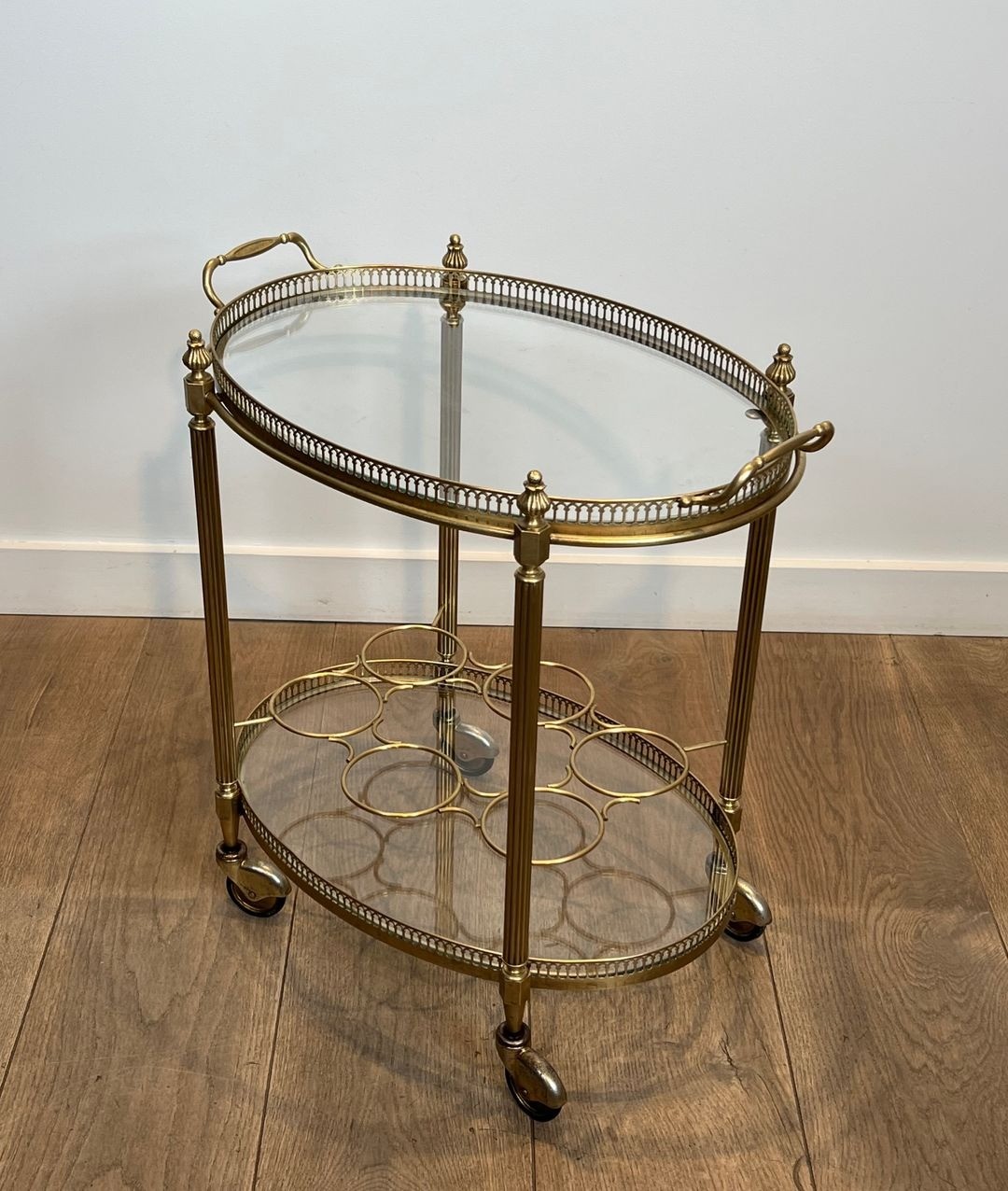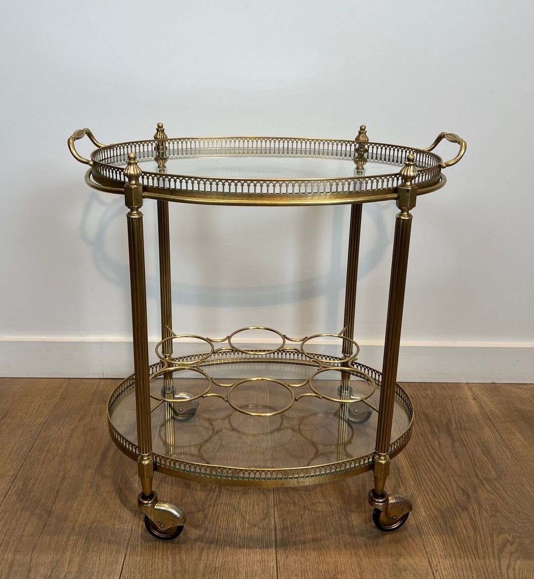 The trolley is organised across two levels: an upper removable oval tray for glasses and bottles, and a lower tier functioning as a bottle holder—a practical arrangement that reflects the French tradition of the well-appointed drinks service. The brass structure, with its clean lines and restrained classical references, demonstrates the influence of Jansen’s celebrated interiors, in which utility and elegance were always held in perfect balance.