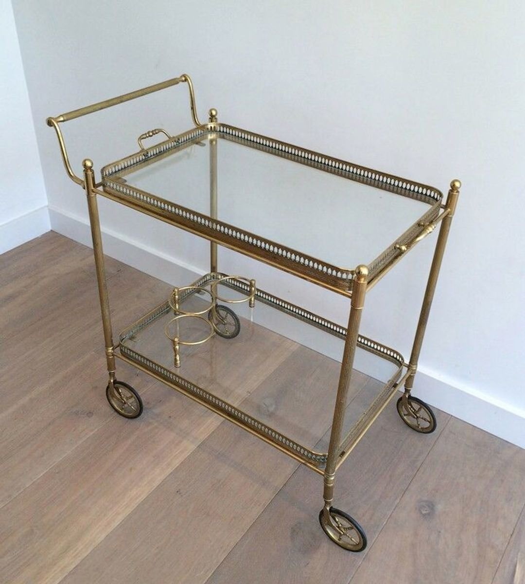The piece is executed entirely in polished brass, the slender frame enriched with classical ornamental details drawn from the vocabulary of neoclassical design: beading, fluting, and fretwork motifs that recall the great tradition of French luxury metalwork stretching back to the Ancien Régime. The whole stands on four elegant castors, allowing the trolley to be moved effortlessly from room to room.