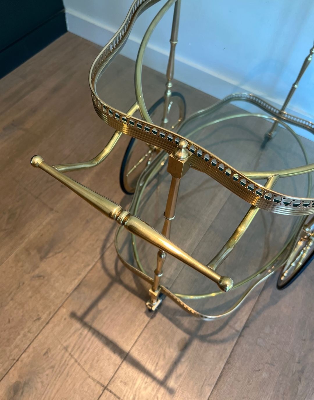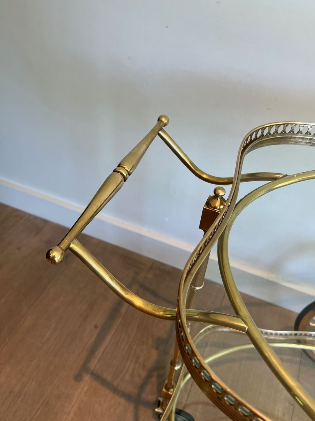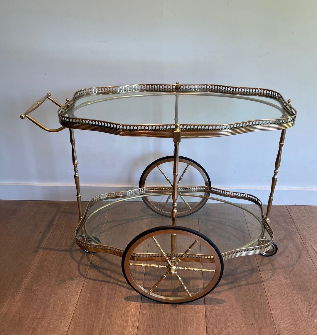 The drinks trolley occupied an important place in the domestic ritual of the mid-twentieth century French bourgeois interior, functioning simultaneously as a piece of furniture and a prop for the theatre of entertaining. This example, its oval form and neoclassical brasswork marking it as a product of the French ateliers of the 1930s and 1940s, possesses the quiet assurance of a piece made for lasting use. The combination of brass and glass — materials that complement one another in their shared play on light — creates a piece that animates rather than dominates a space, adding warmth and sparkle in equal measure.