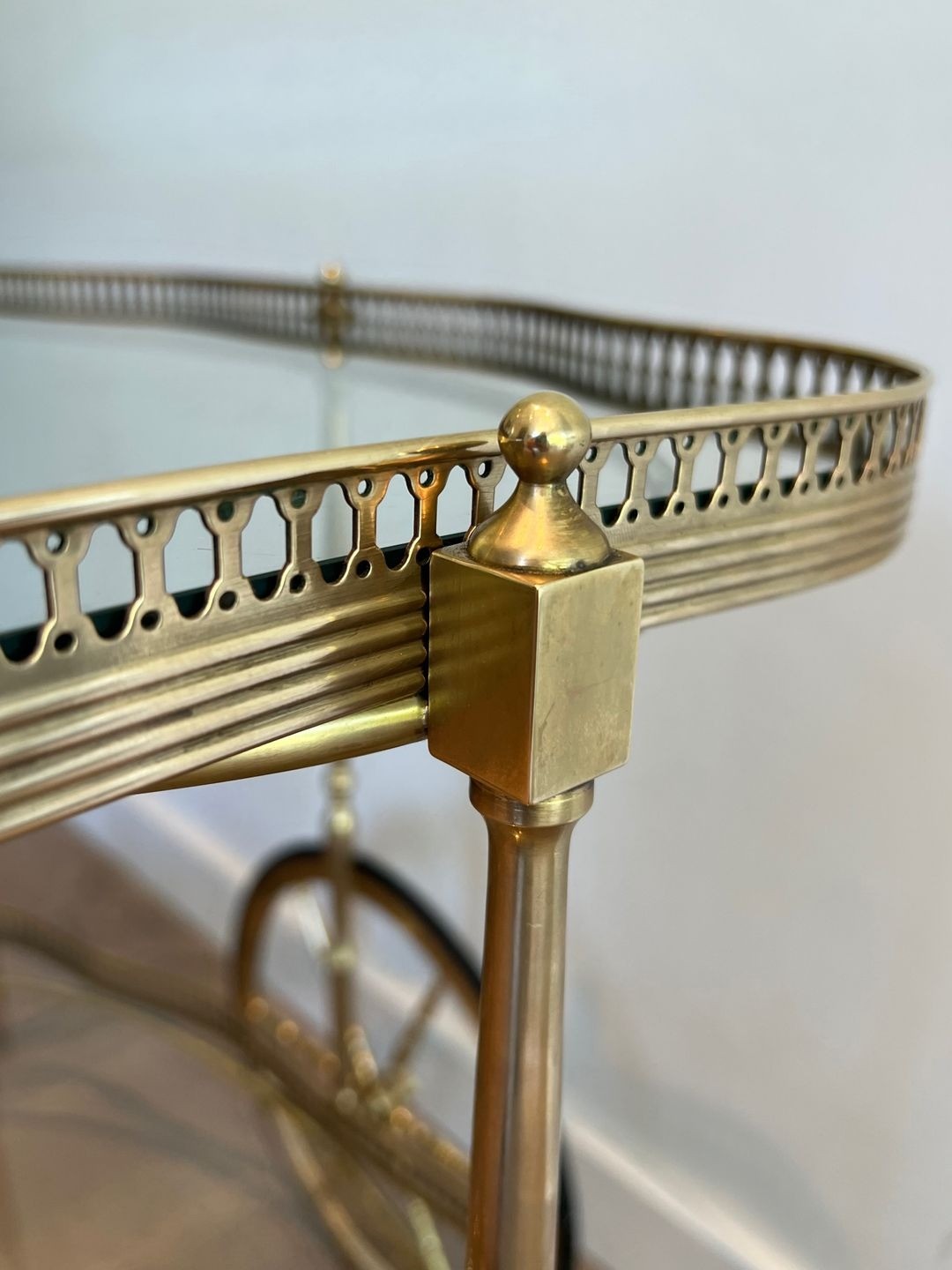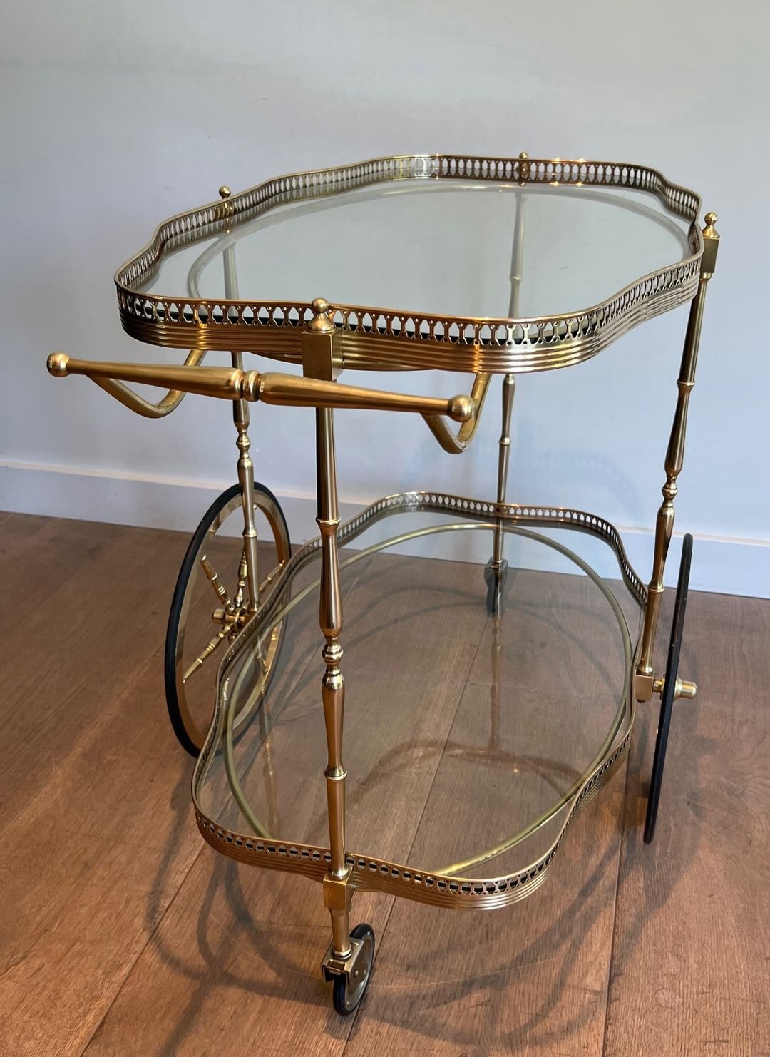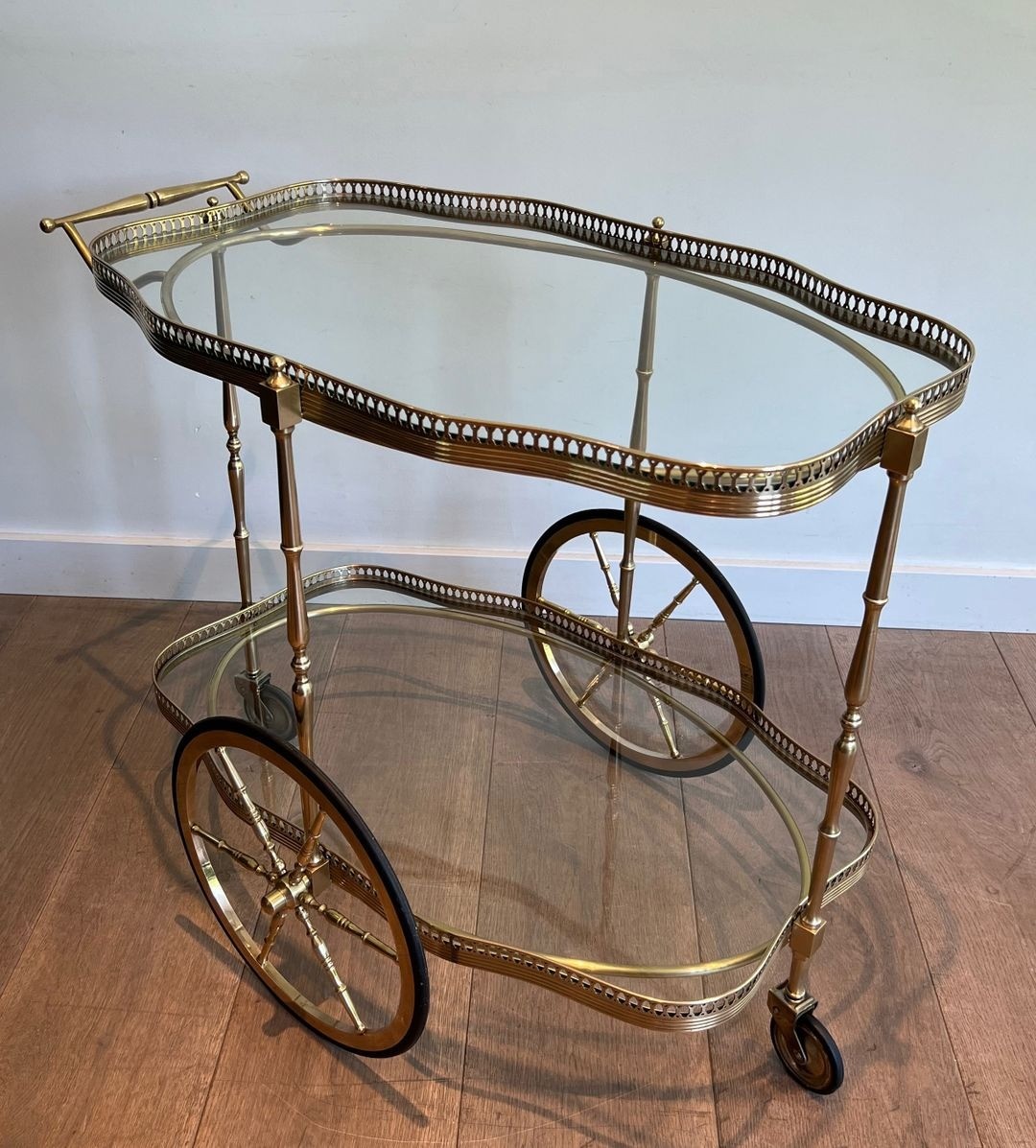 The drinks trolley occupied an important place in the domestic ritual of the mid-twentieth century French bourgeois interior, functioning simultaneously as a piece of furniture and a prop for the theatre of entertaining. This example, its oval form and neoclassical brasswork marking it as a product of the French ateliers of the 1930s and 1940s, possesses the quiet assurance of a piece made for lasting use. The combination of brass and glass — materials that complement one another in their shared play on light — creates a piece that animates rather than dominates a space, adding warmth and sparkle in equal measure.