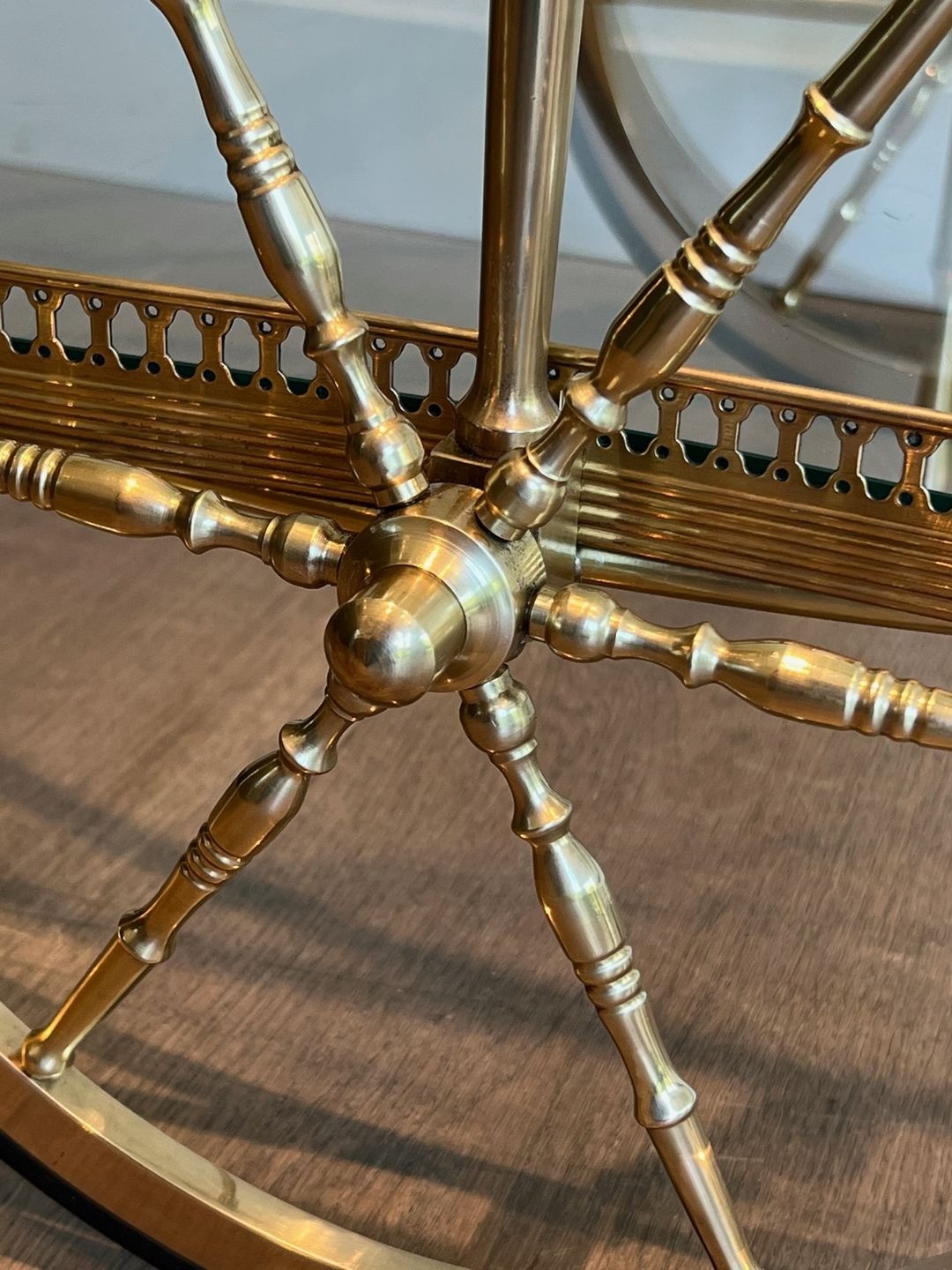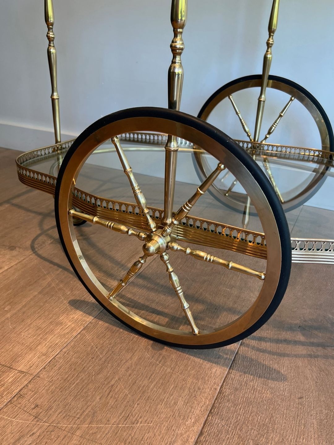 In very good condition consistent with age, the brass presenting a deep golden patina and the glass shelves intact. The casters are operational. A piece of genuine elegance, suited to a dining room, a drawing room, or a bar area in a home or hotel of character.