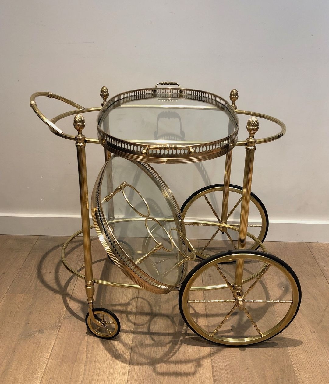 The trolley is composed with the neoclassical rigour that defines the Baguès aesthetic: an oval form echoed across two tiers, both fitted with removable glass shelves that rest within the brass frame. The upper tier is bounded by a delicate gallery rail of turned balusters — a period detail of the highest refinement — while the whole is supported on large spoke wheels that allow effortless movement. A single scrolled handle completes the composition with an elegant, minimal gesture.