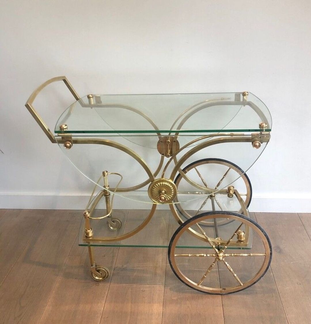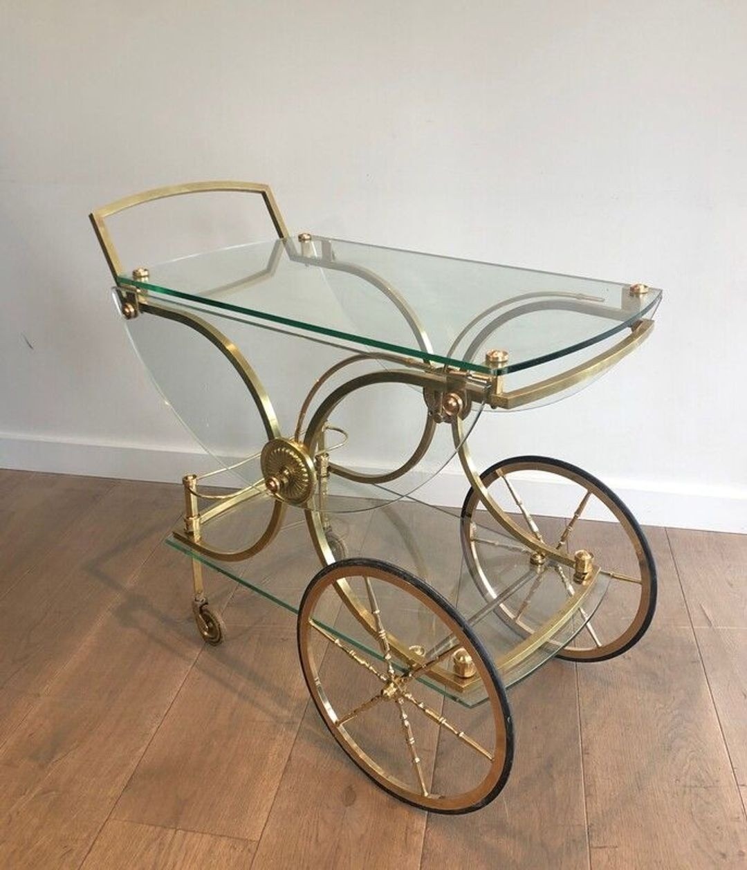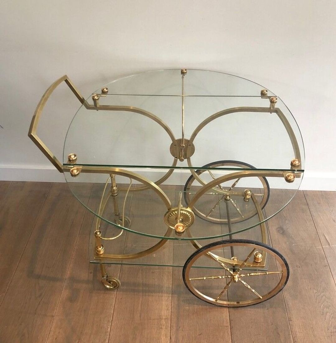 Neoclassical brass drinks trolley with two clear glass shelves, removable glass side panels, large spoked wheels with rosette hubs, and arched handle. Maison Baguès, France, circa 1940. W. 84.5 × D. 93.5 × H. 79 cm.