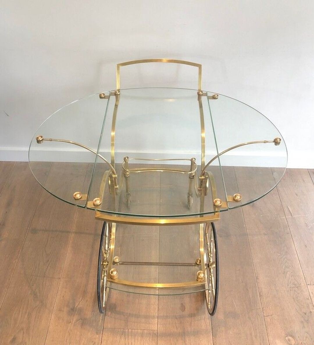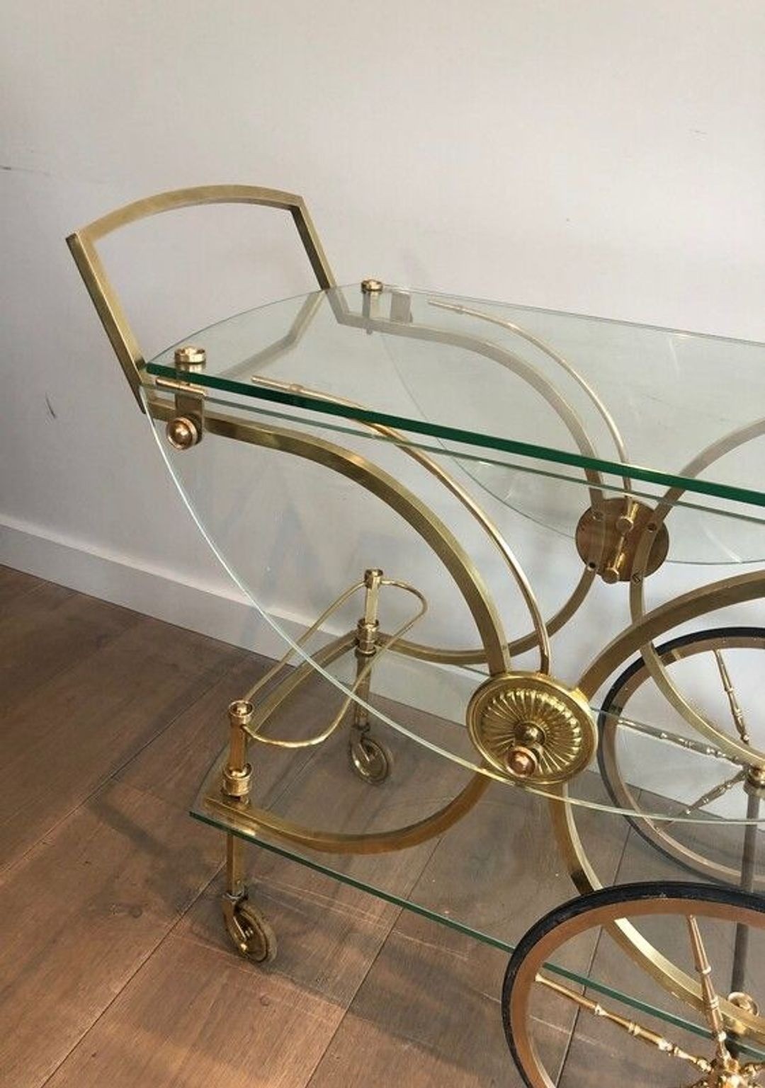 The trolley is constructed throughout in polished gilt brass, with a generous rectangular form supported on two large spoked wheels with decorative rosette hub plates to the front and smaller castors to the rear. The frame features elegantly curved arched supports and a sweeping handle bar, all in the Empire manner. The two clear glass shelves sit within the brass framework, and the defining feature of this model is its removable glass side panels, which allow the piece to be used as an open serving trolley or enclosed as a bar cabinet on wheels.