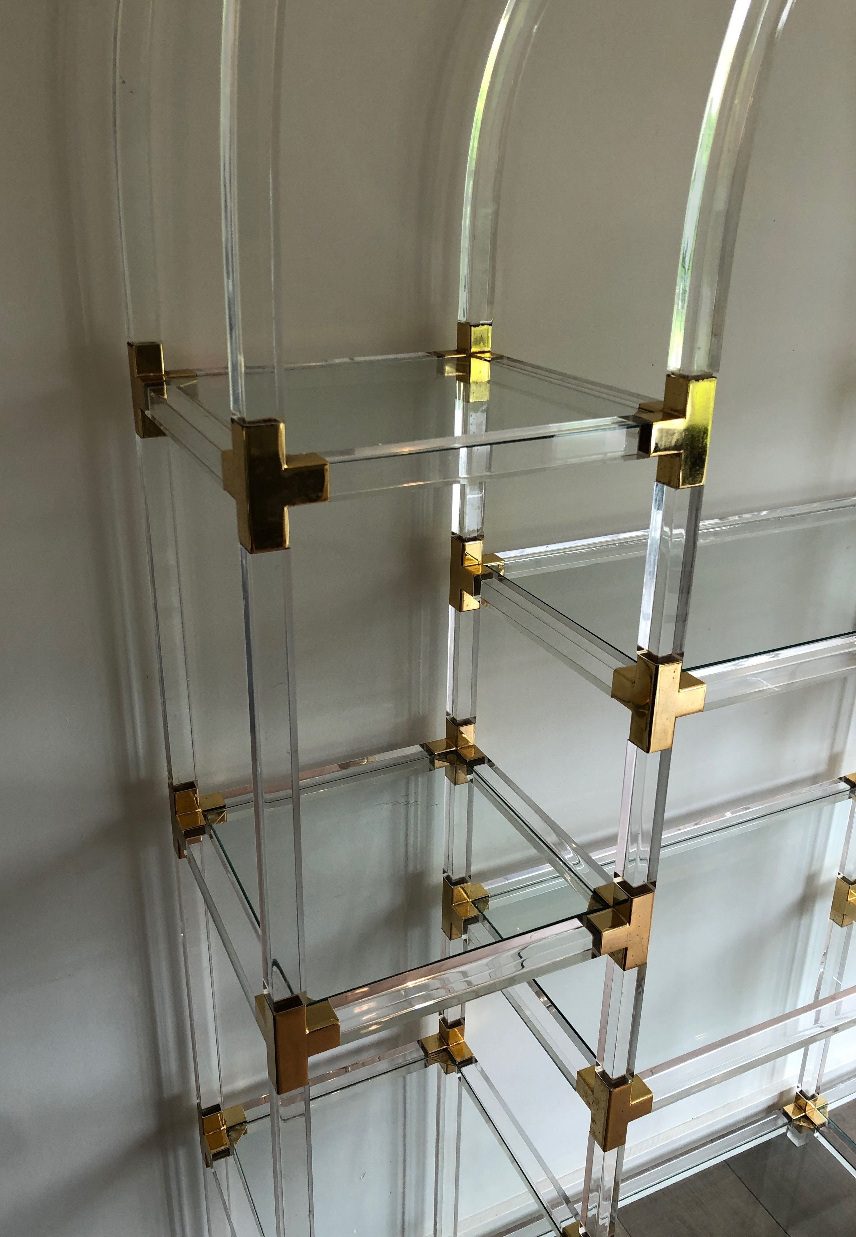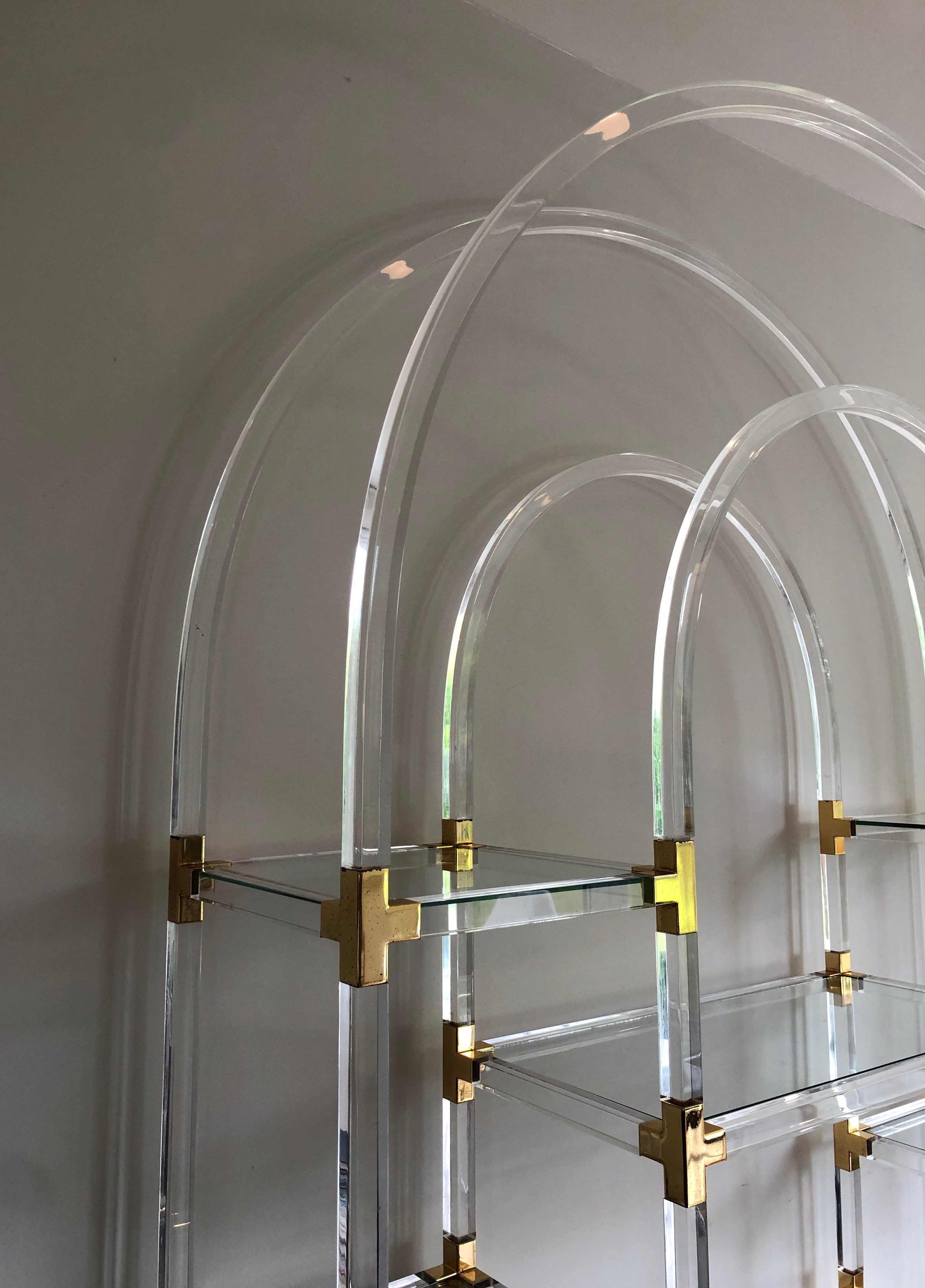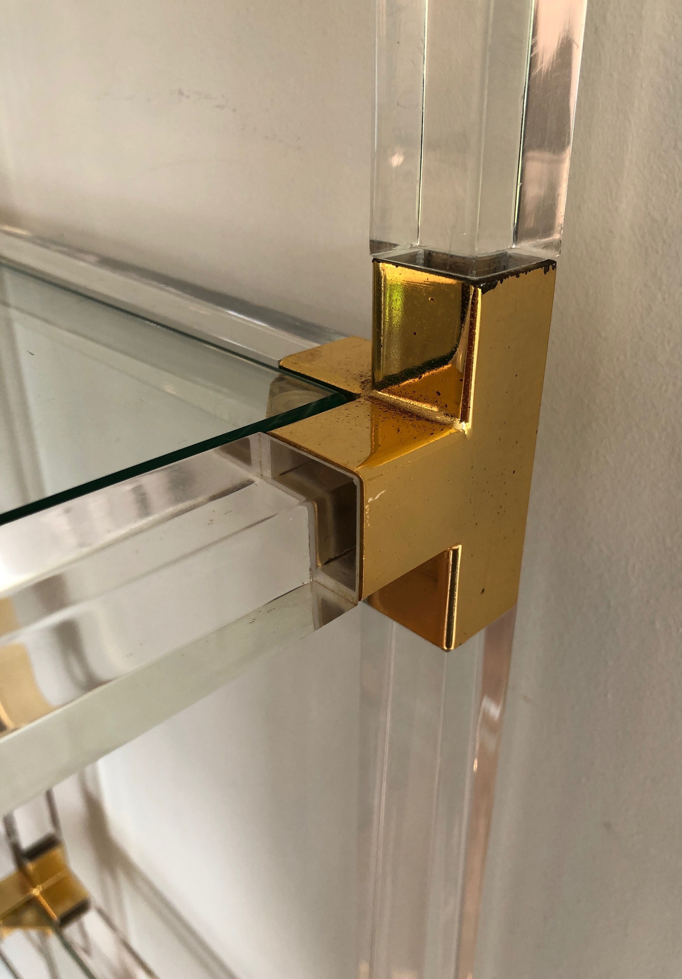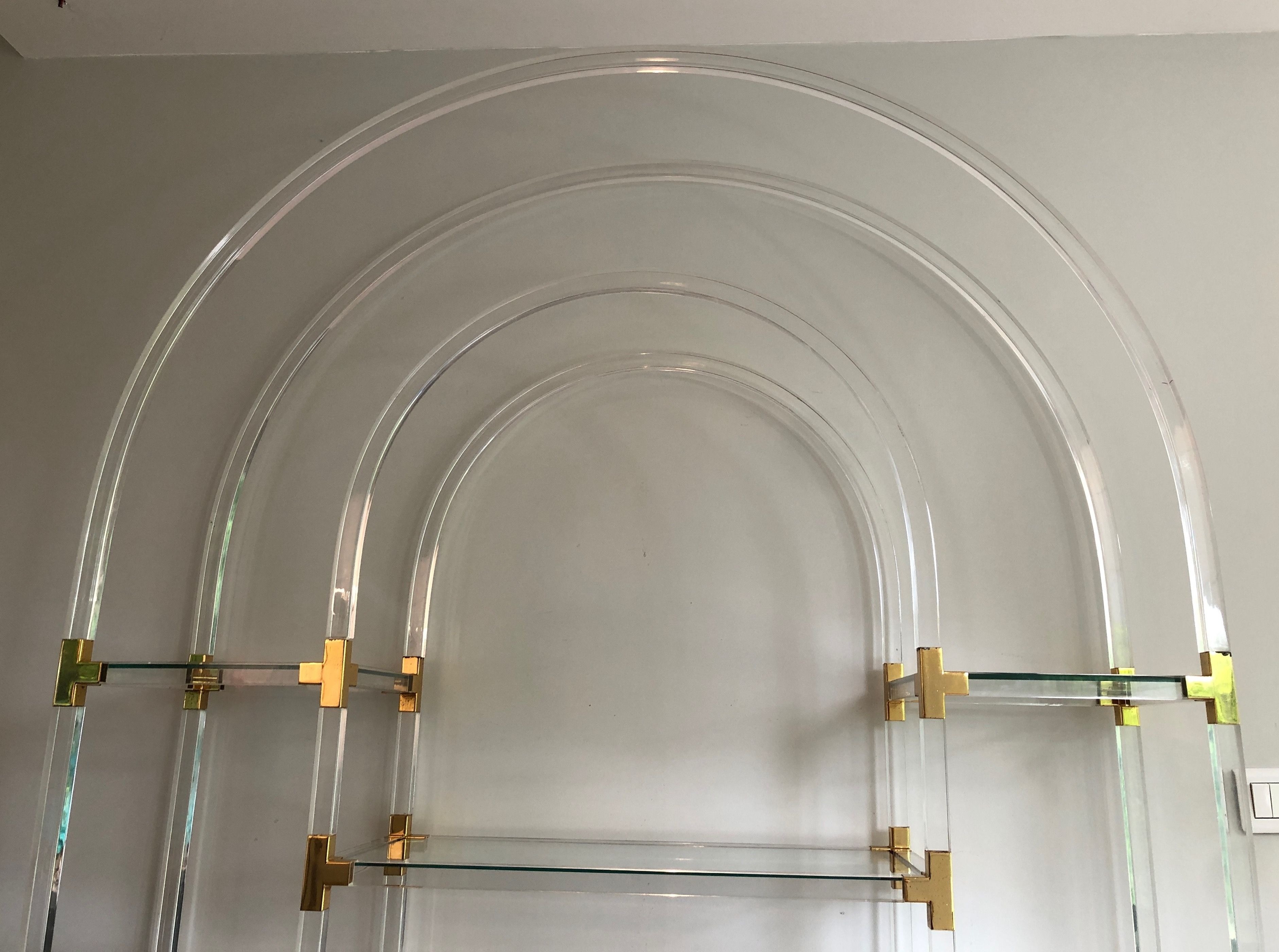 A superb shelving unit by Charles Hollis Jones, this piece exemplifies the designer's celebrated mastery of transparent and reflective materials. Constructed from lucite — the acrylic resin known commercially as Plexiglas, prized for its glass-like clarity and structural versatility — in combination with gilded metal supports and glass shelves, it achieves a remarkable visual weightlessness. Objects displayed upon its surfaces appear to float in mid-air, while the gilded metal hardware provides a note of Hollywood luxury that was the hallmark of Jones's signature aesthetic.