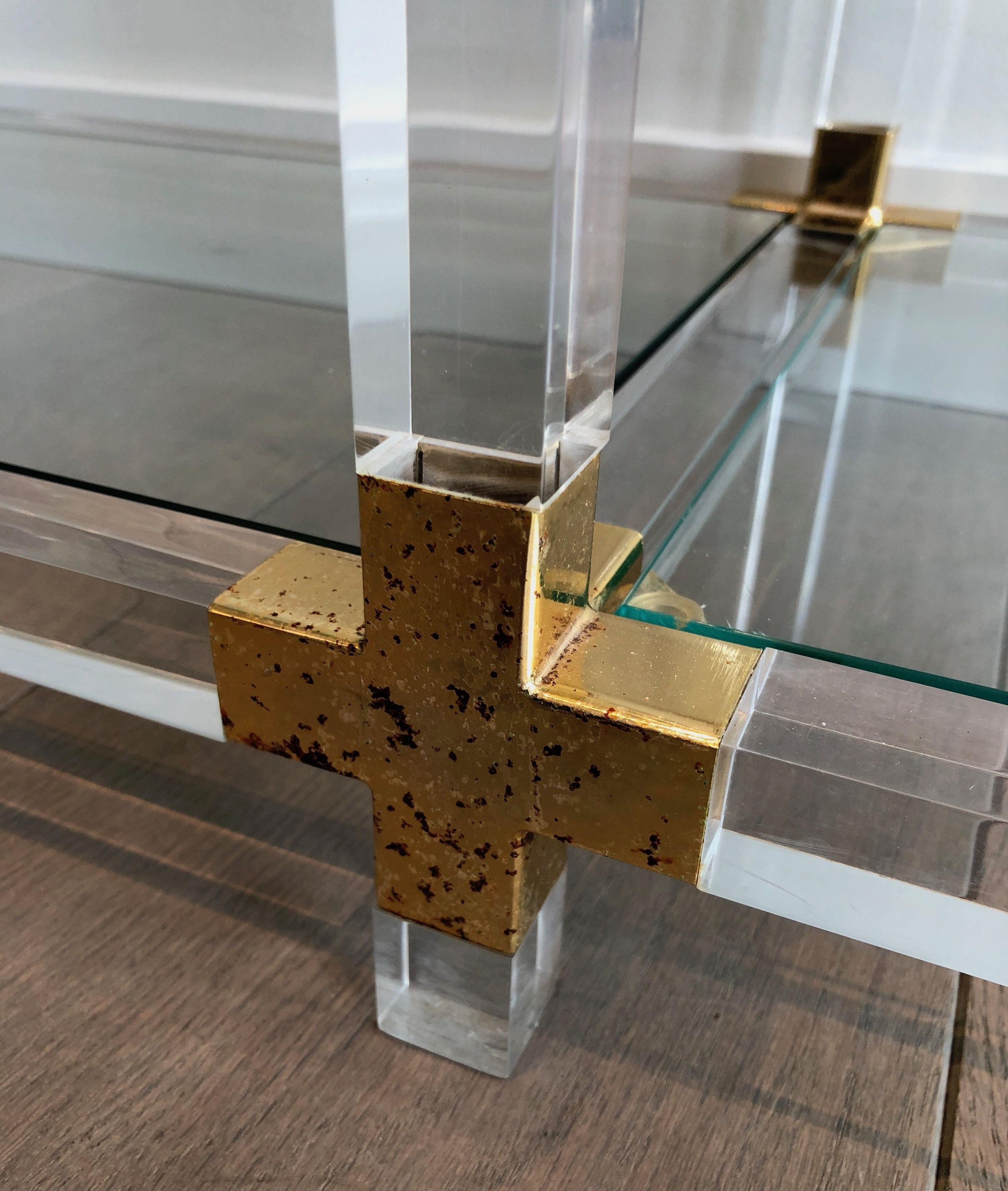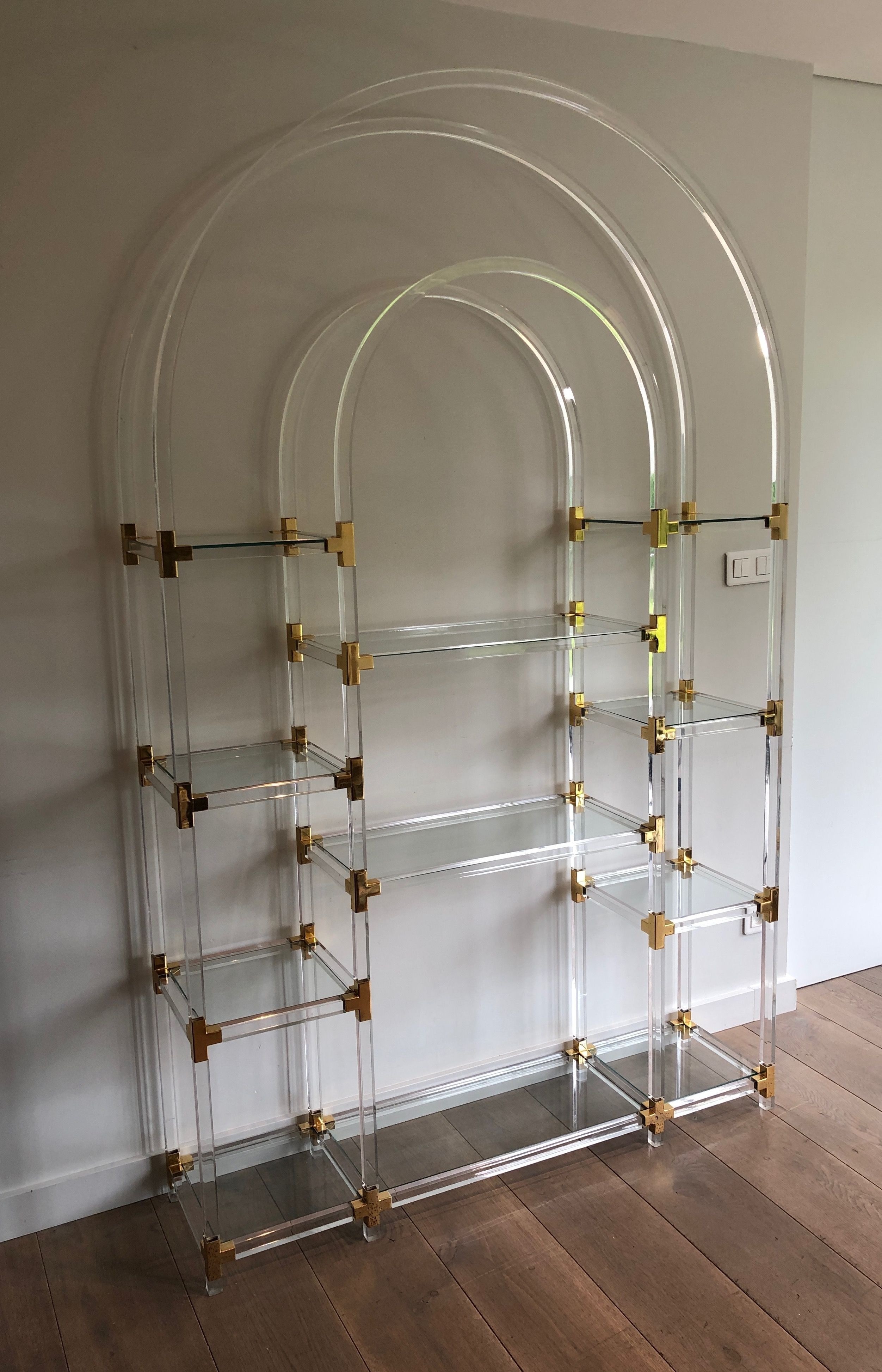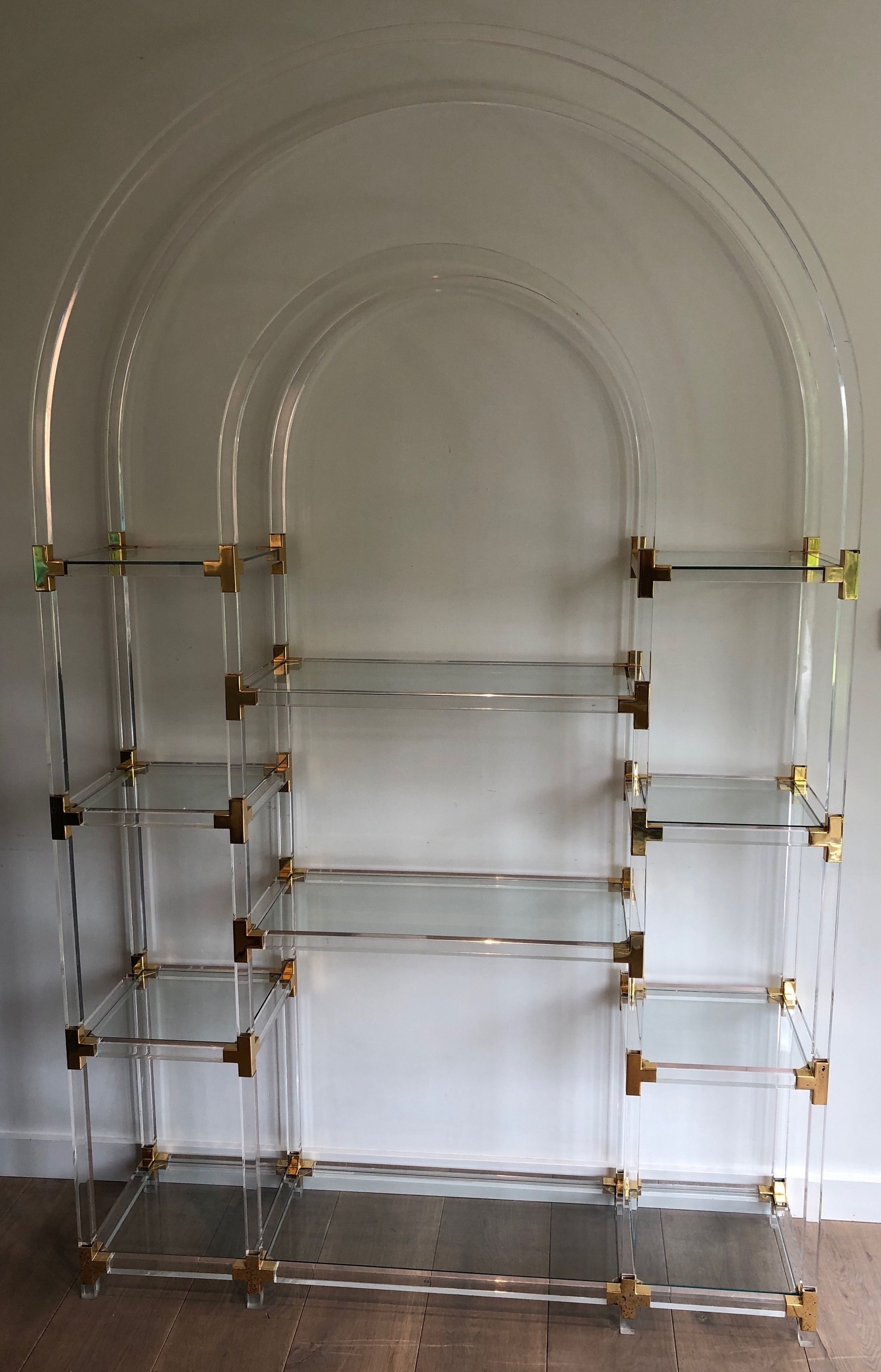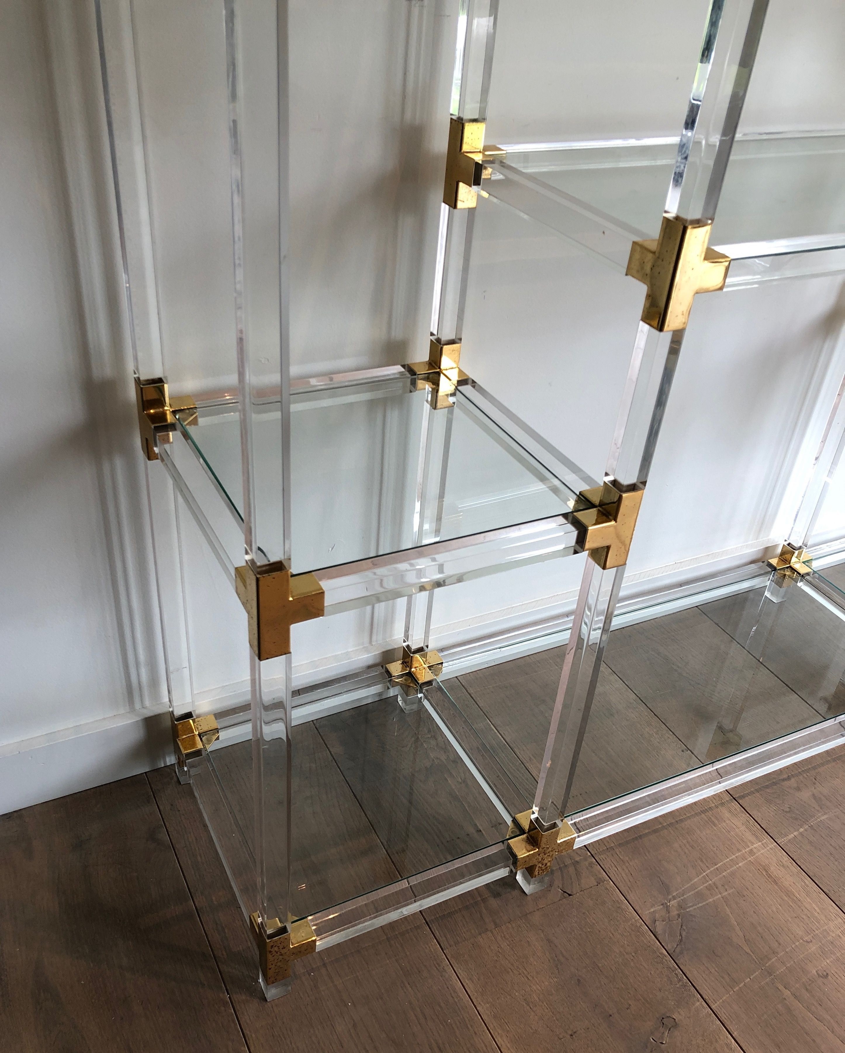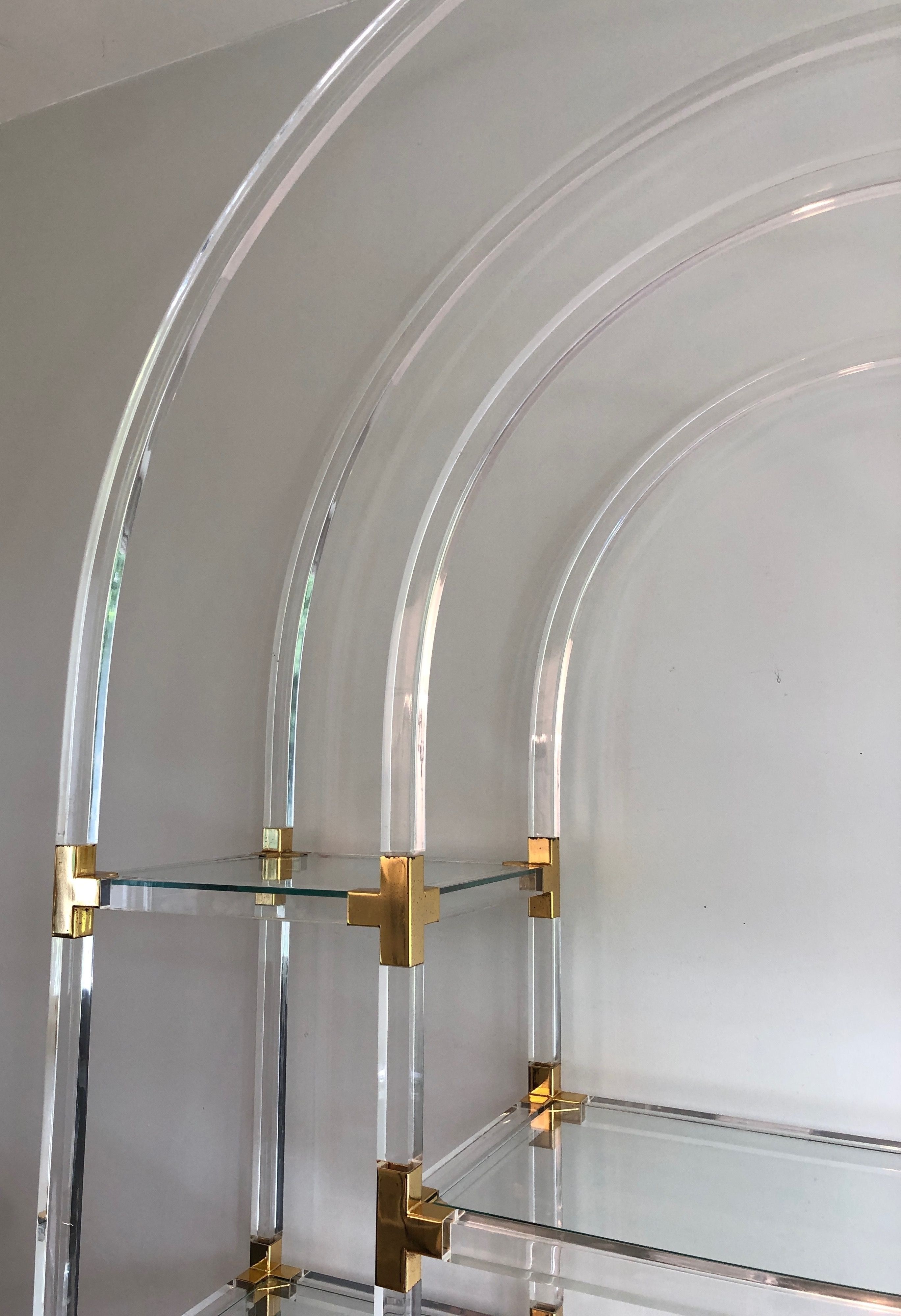 A superb shelving unit by Charles Hollis Jones, this piece exemplifies the designer's celebrated mastery of transparent and reflective materials. Constructed from lucite — the acrylic resin known commercially as Plexiglas, prized for its glass-like clarity and structural versatility — in combination with gilded metal supports and glass shelves, it achieves a remarkable visual weightlessness. Objects displayed upon its surfaces appear to float in mid-air, while the gilded metal hardware provides a note of Hollywood luxury that was the hallmark of Jones's signature aesthetic.