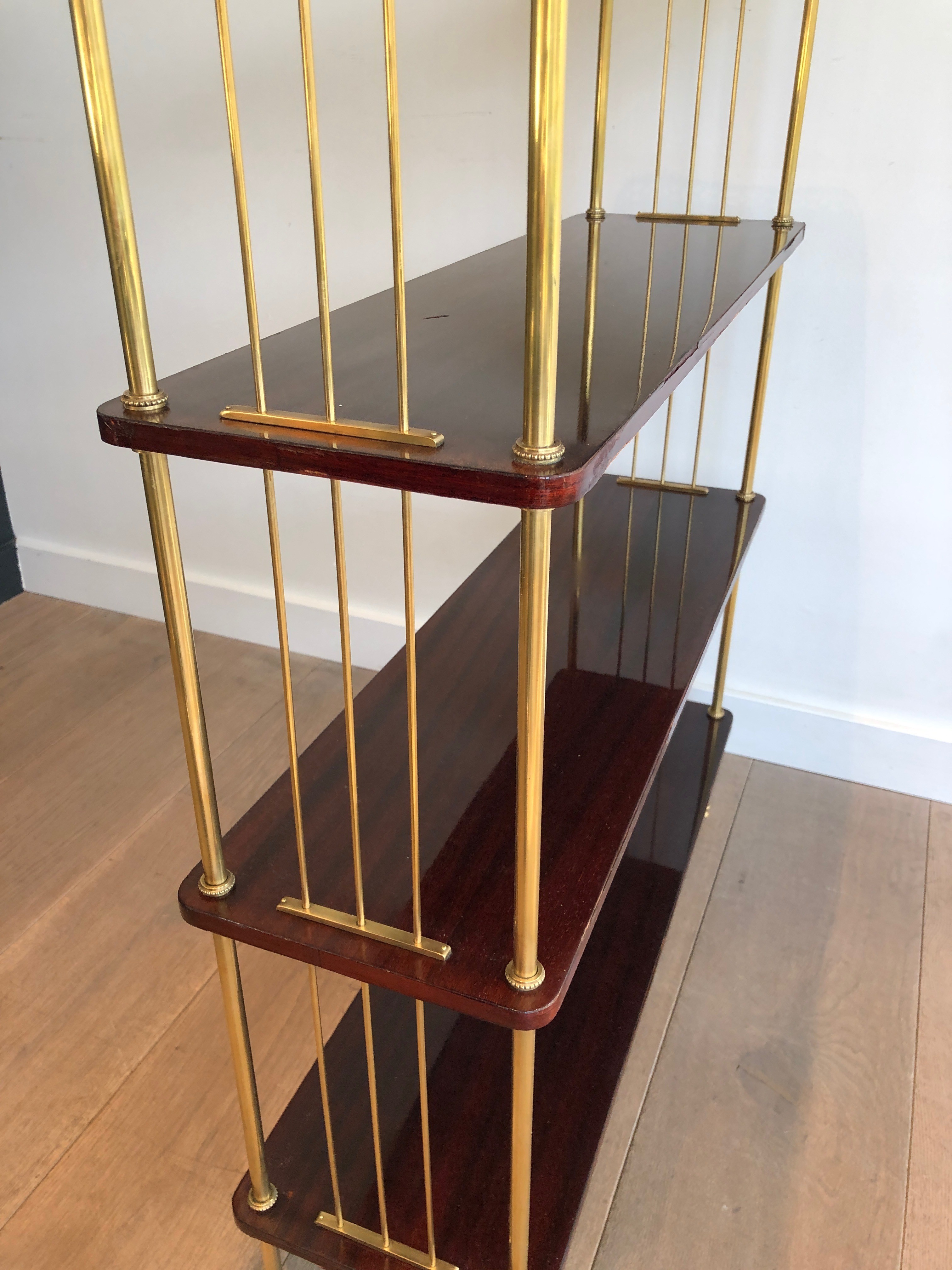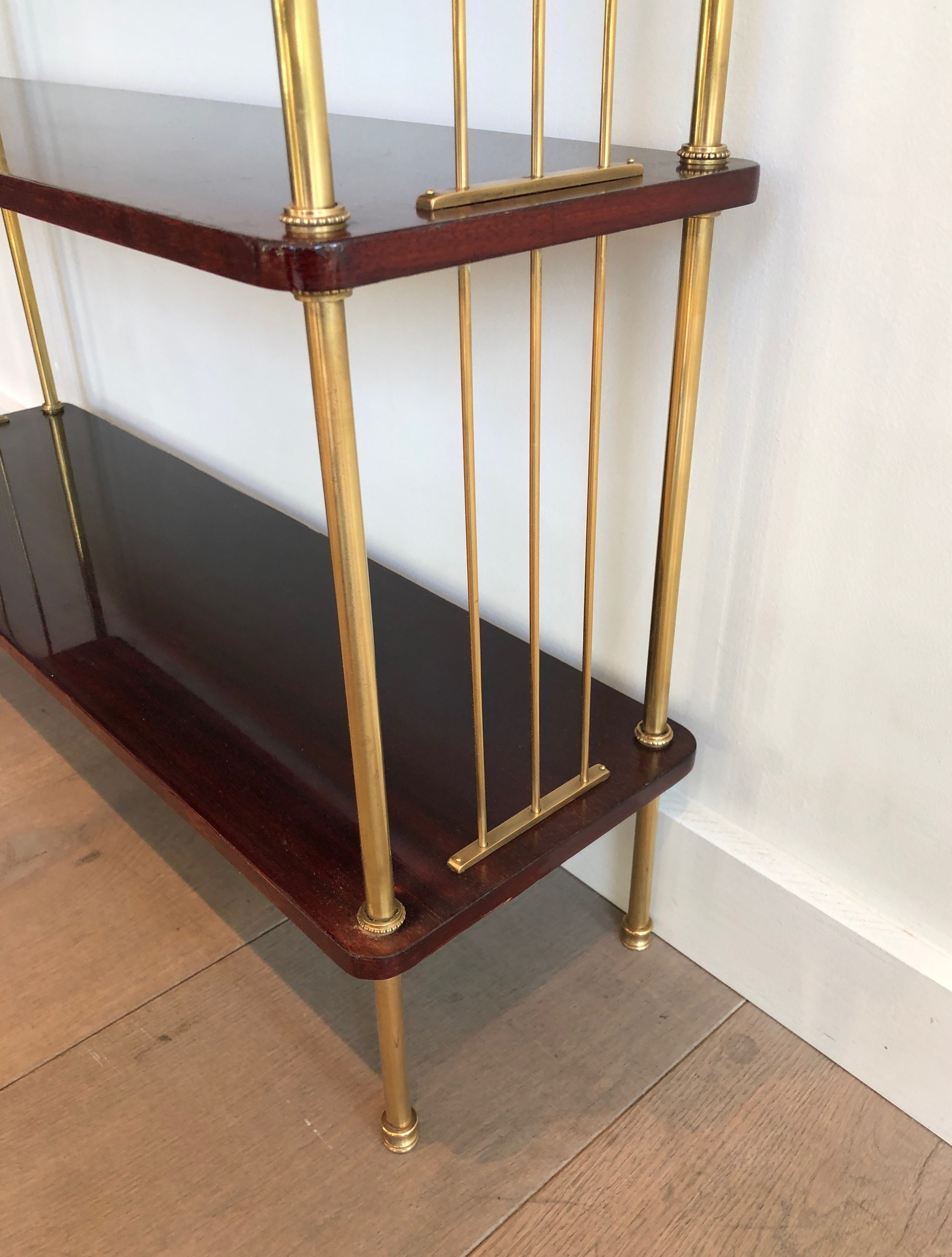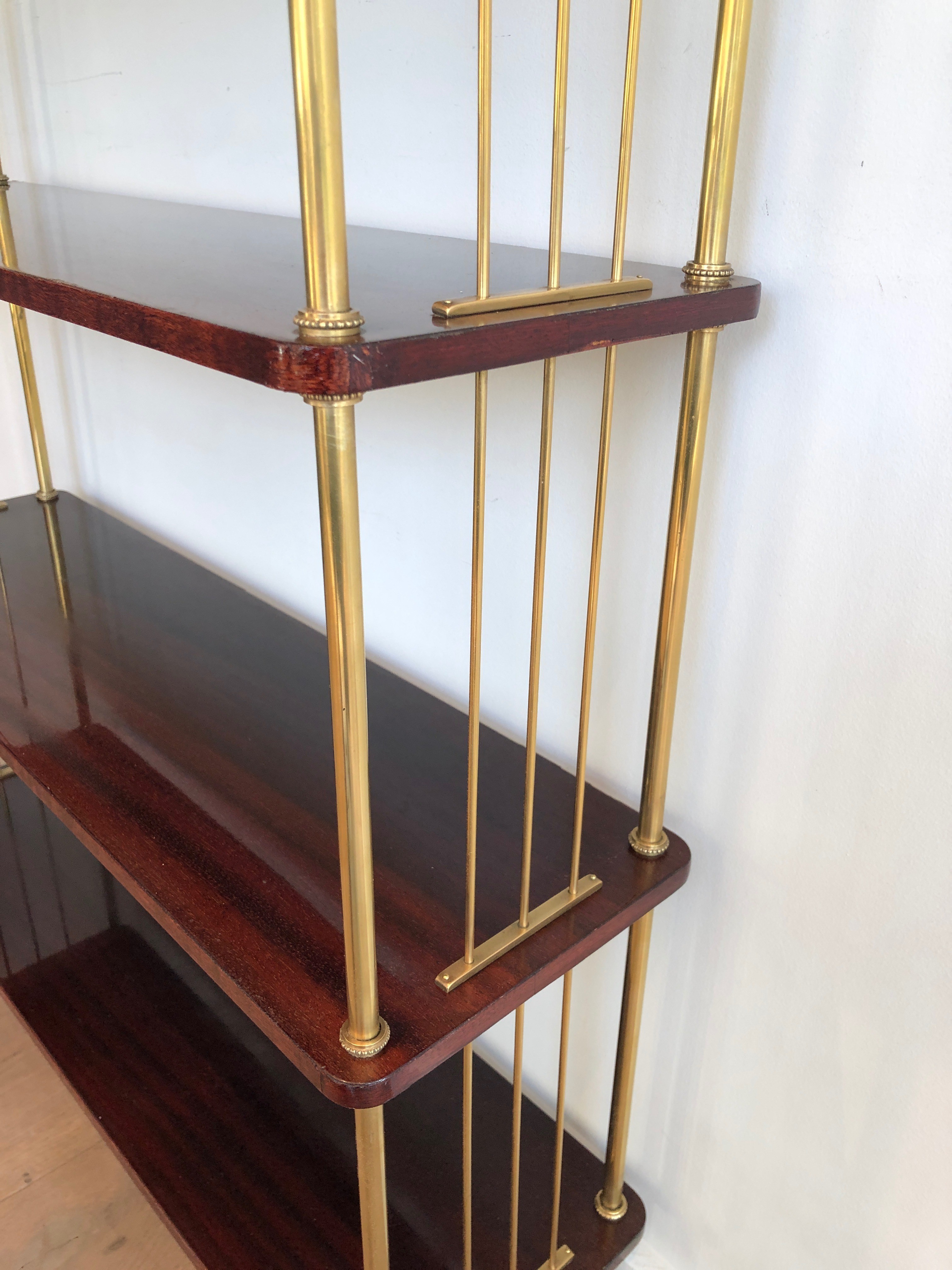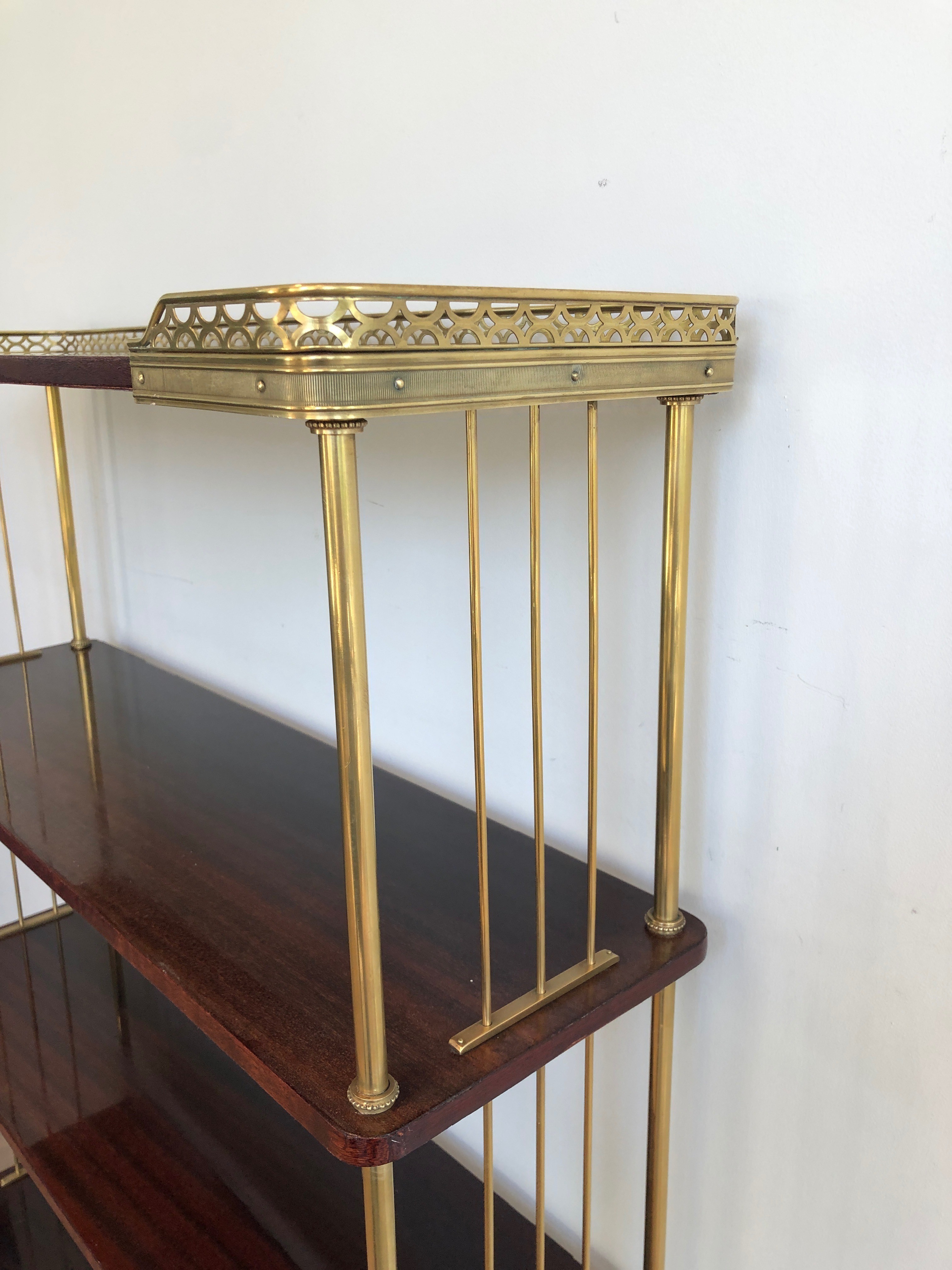 A distinguished shelves unit of neoclassical form, constructed with uprights and structural elements in polished brass and shelves in rich dark mahogany. The vertical brass columns, slender and precisely finished, frame the mahogany shelves with architectural authority, the whole creating a composition of elegant simplicity in which the warmth of the wood and the lustrous gold of the metal complement one another with great refinement. The overall structure, proportioned with the rigorous attention to balance that characterises the finest Parisian furniture of the period, conveys an impression of ordered luxury.