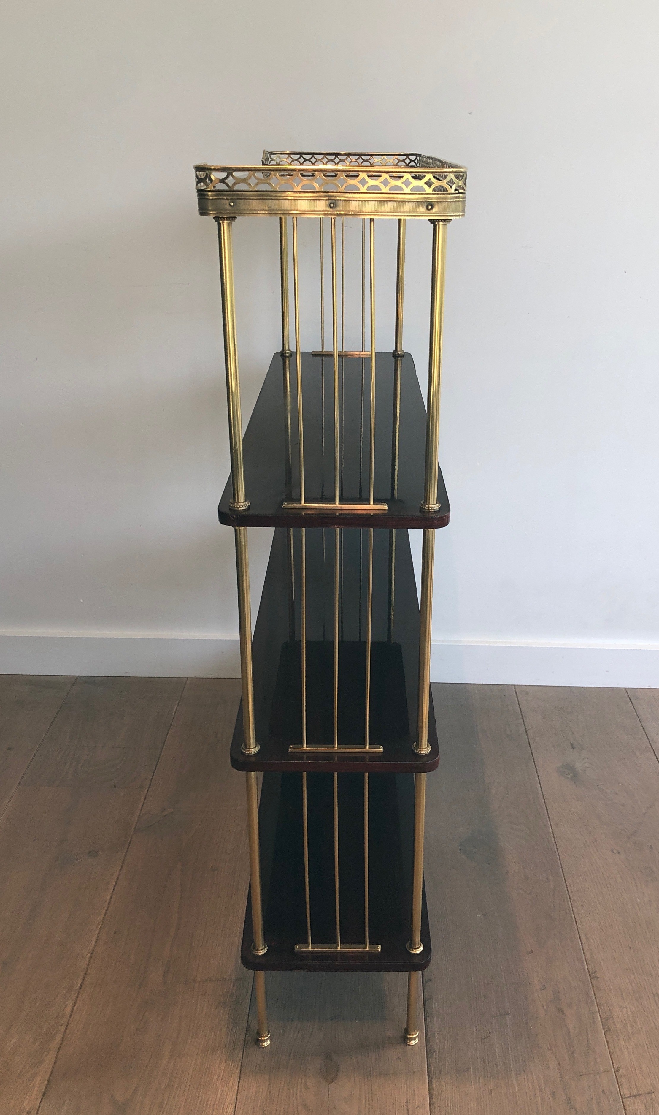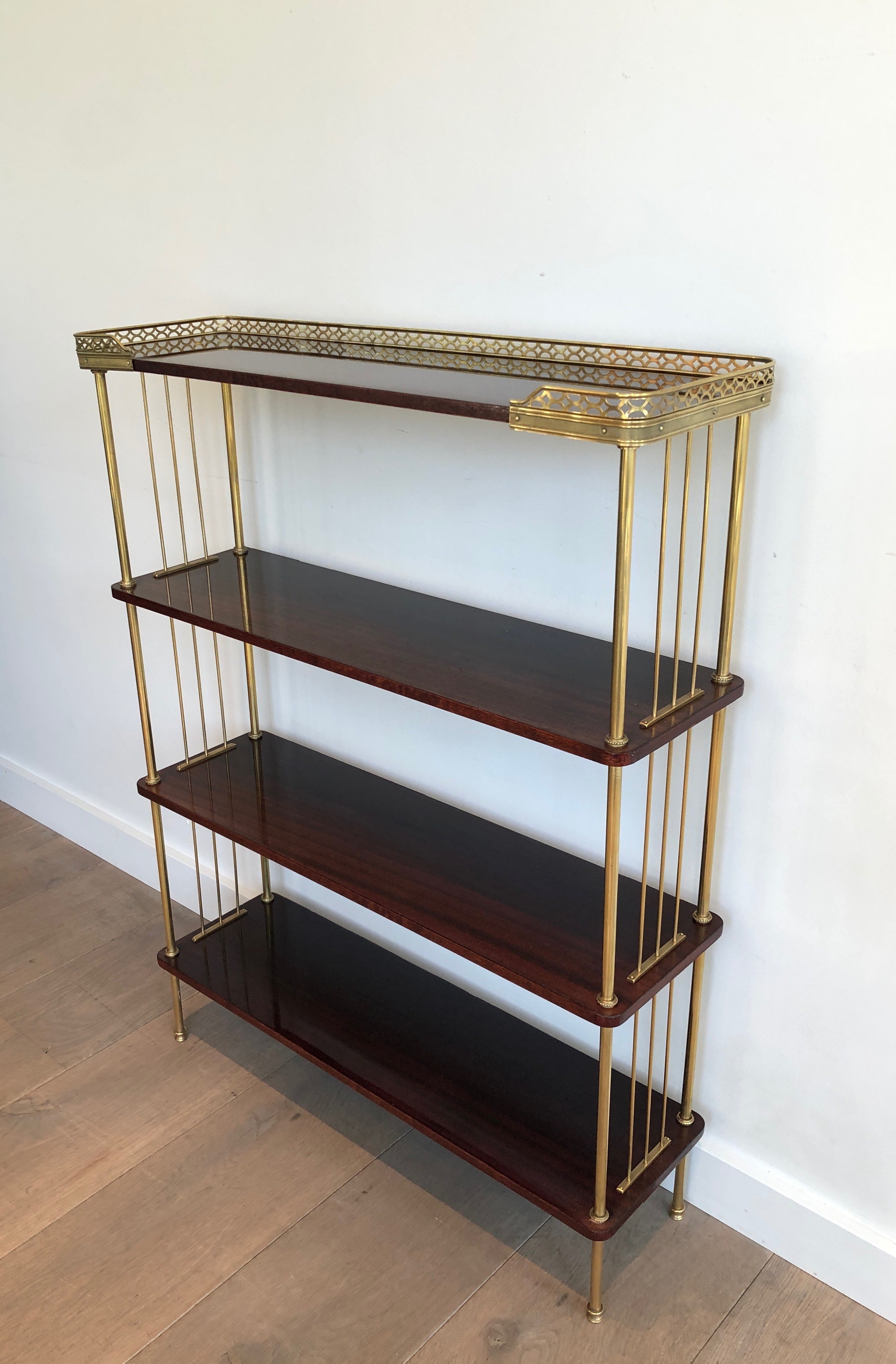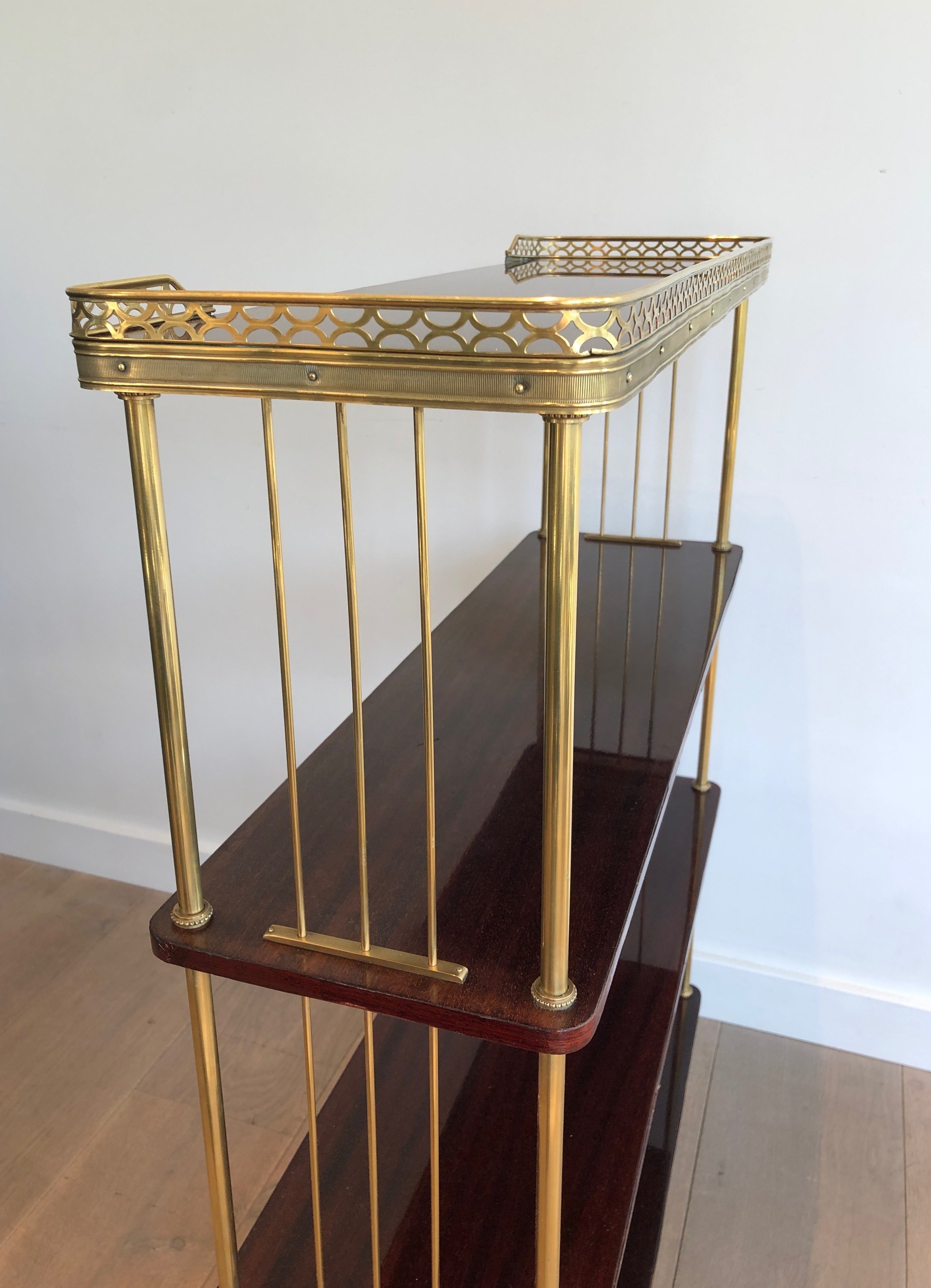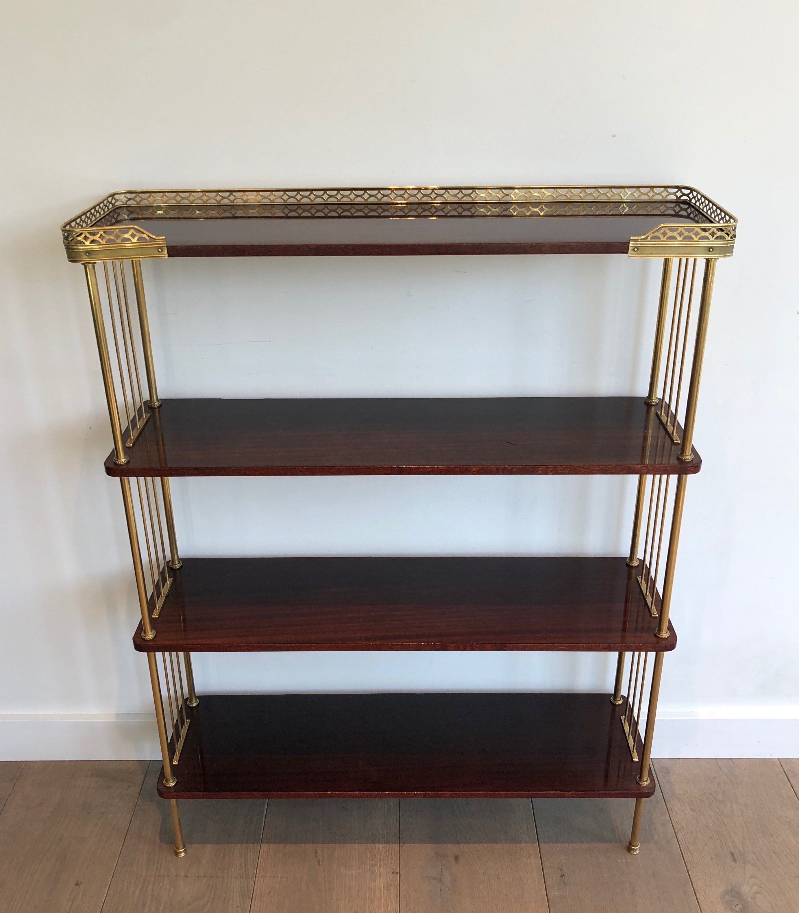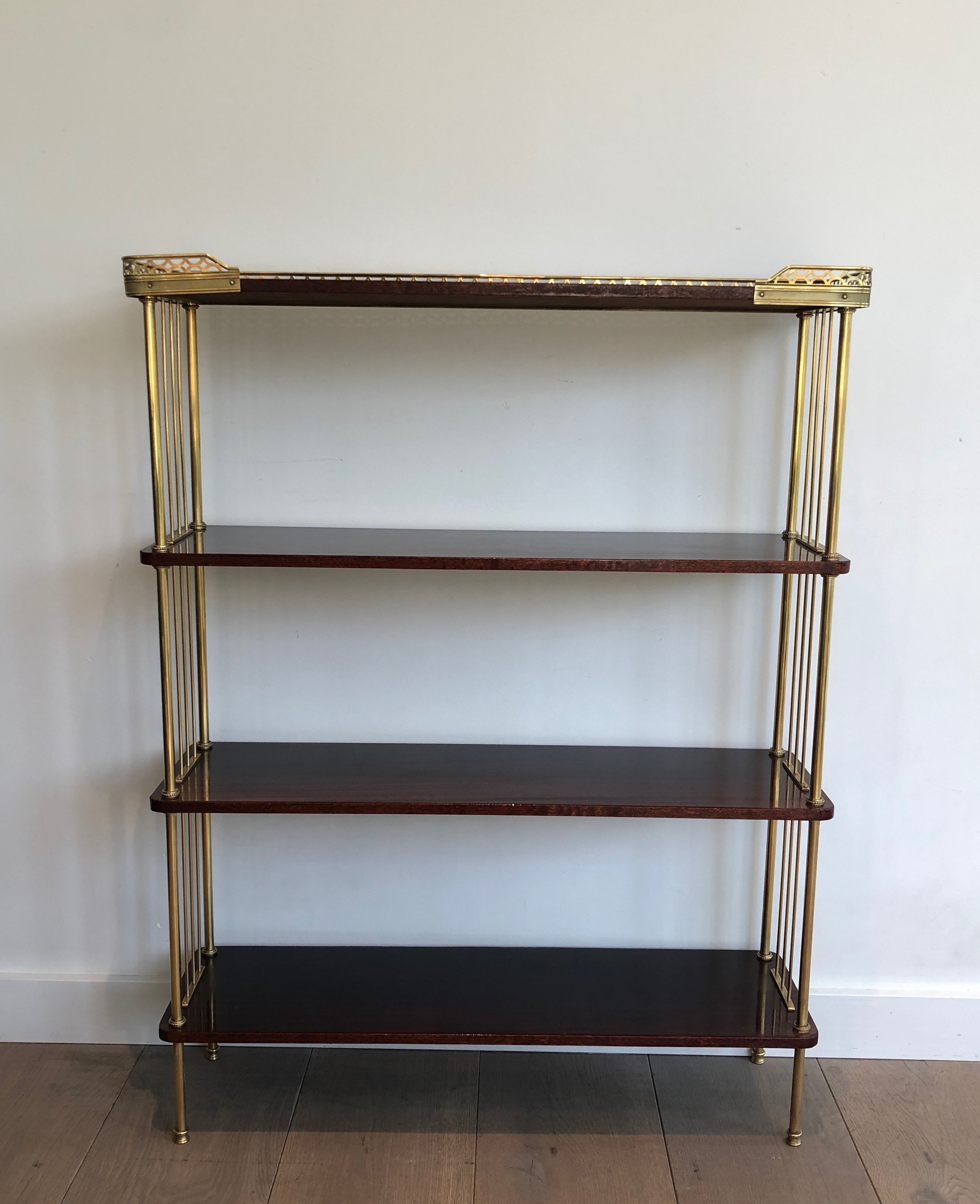 A distinguished shelves unit of neoclassical form, constructed with uprights and structural elements in polished brass and shelves in rich dark mahogany. The vertical brass columns, slender and precisely finished, frame the mahogany shelves with architectural authority, the whole creating a composition of elegant simplicity in which the warmth of the wood and the lustrous gold of the metal complement one another with great refinement. The overall structure, proportioned with the rigorous attention to balance that characterises the finest Parisian furniture of the period, conveys an impression of ordered luxury.