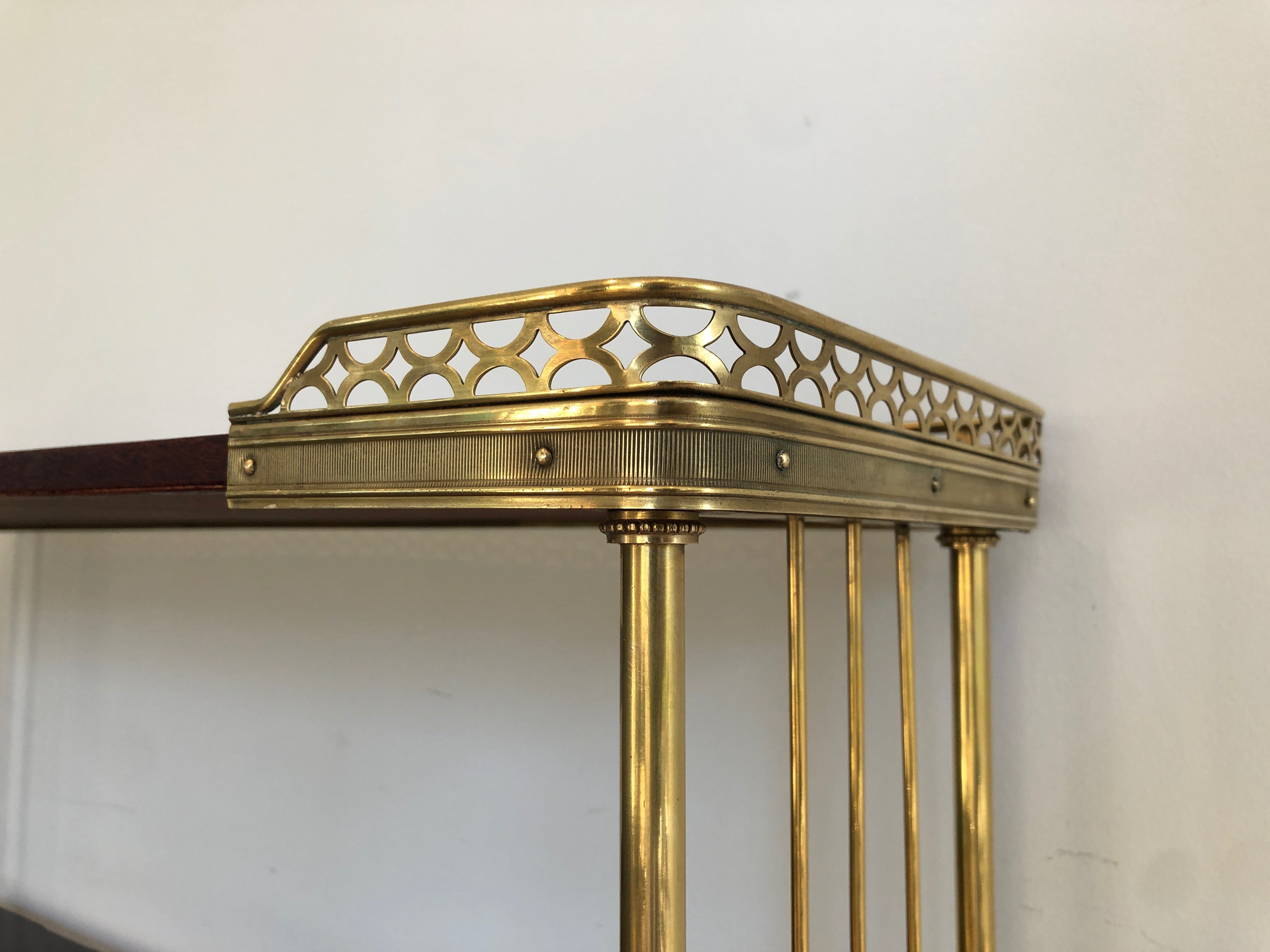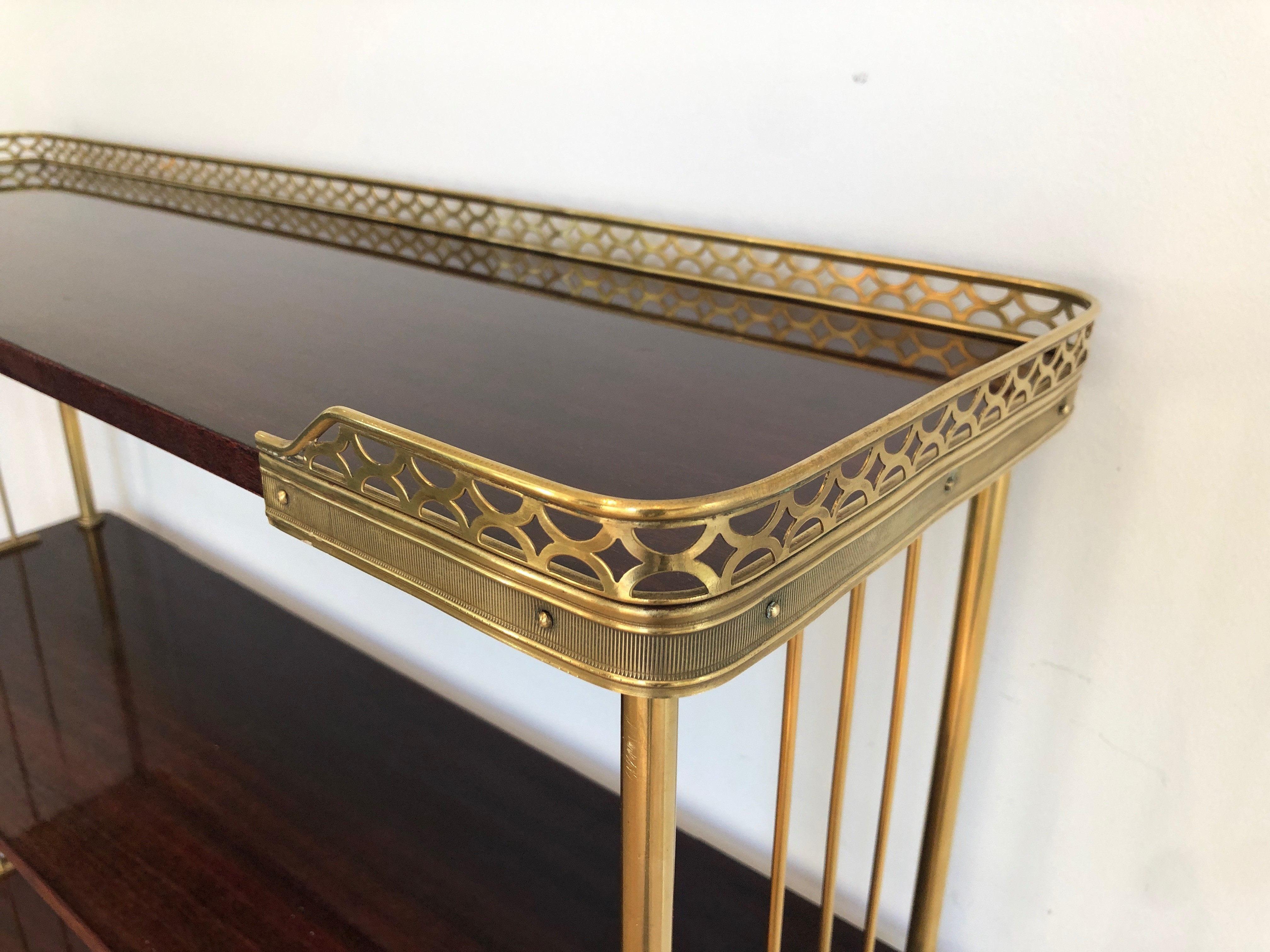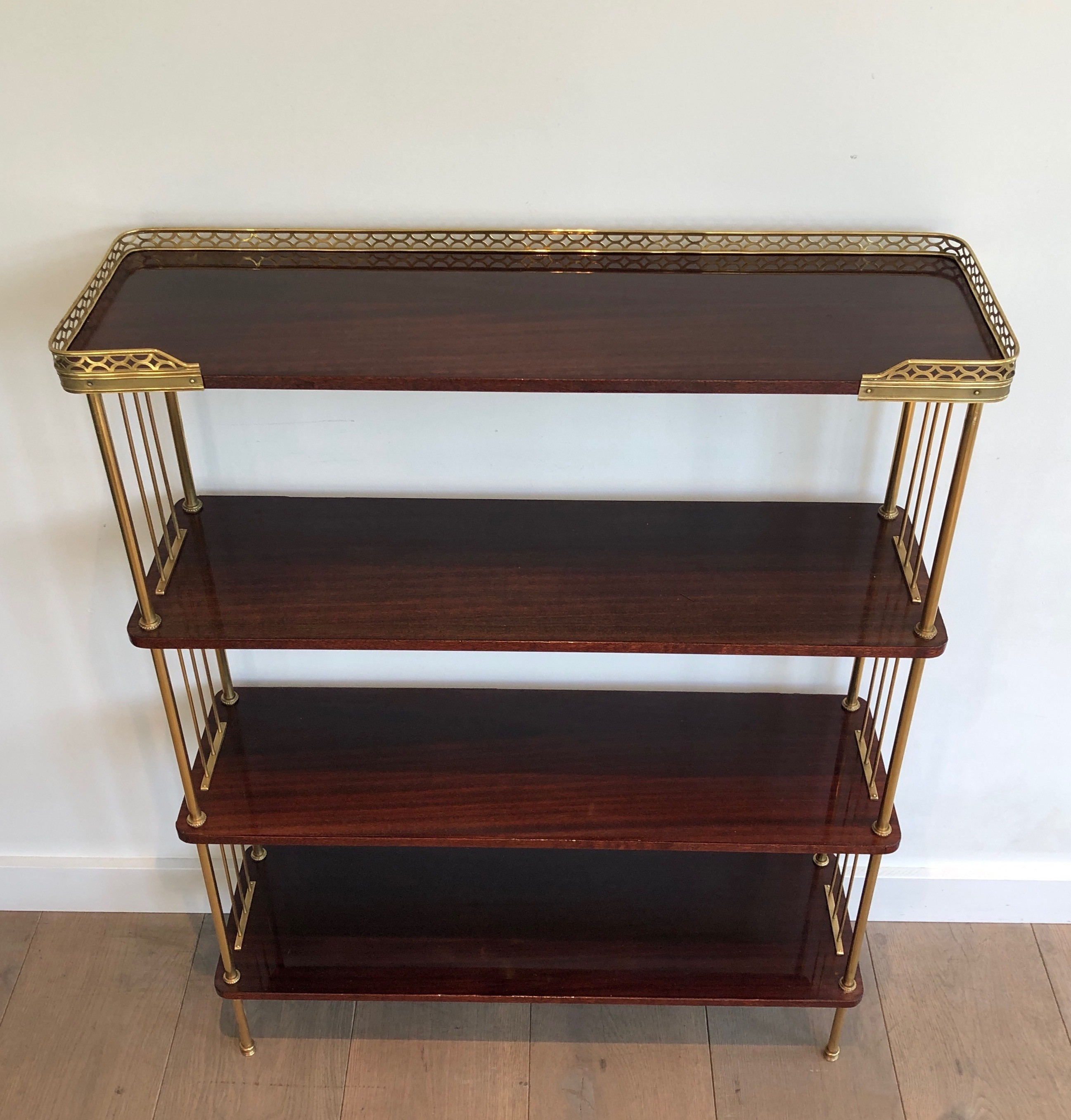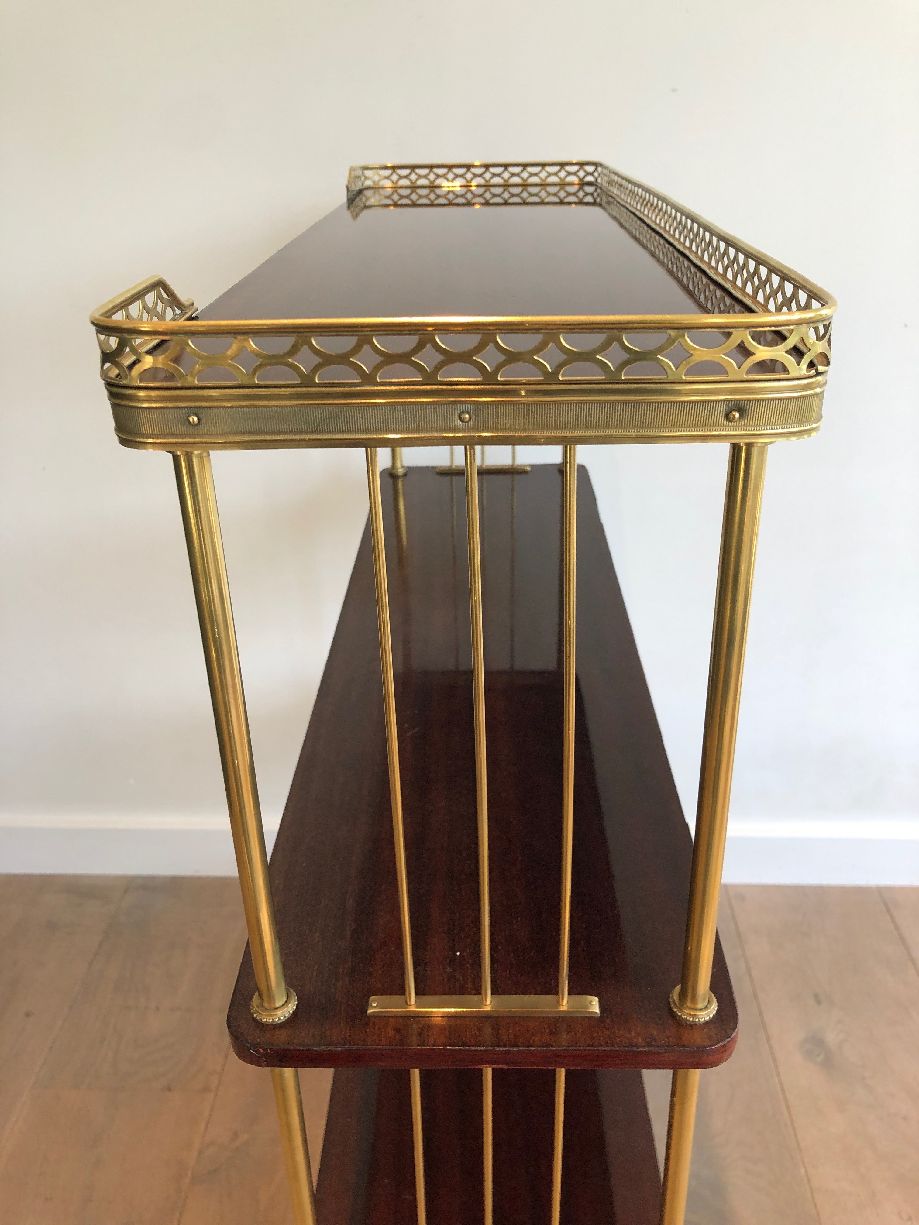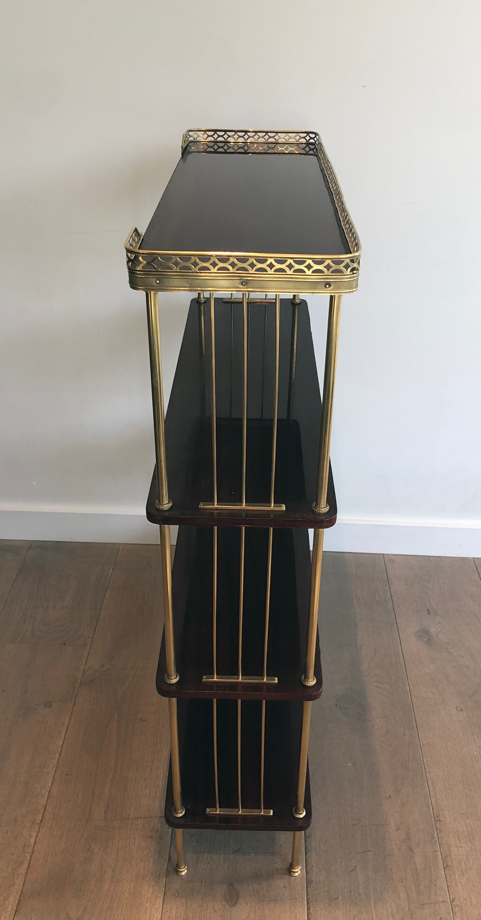 An étagère of this quality serves with equal distinction as a display piece for books, objects, or porcelain, a library shelving unit, or a refined accent piece in an entrance hall or living room. The interplay of dark mahogany and gleaming brass creates a visual richness that asserts itself in any interior, from the most formal classical salon to a contemporary space enhanced by historical notes. A supremely elegant and practical piece bearing the hallmark quality of one of the great names in French interior decoration.