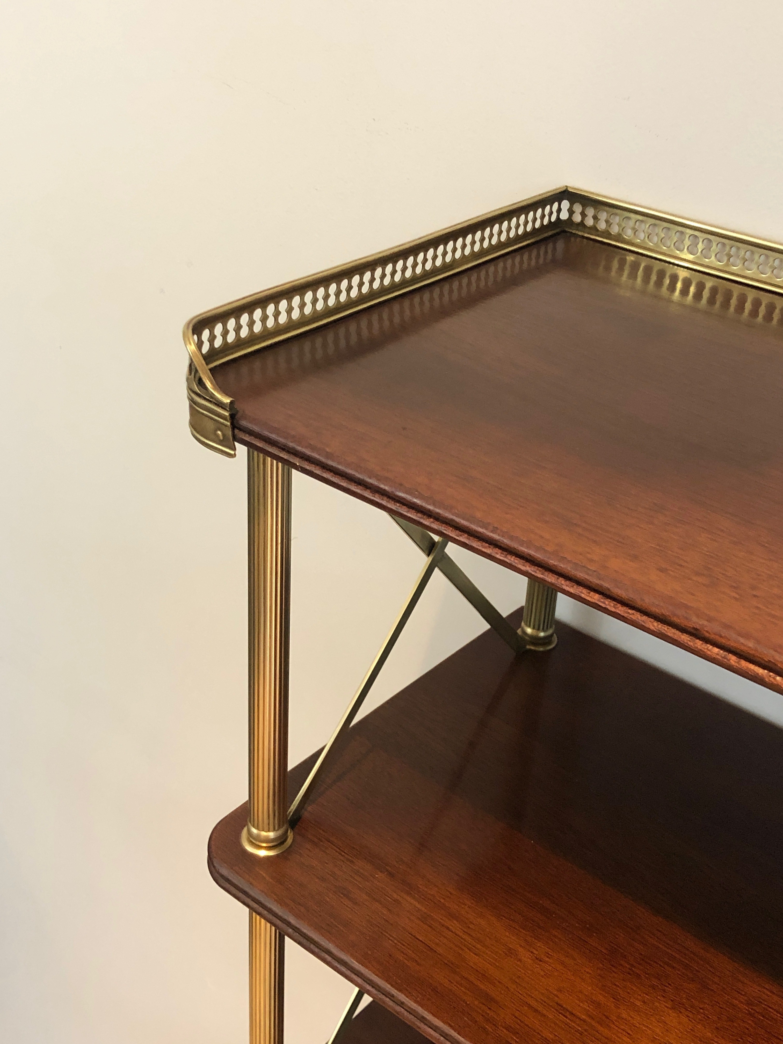 Maison Jansen's étagères and shelving units from this period are among the most coveted in the corpus of French mid-century decorative furniture, for they represent the house's particular genius for combining historical seriousness with contemporary utility. The choice of mahogany — with its associations of the grandes bibliothèques of the Ancien Régime and the directorial studies of the Empire — in combination with polished brass gives the piece a dual authority: it belongs simultaneously to the world of serious collecting and to the world of living beautifully. These were pieces made to be used as much as admired, and they repay daily acquaintance with the quiet pleasure that only genuinely beautiful objects provide.