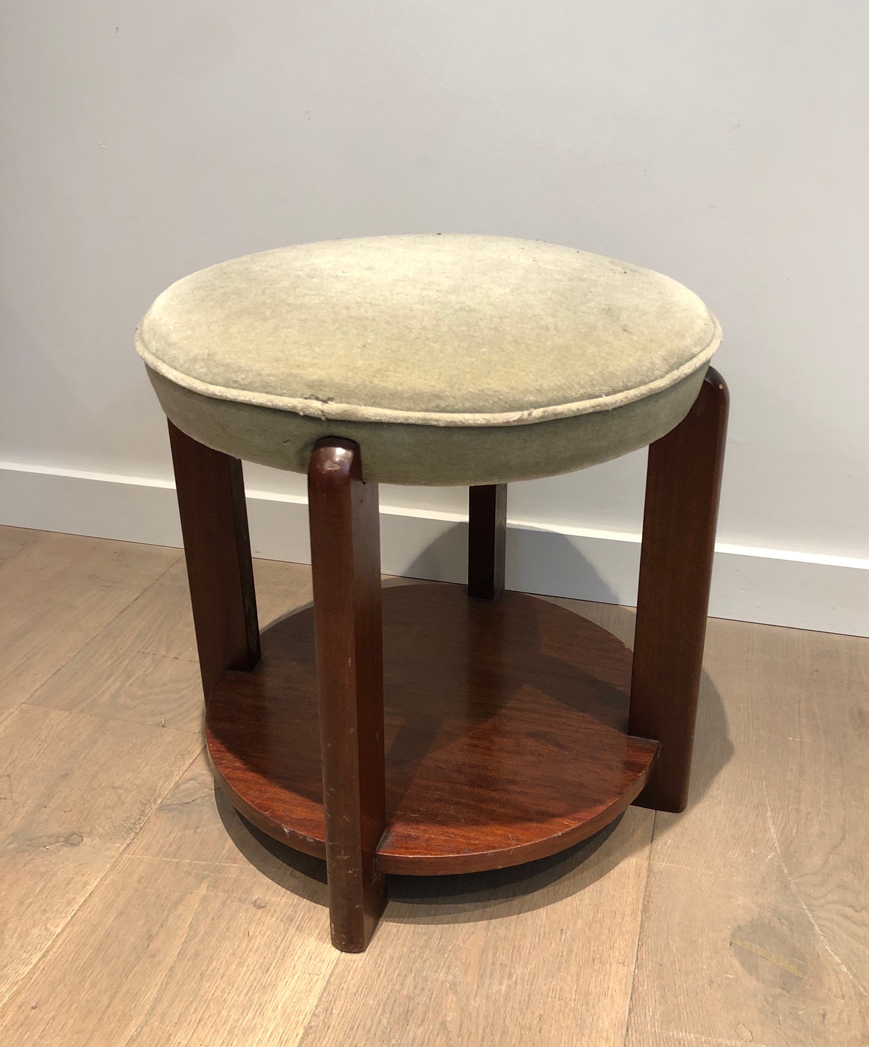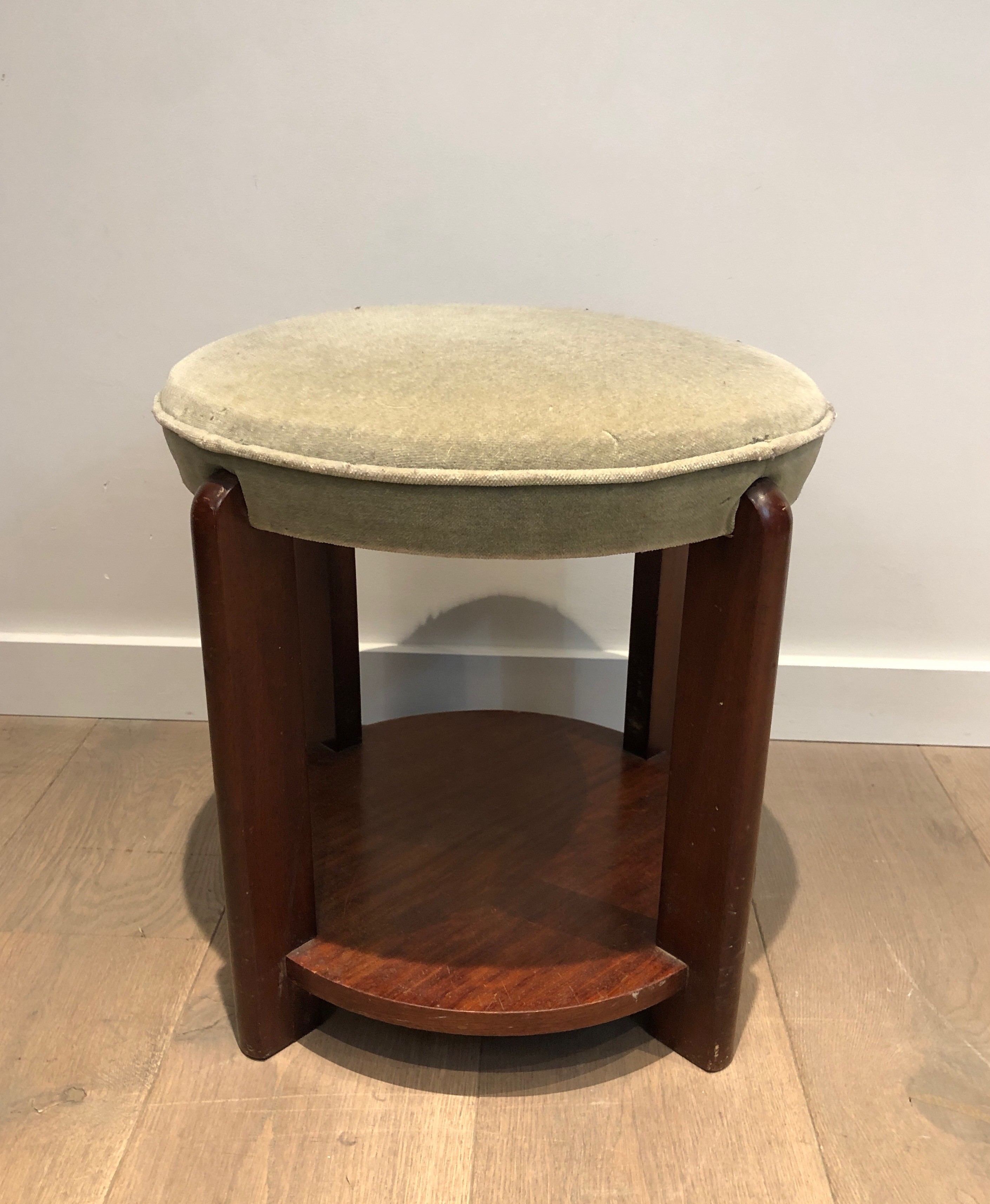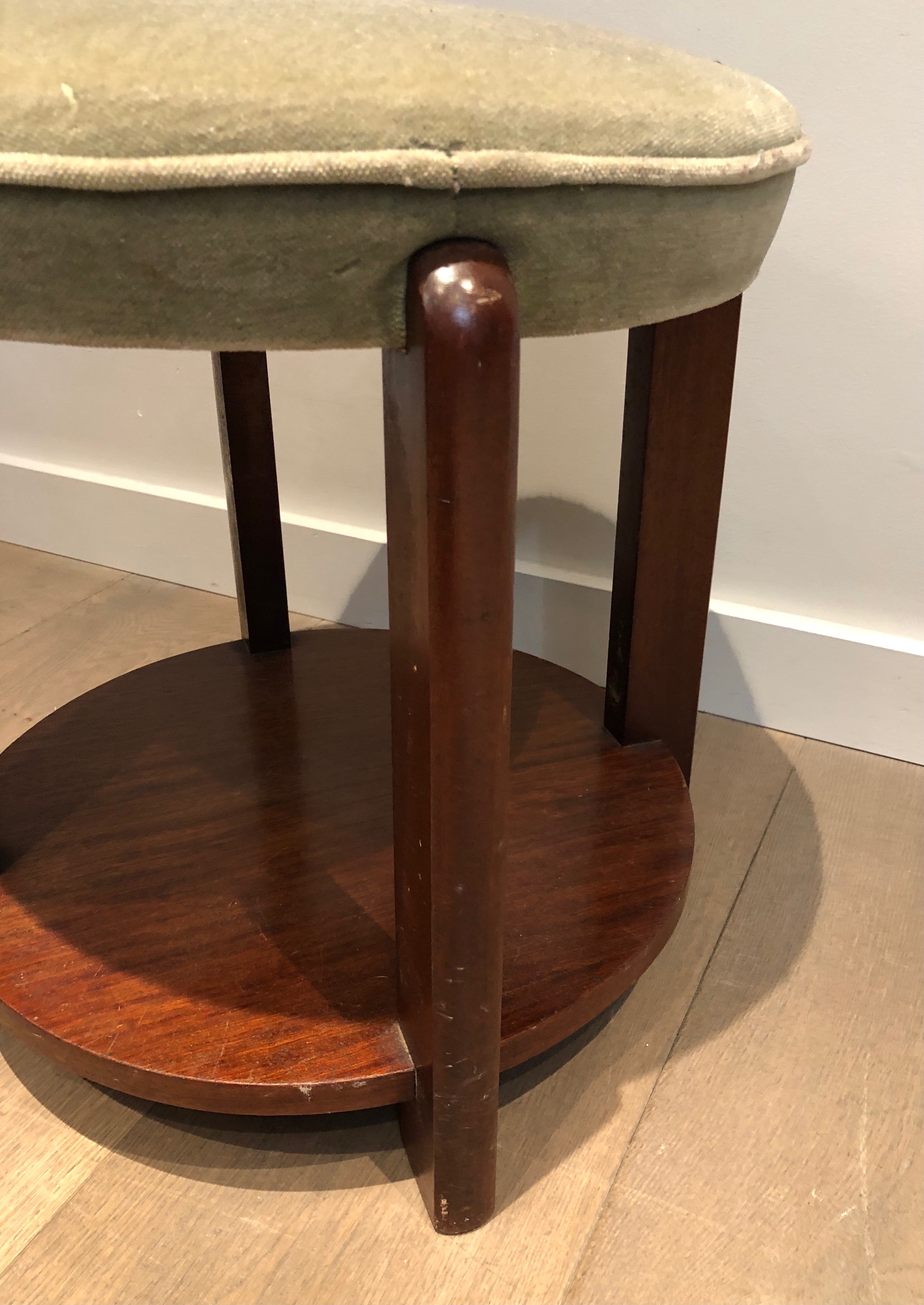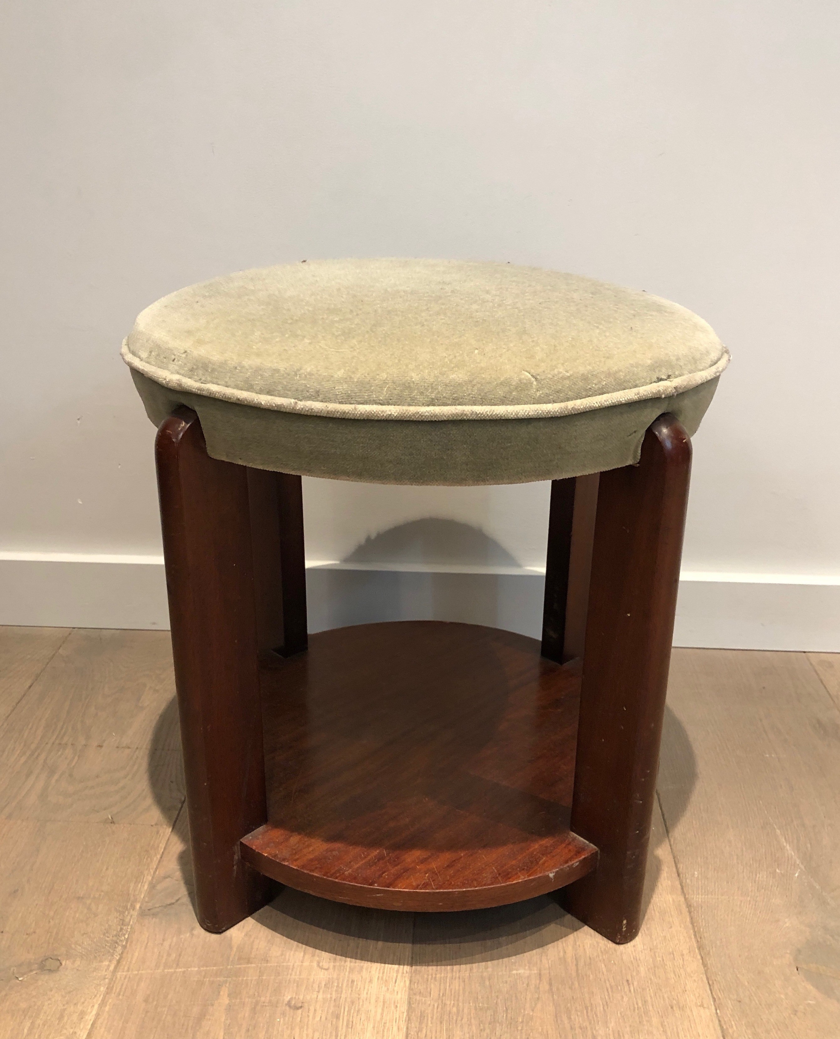 Presented in good condition consistent with its age, this mahogany and velvet stool is a versatile piece that would serve as a bedroom banquette, a sculptural accent, or a low side table in any interior. Its compact dimensions and period character make it equally well suited to a period apartment as to a contemporary setting seeking warmth and historical depth. Dimensions: 48 × 48 × 45 cm.