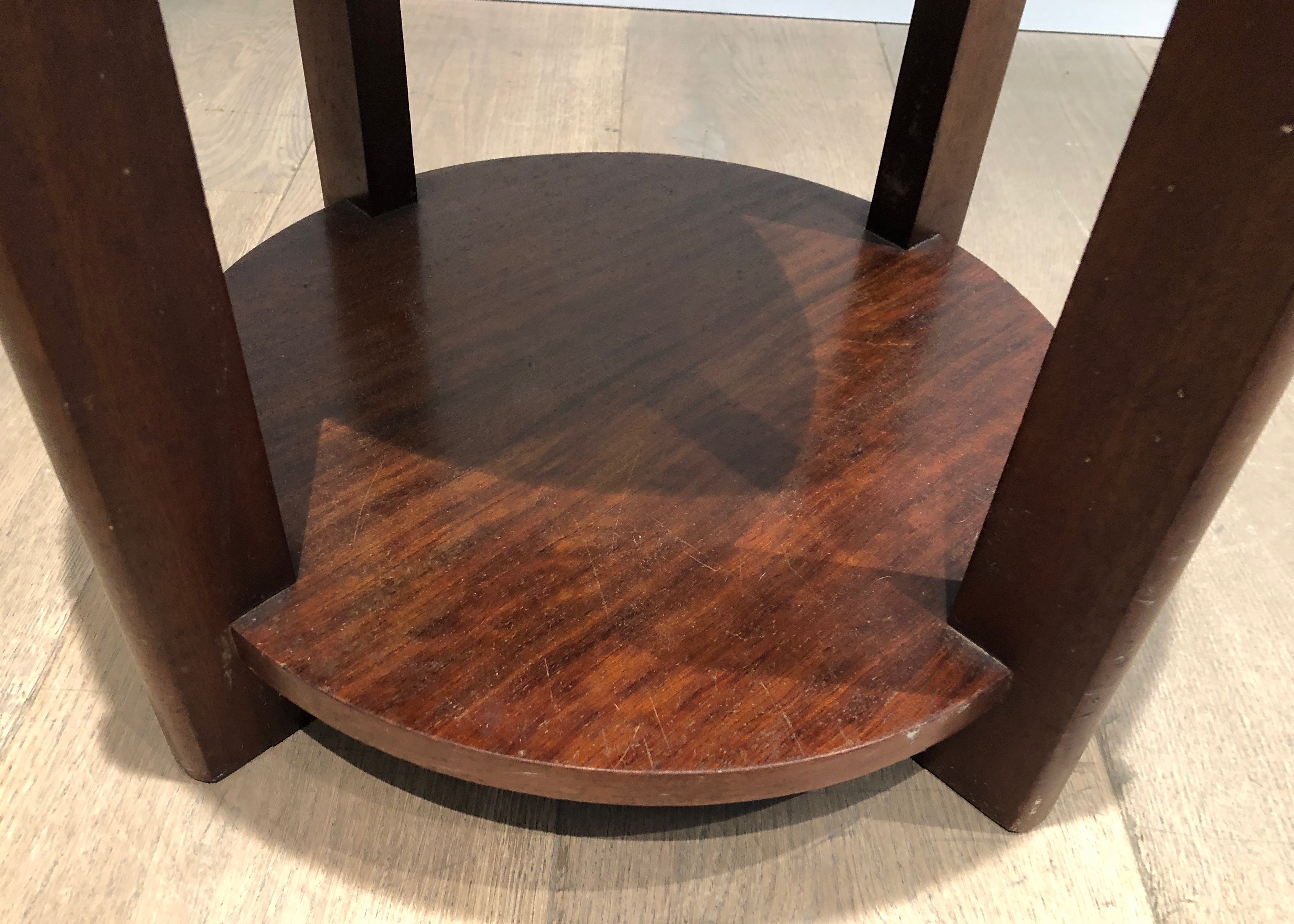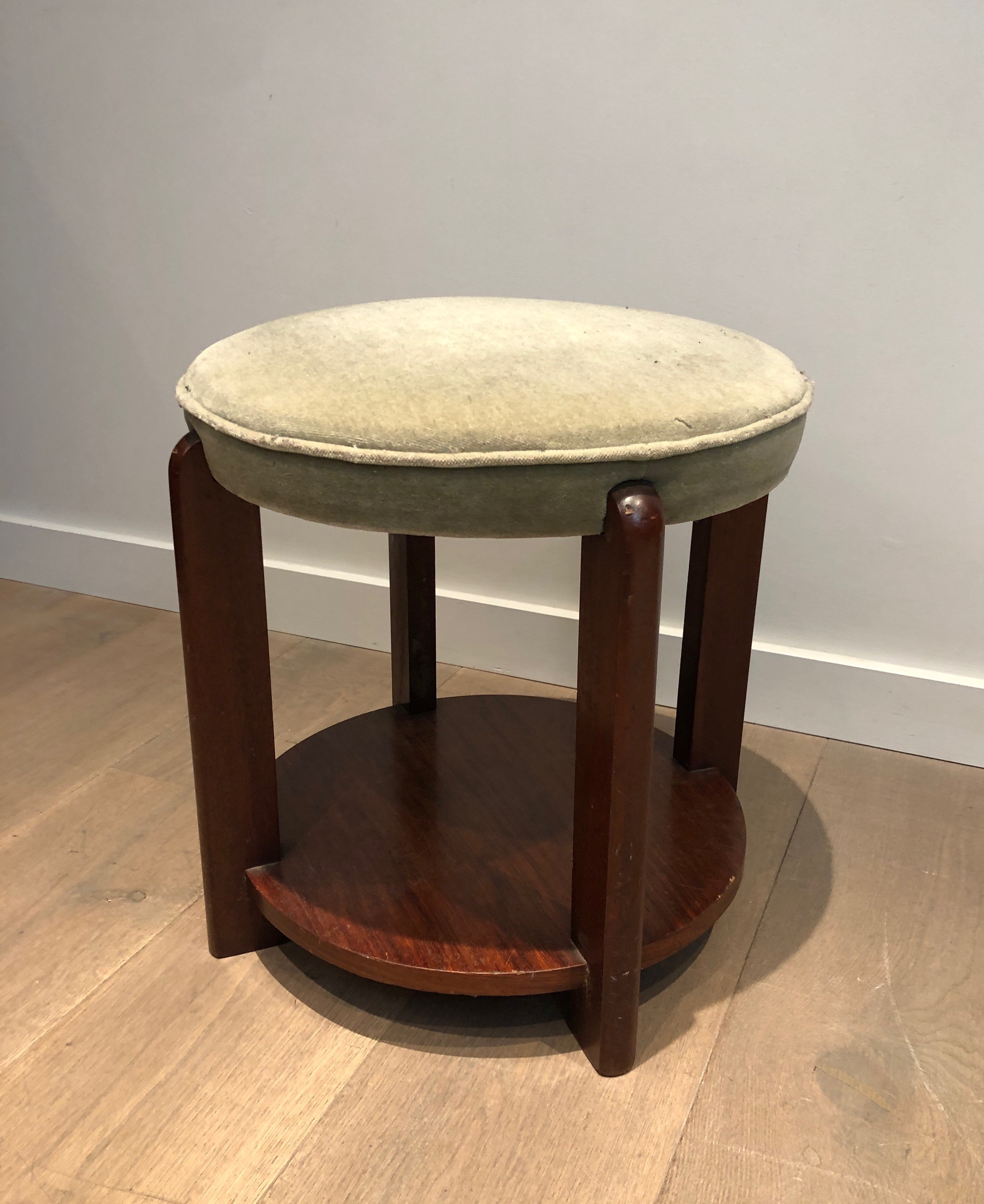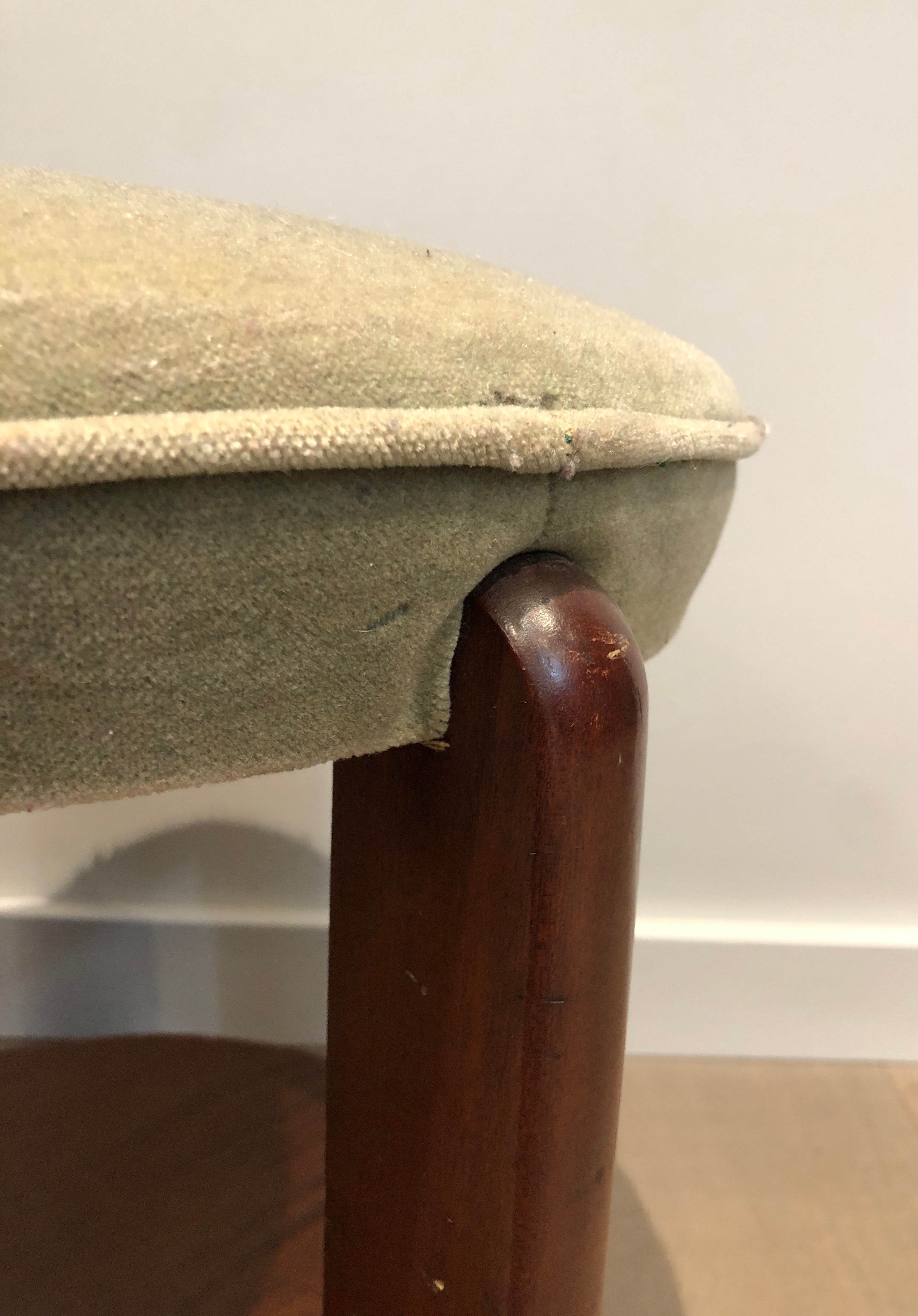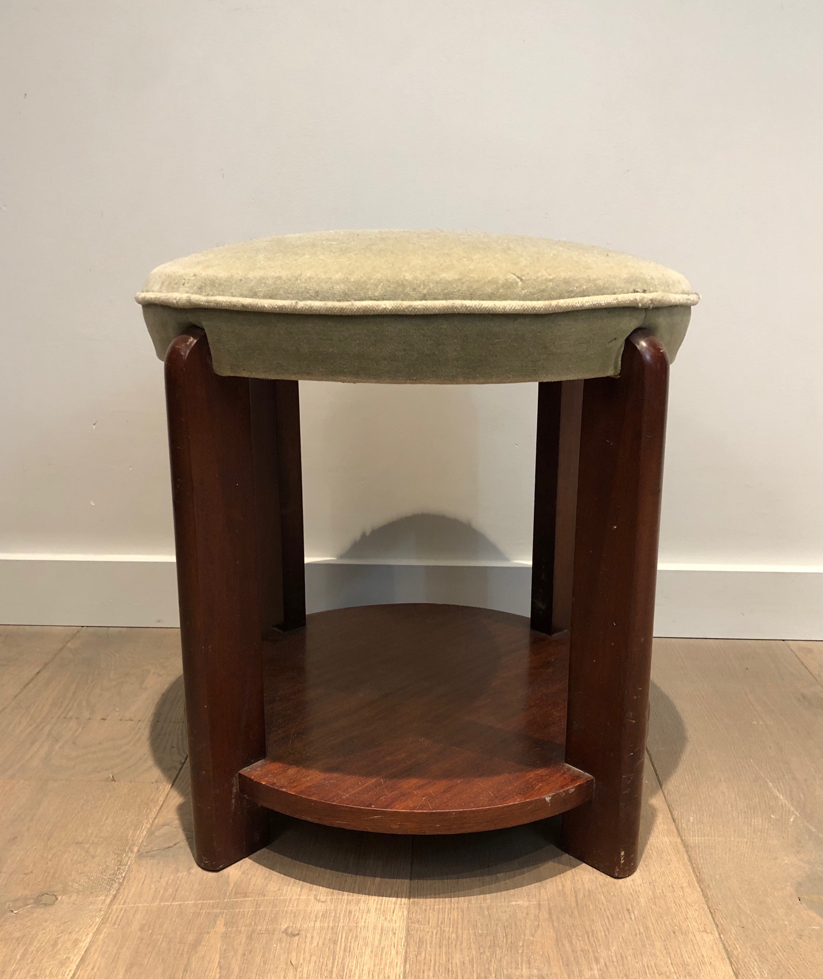 Presented in good condition consistent with its age, this mahogany and velvet stool is a versatile piece that would serve as a bedroom banquette, a sculptural accent, or a low side table in any interior. Its compact dimensions and period character make it equally well suited to a period apartment as to a contemporary setting seeking warmth and historical depth. Dimensions: 48 × 48 × 45 cm.