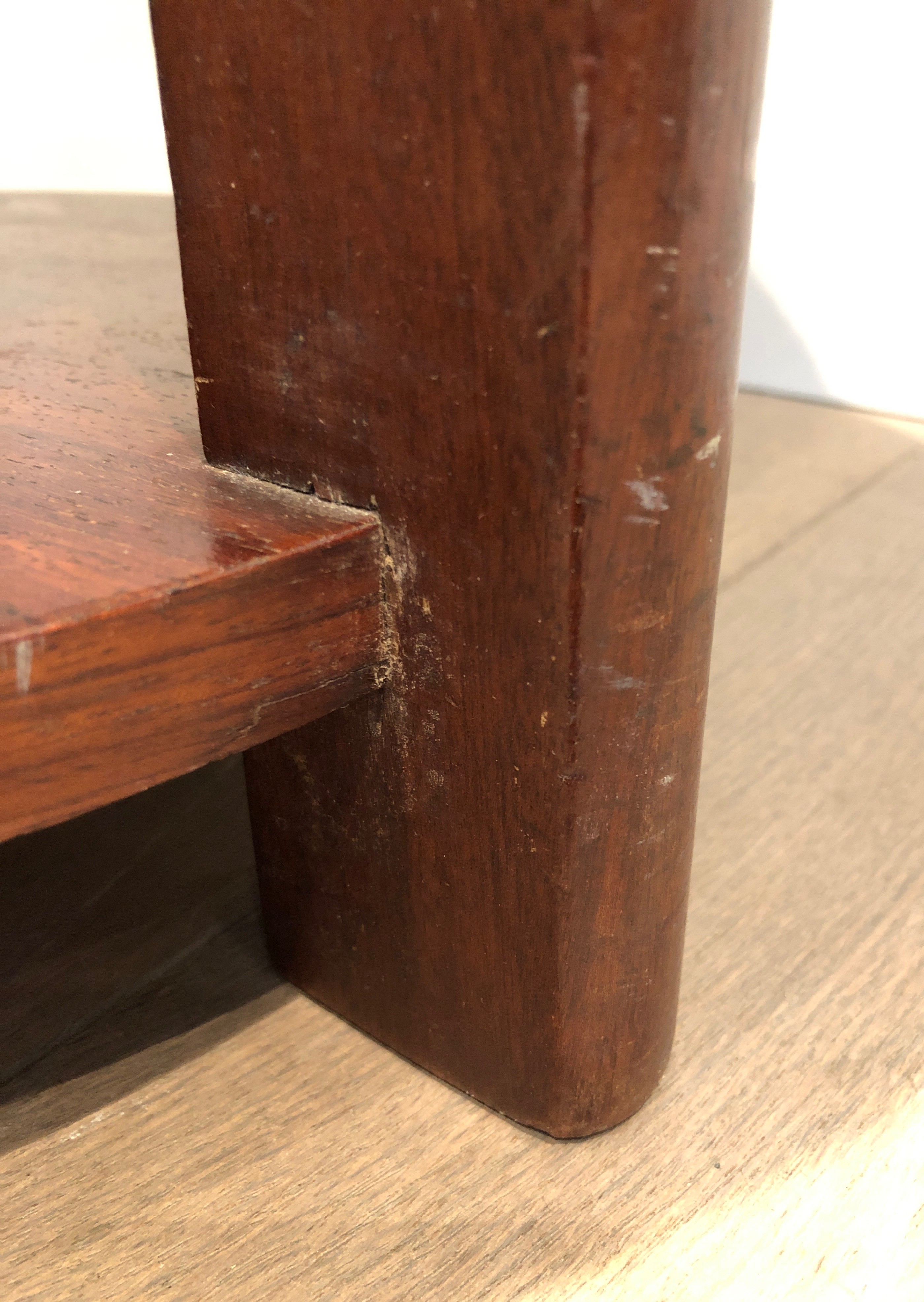This handsome example, circa 1970, takes the Art Déco vocabulary as its starting point. The frame is constructed in mahogany — that great wood of French furniture, rich in warm tones and tight in its grain, whose deep chestnut tones provide the ideal backdrop for the plush velvet of the seat. The square plan — 48 centimetres on each side — and the 45-centimetre height give the stool a satisfying weightiness, the feeling of an object that has been resolved rather than merely constructed: it sits on the floor with authority, inviting use.