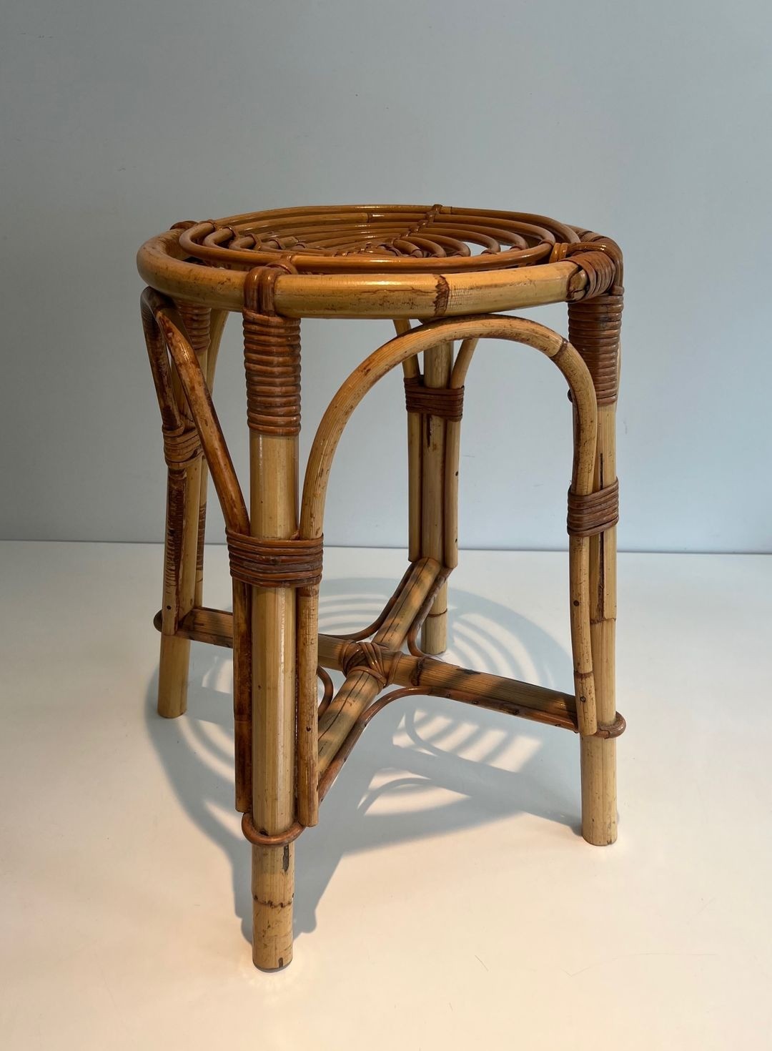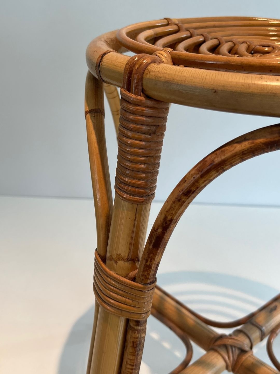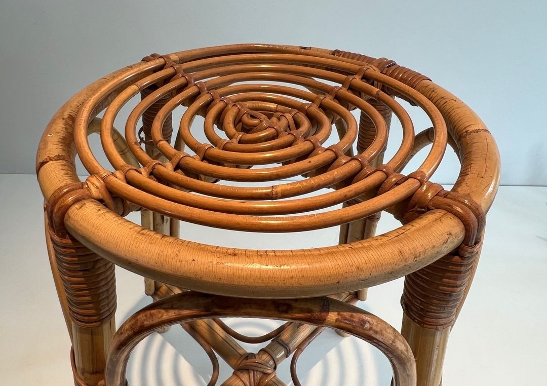 French rattan work of the 1940s and 1950s elevated the drum stool from a simple wicker form to a considered object of domestic design. The tight, even weave of this example — wound and structured to maintain the cylinder under load without deformation — reflects the expertise of the postwar period, when French ateliers specializing in rattan developed construction techniques that combined structural rigour with the lightness and warmth of the natural material. After more than seven decades, this drum stool retains both its form and its function, a testimony to the discipline of its making.