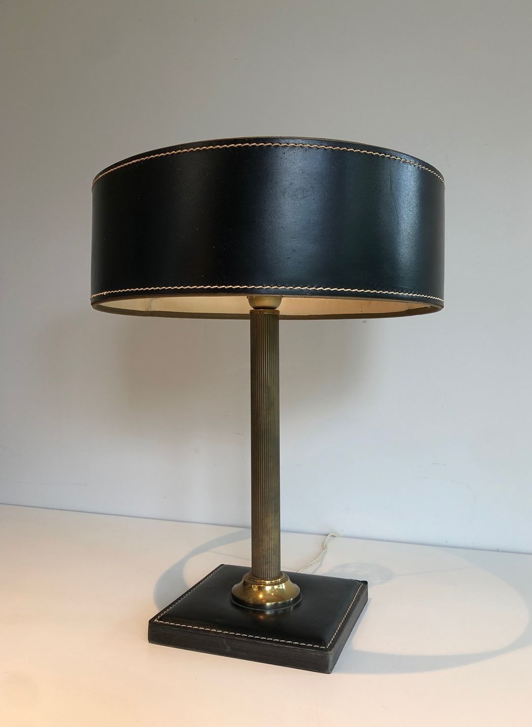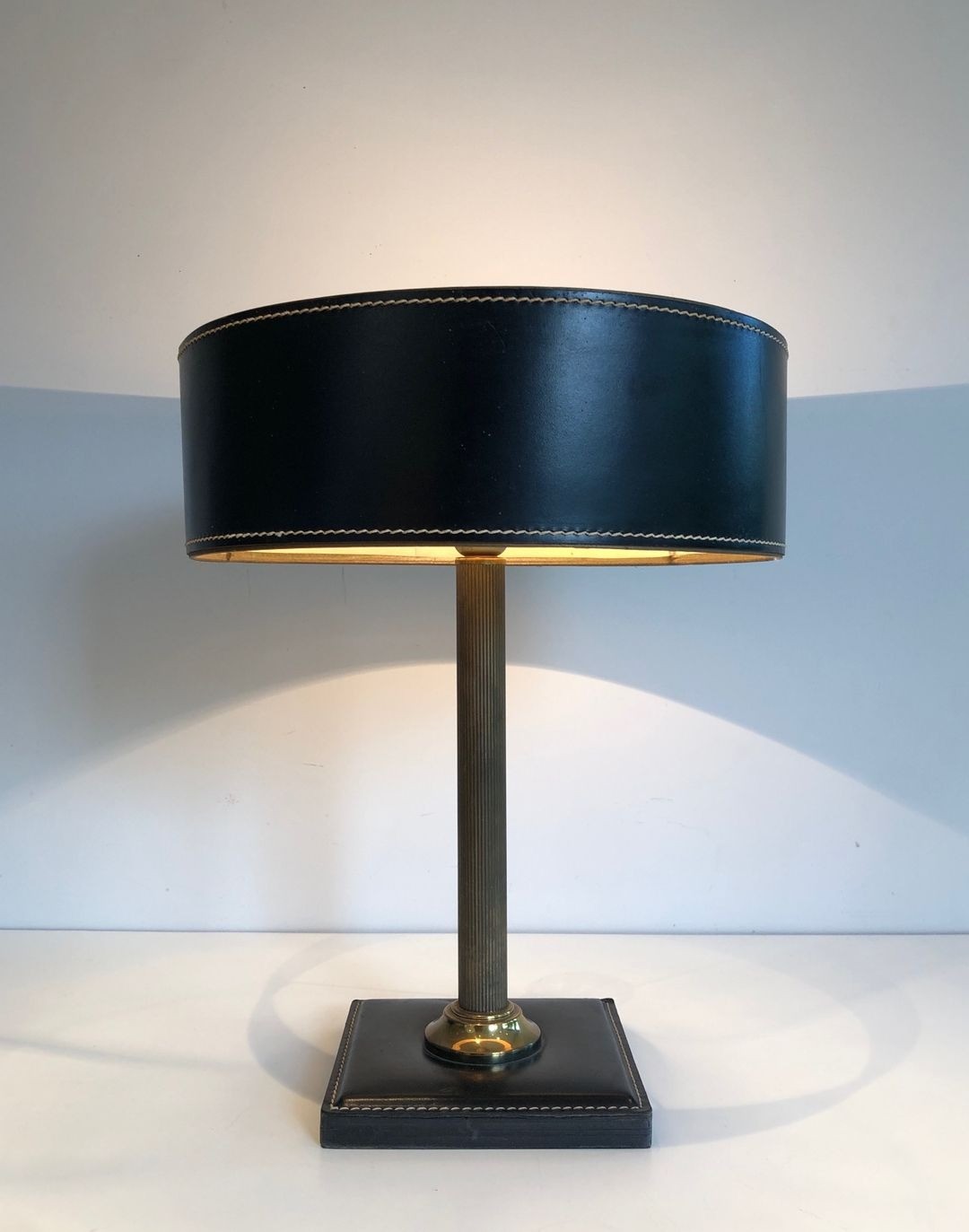 Working in the vocabulary of the Adnet studio, this lamp brings the same formal intelligence and material quality to any writing surface, whether a modernist steel-and-glass desk, a period bureau plat, or a simple contemporary table. Its black leather harmonises with surfaces of every colour, and its polished brass introduces a controlled warmth that prevents the composition from becoming severe. At 43.5 centimetres in height, it is ideally proportioned for a desk of standard height or a generous side table.