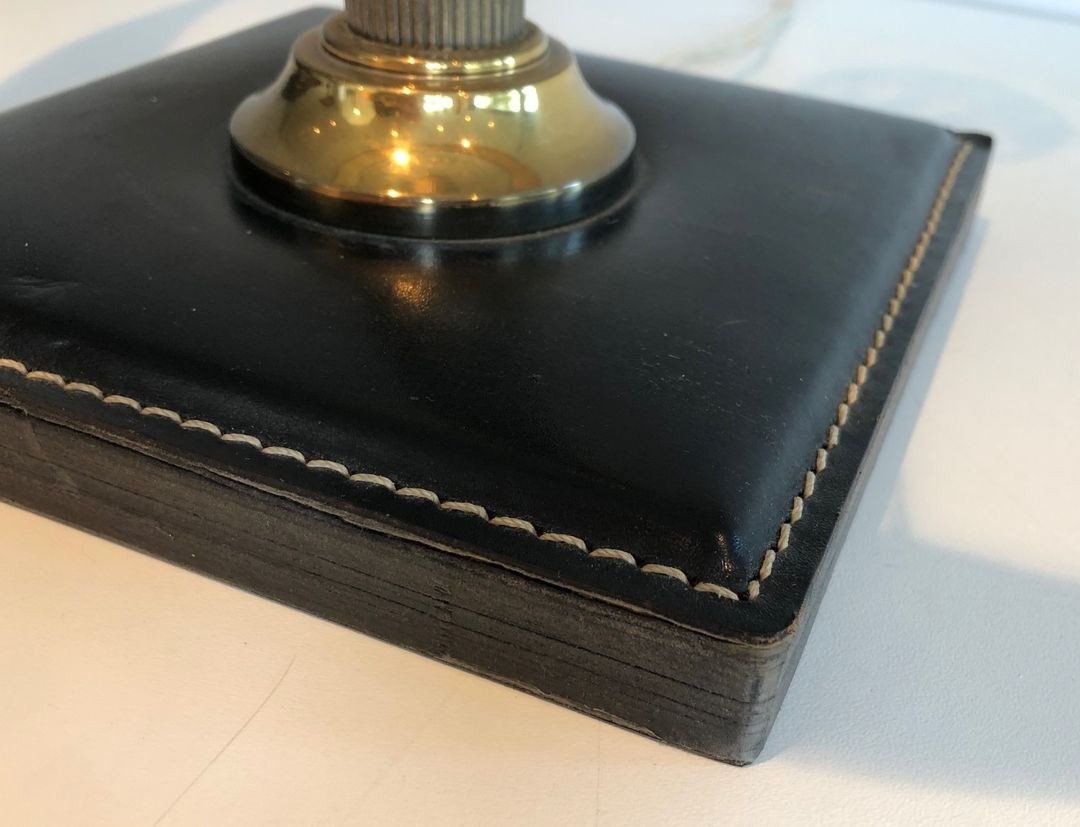 In the Adnet vocabulary, the desk lamp is perhaps the most intimate of all objects: sufficiently modest in scale to be encountered close-up and daily in the private ritual of reading or writing, yet sufficiently refined in its execution to reward that proximity with the pleasure of fine materials and exact craftsmanship. This example in black leather and polished brass exemplifies the two qualities that have made such lamps enduring objects of desire: the hand-sewn saddle-stitching that runs with absolute regularity across the surface of the hide, and the precision of the brass fittings — rings, tubes, and screws — that anchor the leather to its metal skeleton with a logic as clear and satisfying as a well-constructed sentence.