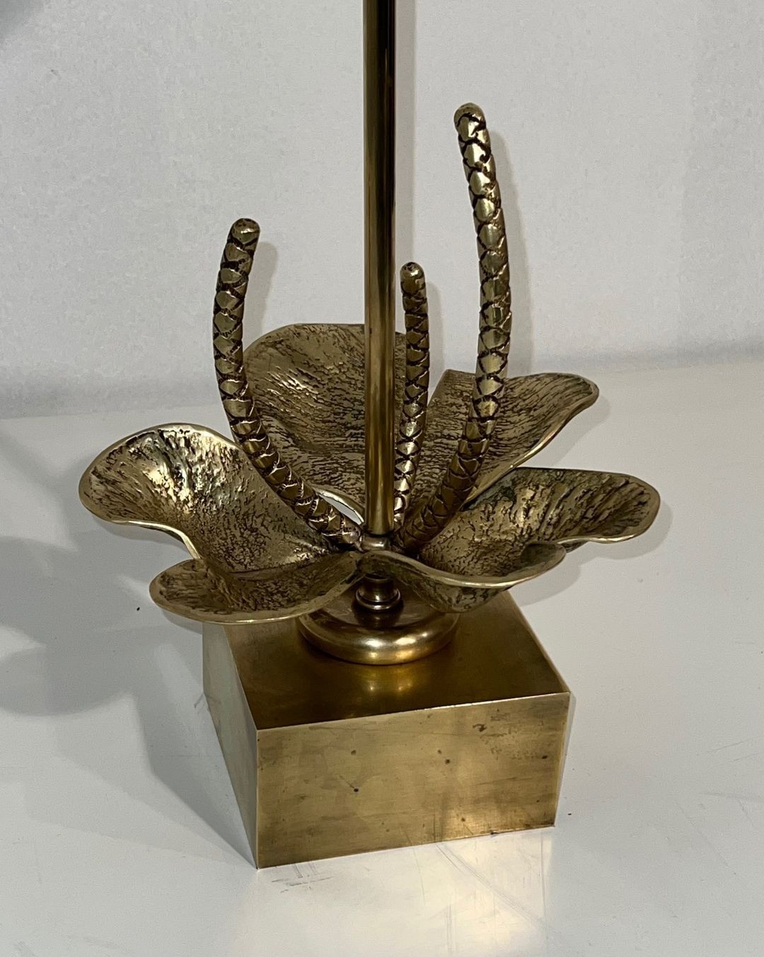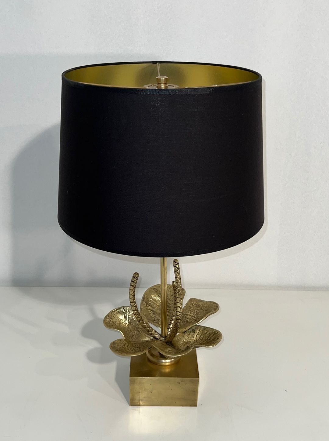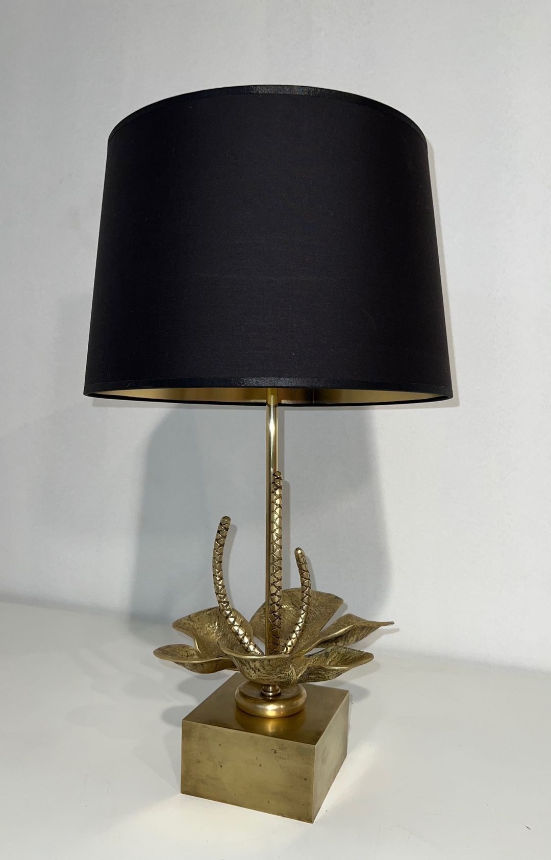 This elegant table lamp takes its form from the water lily — the nénuphar — a motif that became one of the signatures of the most accomplished Parisian bronze ateliers of the mid-twentieth century. Cast in bronze and finished in brass, the piece unfolds in layered petals from its base, rising to sixty centimetres with a perfectly balanced footprint of thirty centimetres. The interplay of materials — the warm glow of polished brass against the cooler depth of patinated bronze — creates a quietly luminous object that seems to draw light into itself even when unlit.