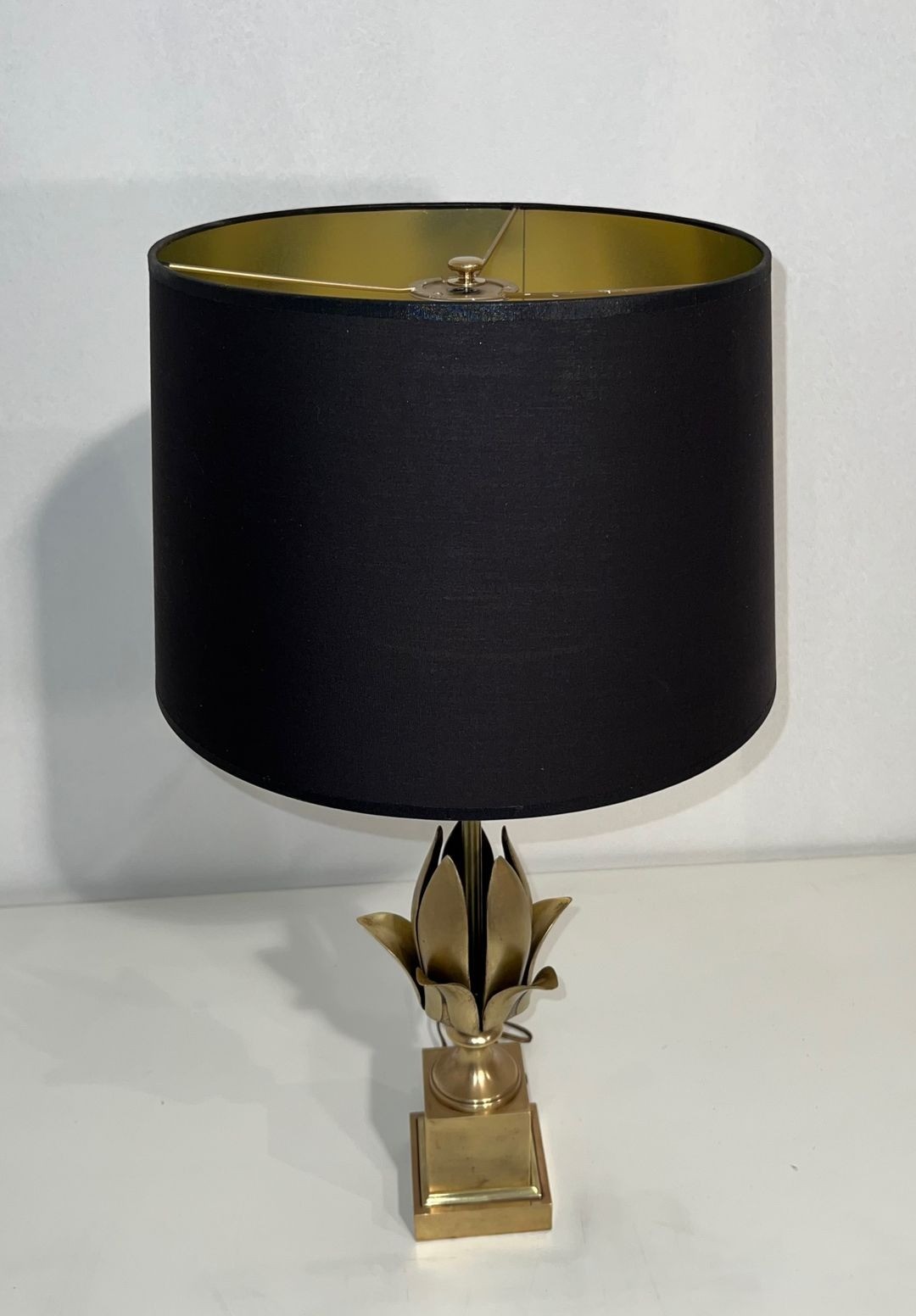 This brass table lamp, fashioned in the form of a stylised flower, belongs to the decorative current that Maison Charles made famous in postwar Paris — a sculptural approach to lighting in which the natural world provides both form and feeling. Cast and worked entirely in brass, the piece achieves an unusual unity of surface: without the contrast of a second metal, it glows as a single, monochromatic body, its sixty-four-centimetre height unfolding from a base of thirty centimetres in a graduated bloom that recalls both the garden and the atelier.