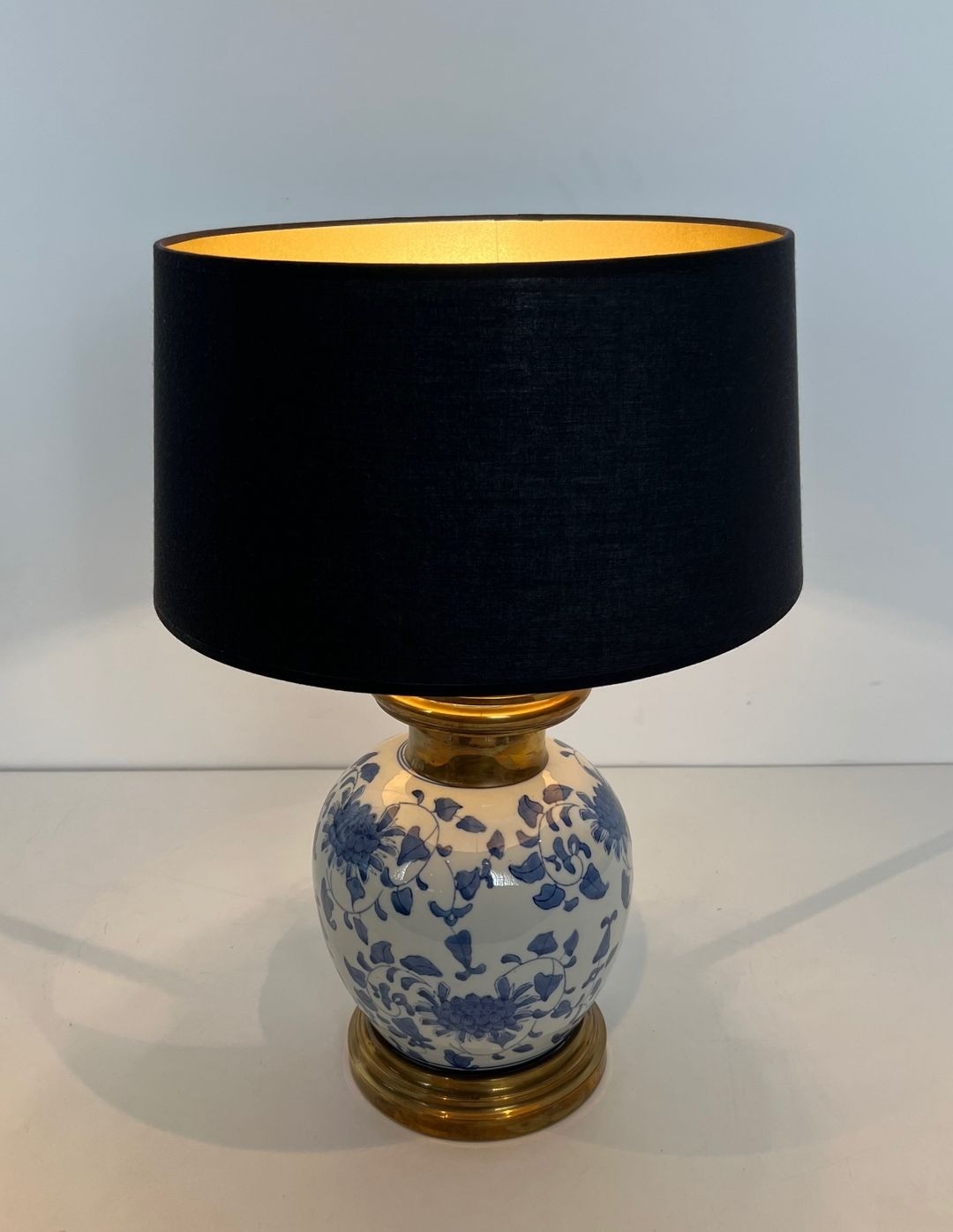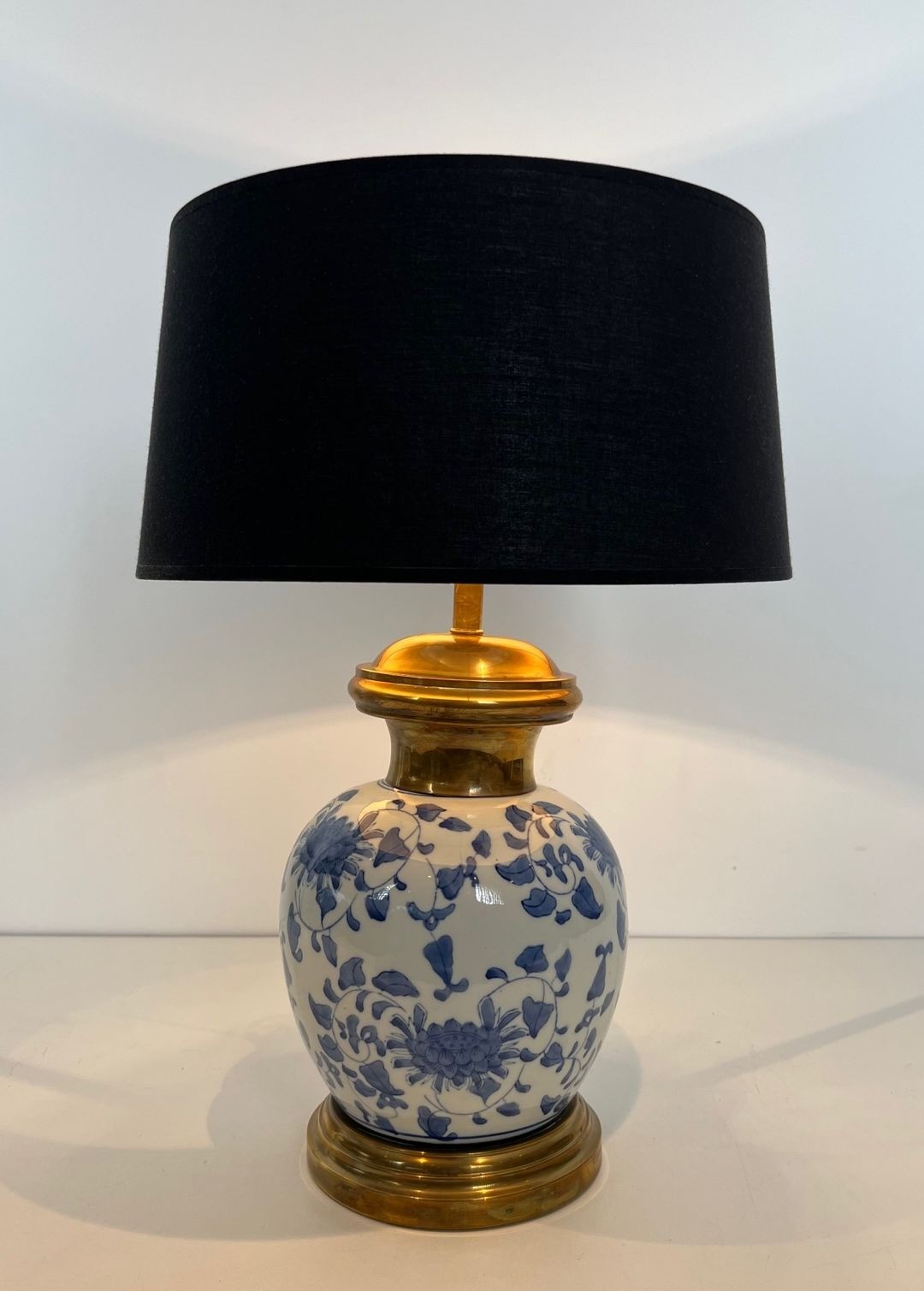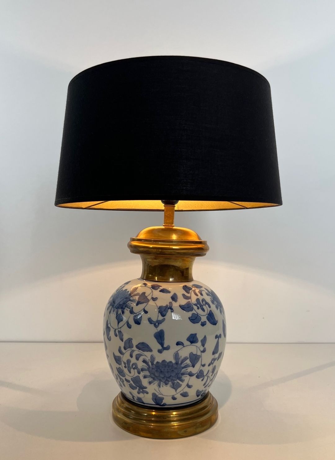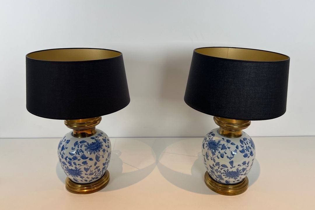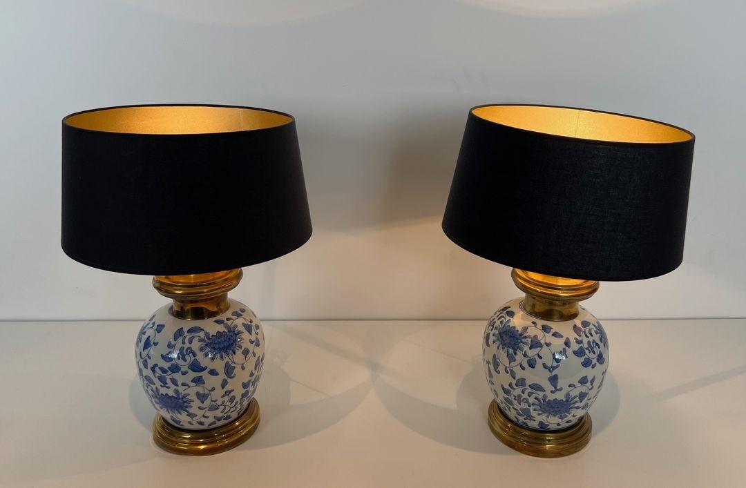 This elegant pair of table lamps combines blue and white porcelain bodies, decorated in the chinoiserie manner, with brass mounts of refined simplicity. Each lamp rises to fifty-nine centimetres — a generous scale for a pair — with the porcelain bodies occupying the dominant register of the composition and the brass fittings providing a warm metallic counterpoint. The blue and white palette, with its reserves of foliate and figurative motifs drawn from the Chinese decorative repertoire, brings a note of refined exoticism that has been prized in European interiors since the seventeenth century.
