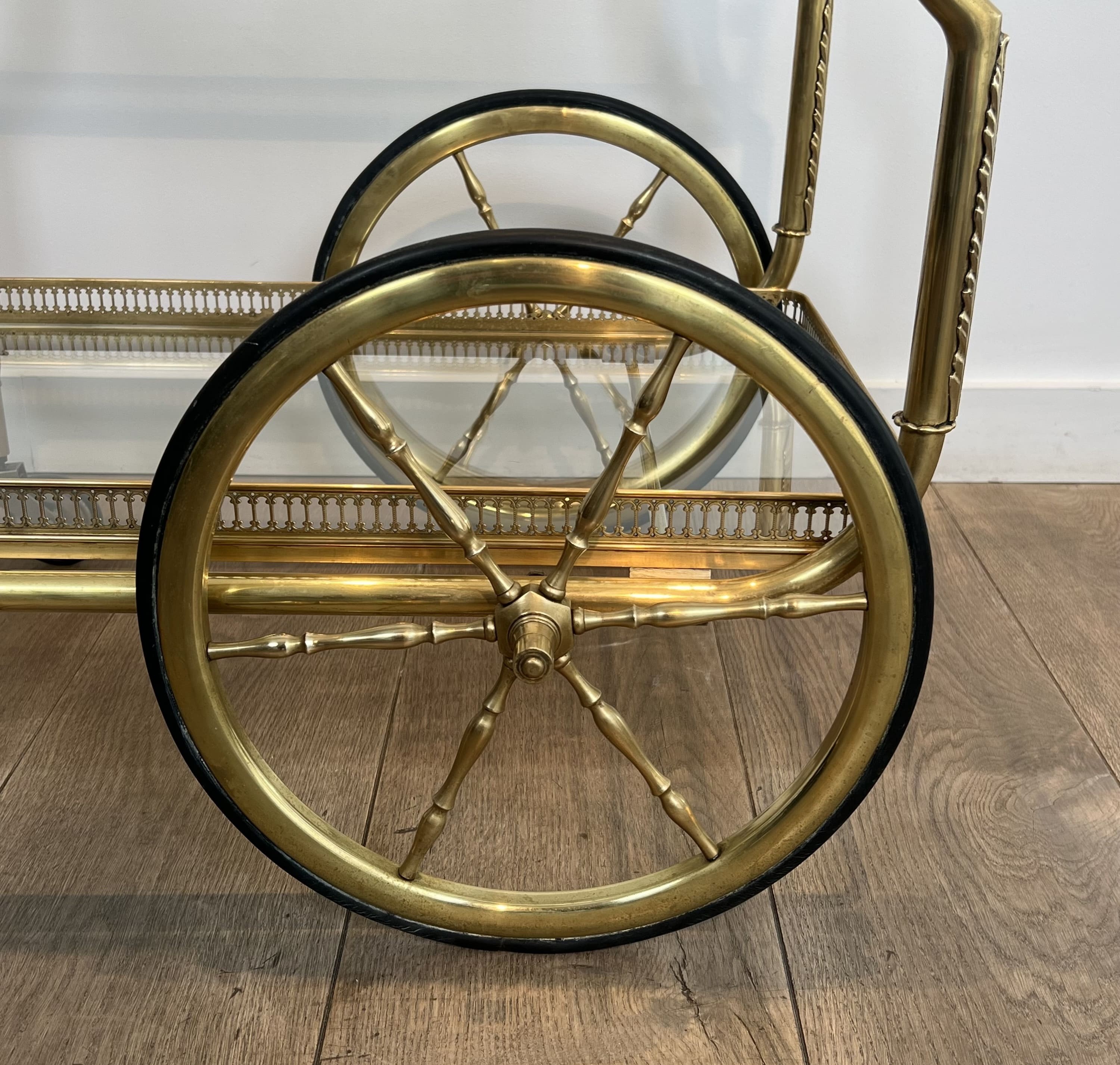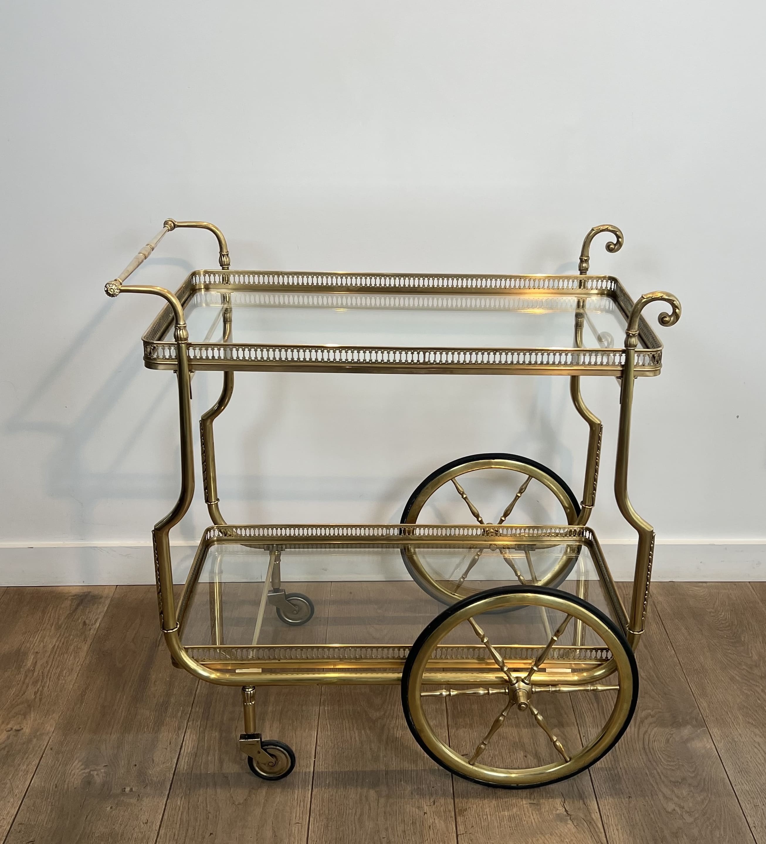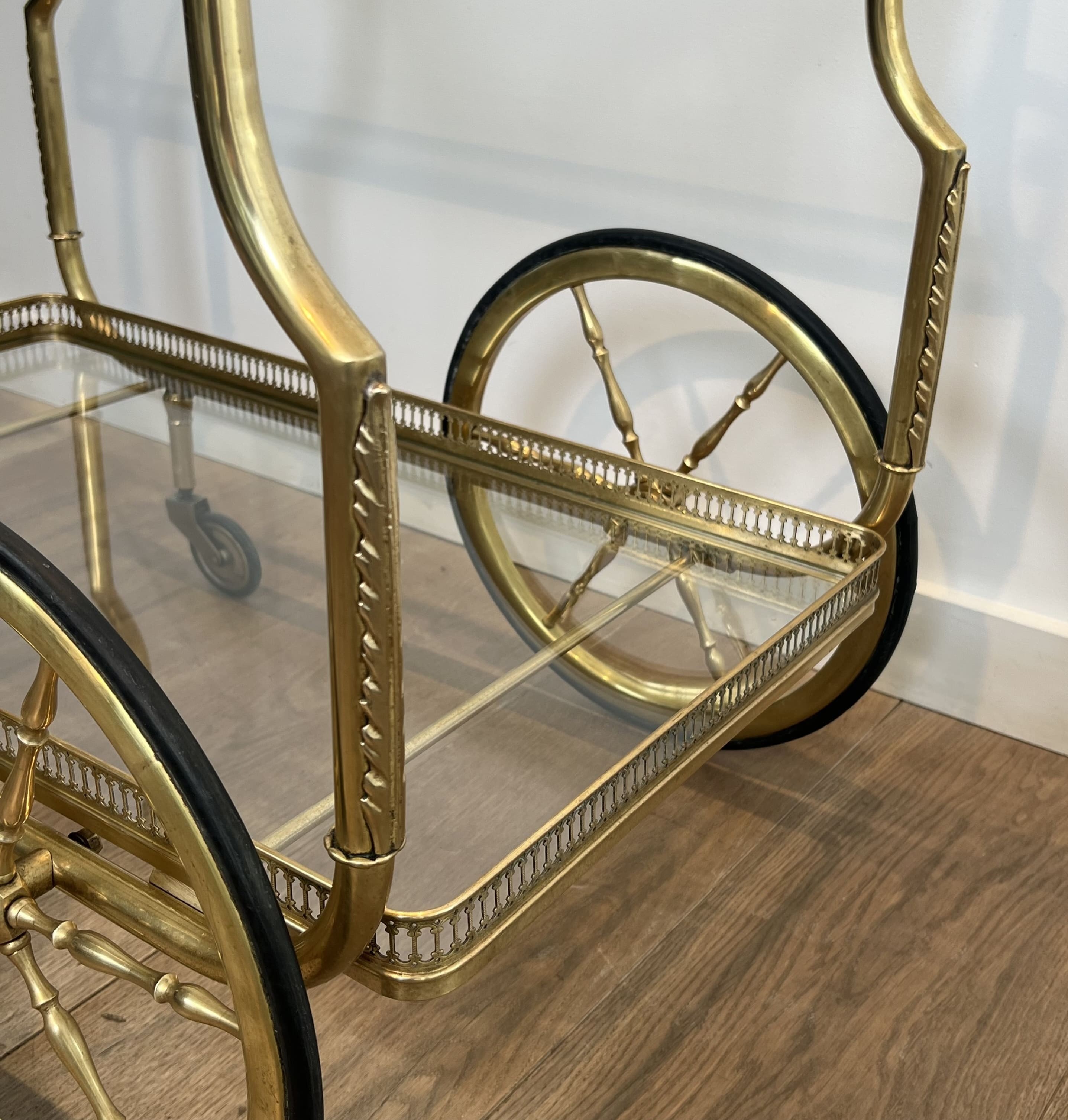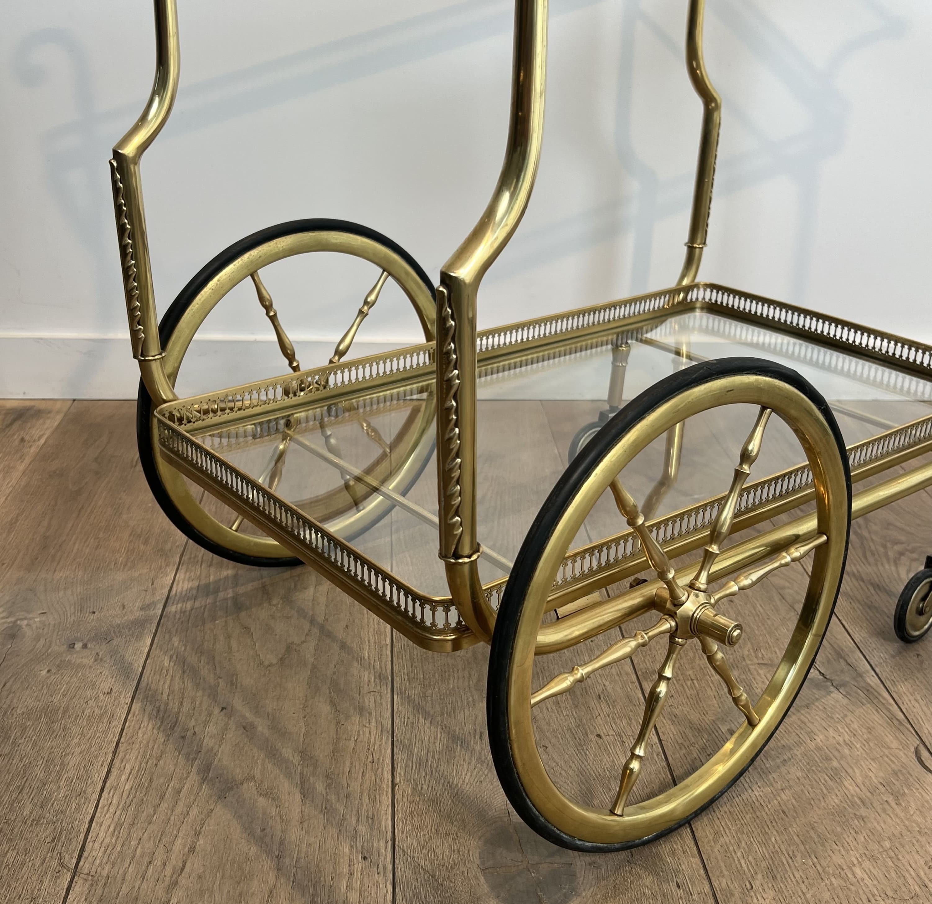 This rolling table is a representative creation of mid-20th-century Parisian high-end occasional furniture ("mobilier volant"). The structural design revolves around a solid brass chassis. The four main uprights adopt a sinuous, curved profile, conferring visual lightness to the piece. The mobility of the furniture is ensured by an asymmetrical system: the front rests on small pivoting directional casters, while the rear is equipped with two large spoked wheels fitted with rubber tires. The cart features two rectangular clear glass trays with rounded corners, rigorously held by pierced brass galleries. The cart is steered via a lateral handle incorporating a textured central sleeve (lucite or glass) terminating in rosettes.