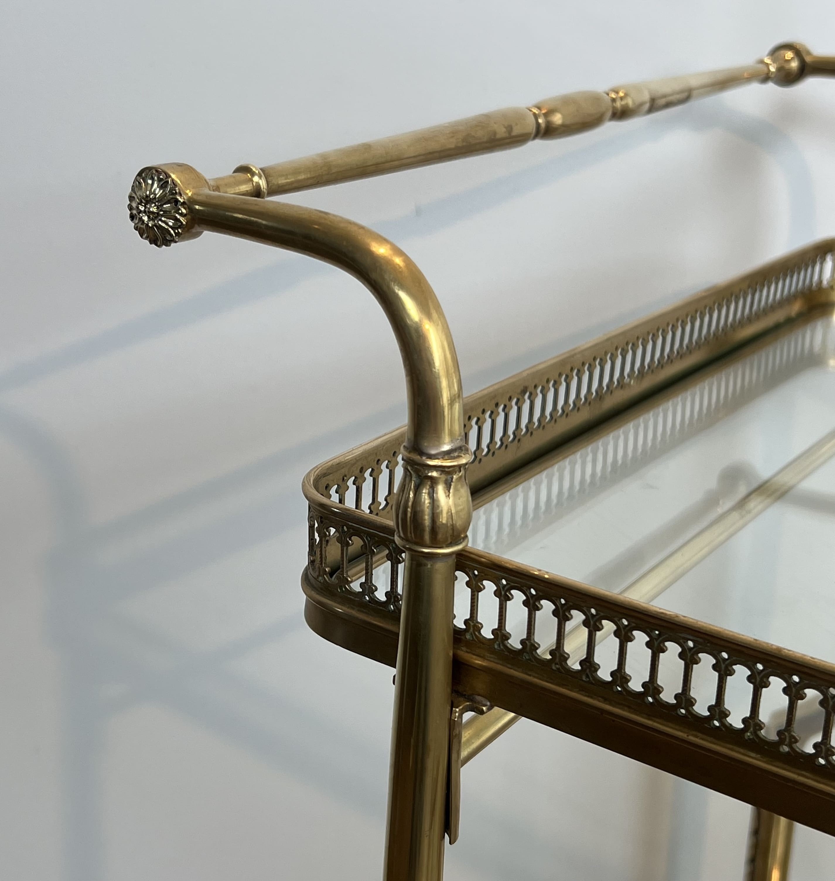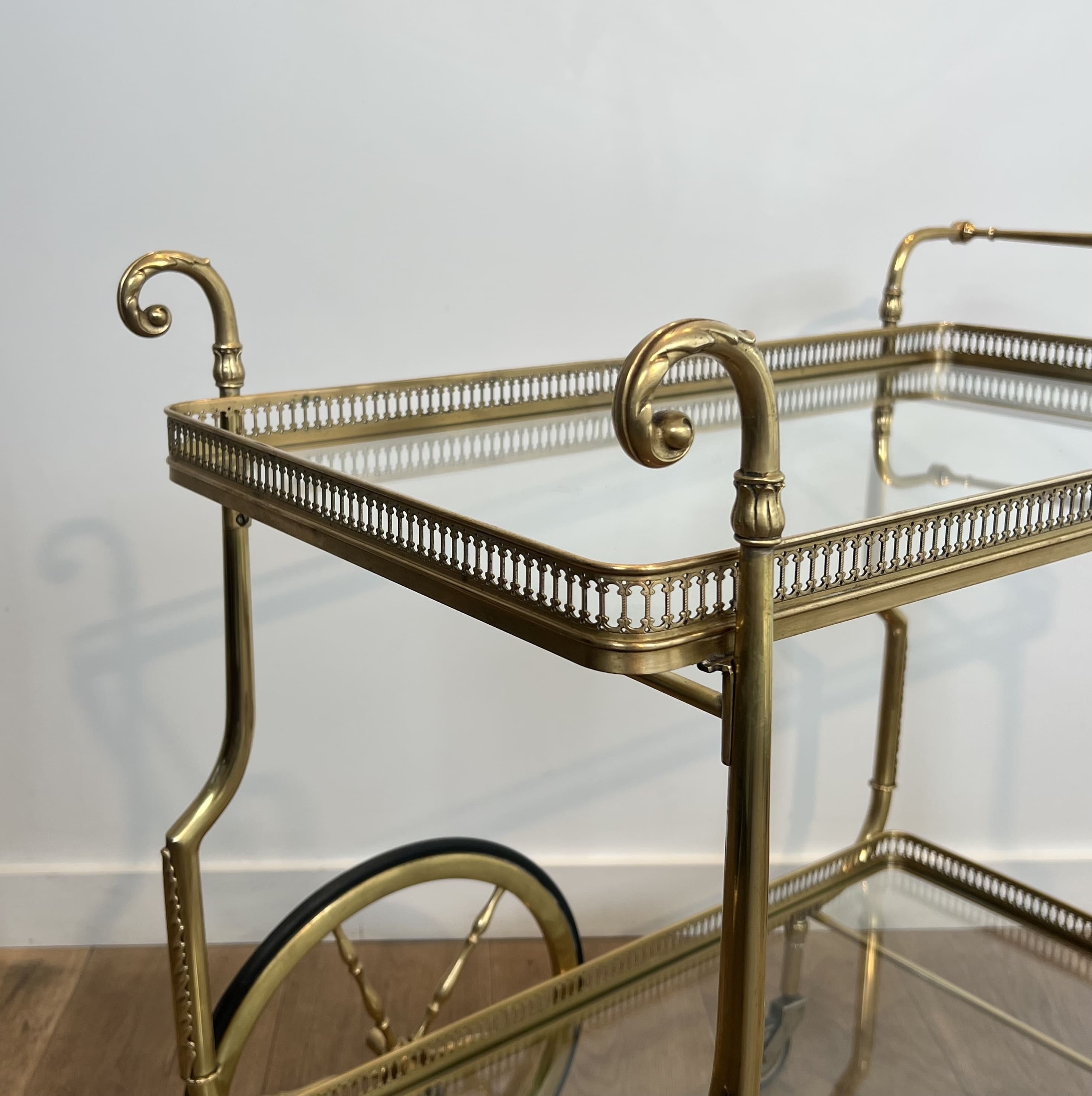 Neoclassical style two-tier serving table (bar cart). Solid profiled brass structure, pierced galleries, and clear glass tiers. Asymmetrical base equipped with two large spoked wheels at the rear and two directional casters at the front. French craftsmanship by Maison Jansen. Dimensions: Width (Length): 77 cm | Depth: 59 cm | Height: 80 cm.