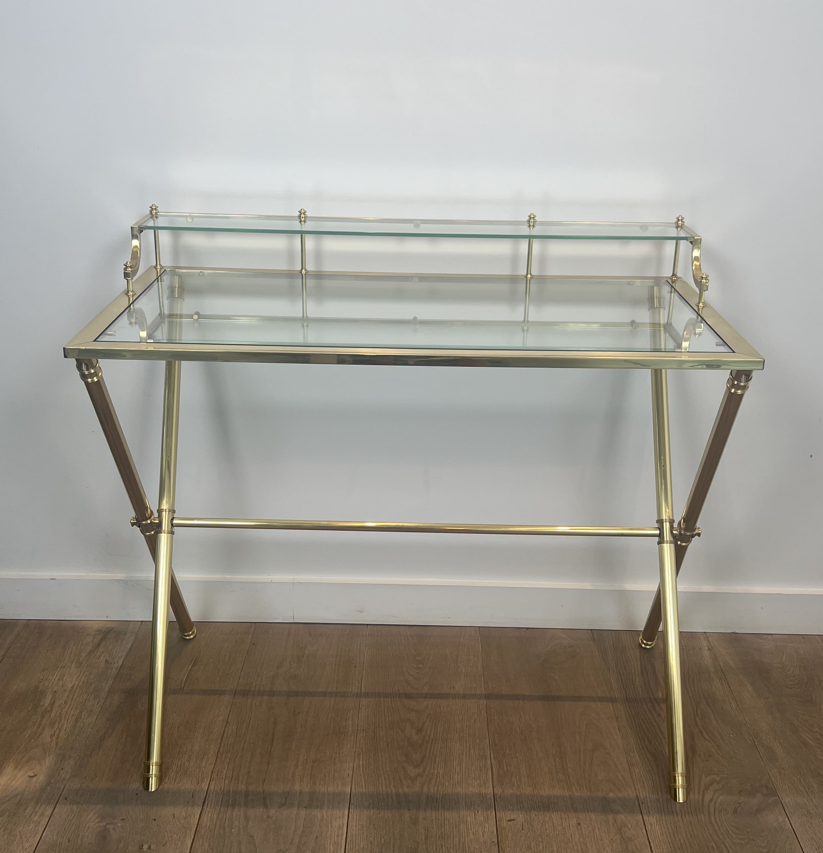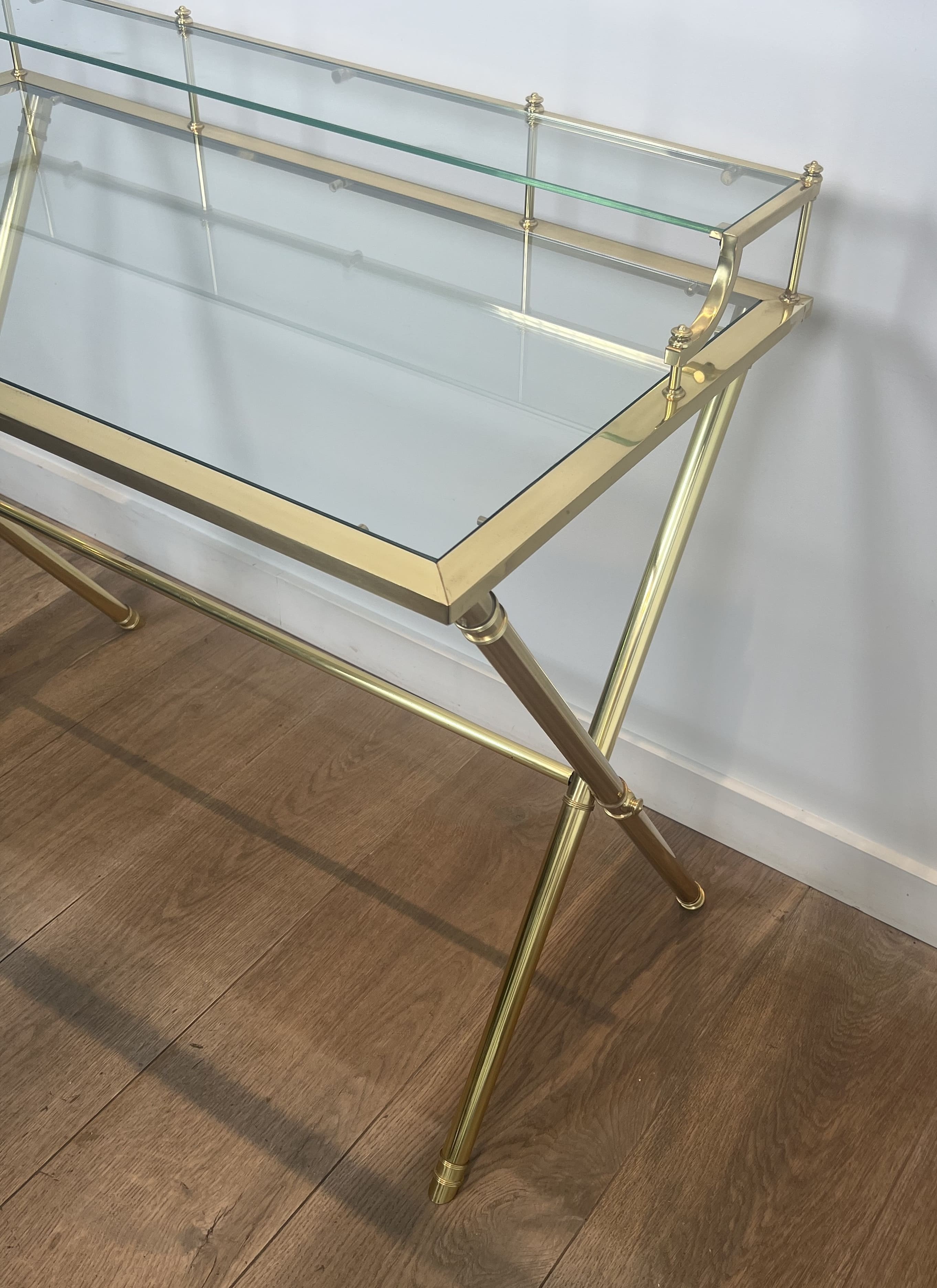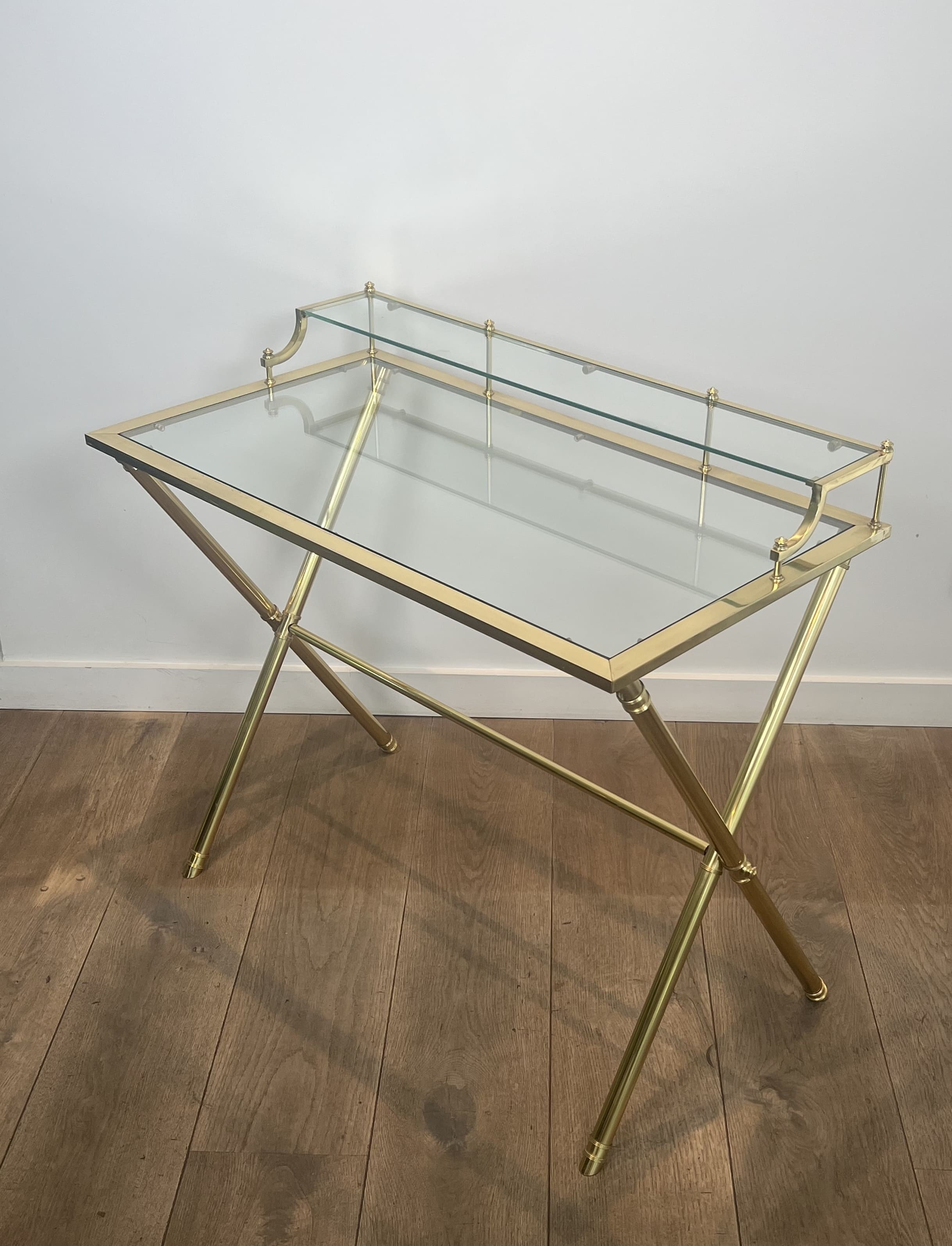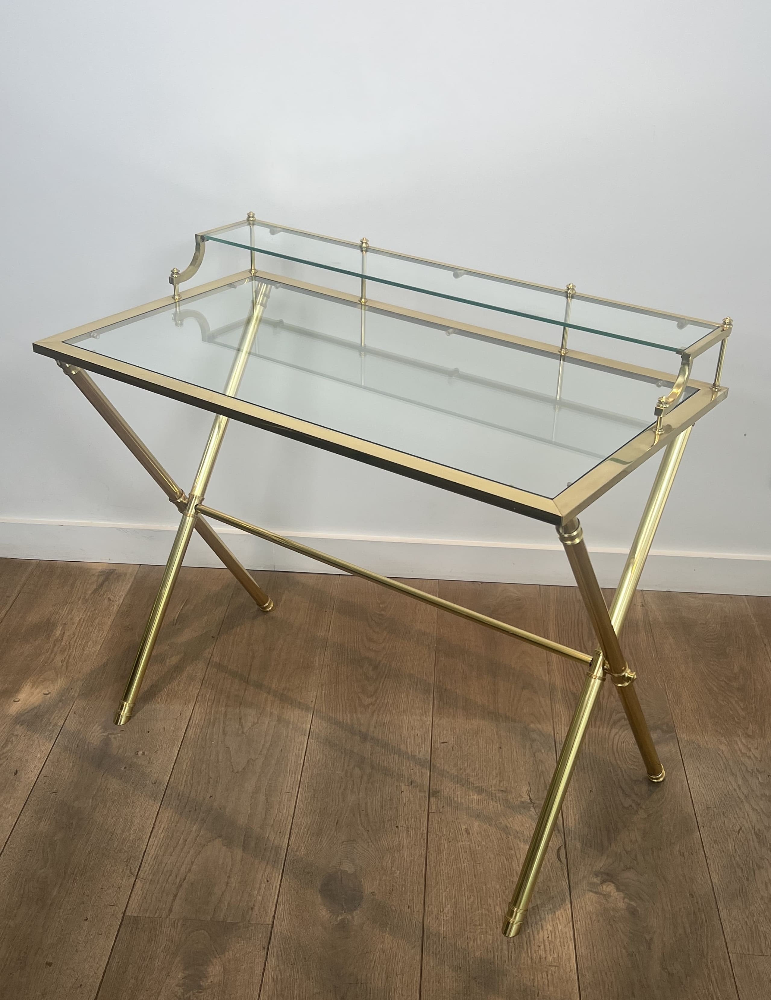 Elegant architectural occasional desk. Solid polished brass structure forming a curule ("X" shaped) base. The main writing surface is surmounted by a rear "gradin" (raised shelf), both holding clear glass plates. Attributed to Maison Jansen (Paris). Dimensions: Width: 90 cm | Depth: 50 cm | Desk Height: 73 cm | Maximum Height: 82 cm.